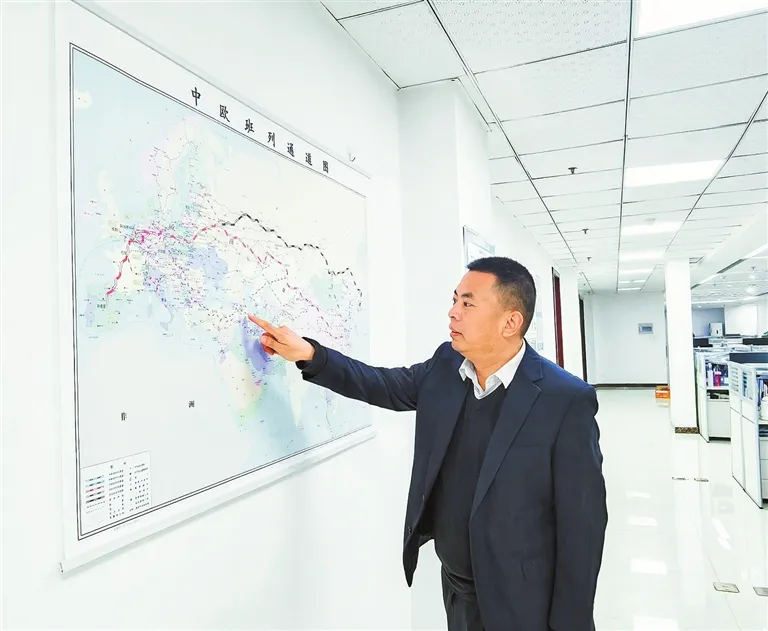 中豫港务集团郑州陆港公司铁路操作部部长张永恩正在介绍河南中欧班列运行线路。