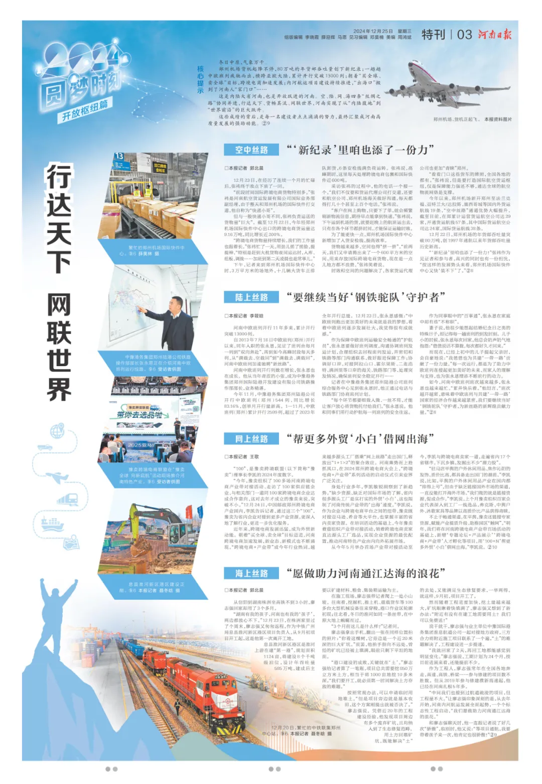 郑州机场货机起降不停,80万吨的年货邮吞吐量创下新纪录;一趟趟中欧班列疾驰而出,横跨亚欧大陆,累计开行突破13000列;朝着“买全球、卖全球”目标,跨境电商加速发展;内河航运项目建设持续推进,“出海口”搬到了河南人“家门口”……