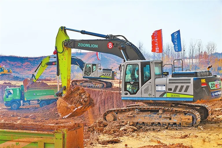 在施工现场,廖志强带记者爬上一处小山坡。往南看,挖掘机、推土机、重载货车等100多台大型机械设备往来穿梭,港口作业区轮廓初现;往北看,冬日的淮河如同一条丝带,在中原大地上蜿蜒而过。
