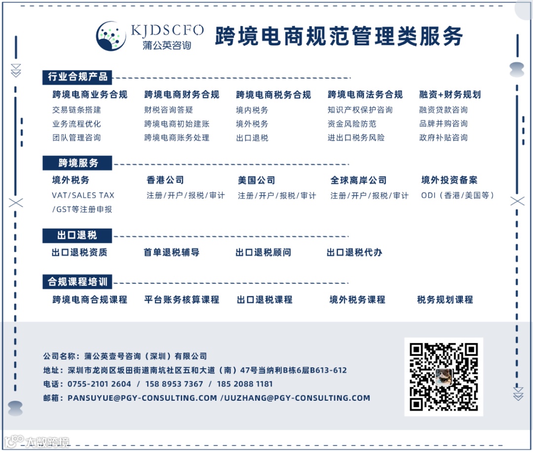 KJDSCFO蒲公英壹号咨询(深圳)有限公司助力跨境电商企业高速、安稳、长远的发展。汇集跨境电商运营/财务/税务总监等行业专家,携手国内外会计师、律师事务所,专注跨境合规服务,包含业财合规、架构设计、培训咨询、出口退税、境内外财税、政府补贴申请等。