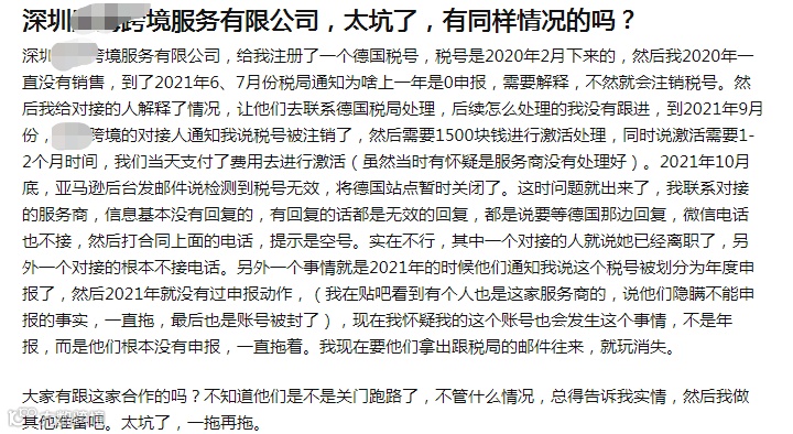 前段时间跨境圈有媒体曝出“某某税代跑路”的消息,危及到上千个卖家店铺,涉及税金近万亿,目前在各大论坛社群,都能看到受害卖家的发帖。