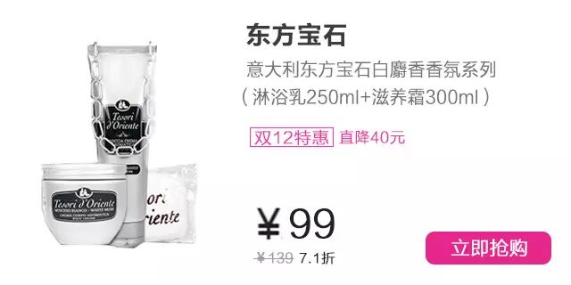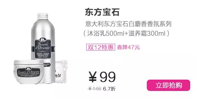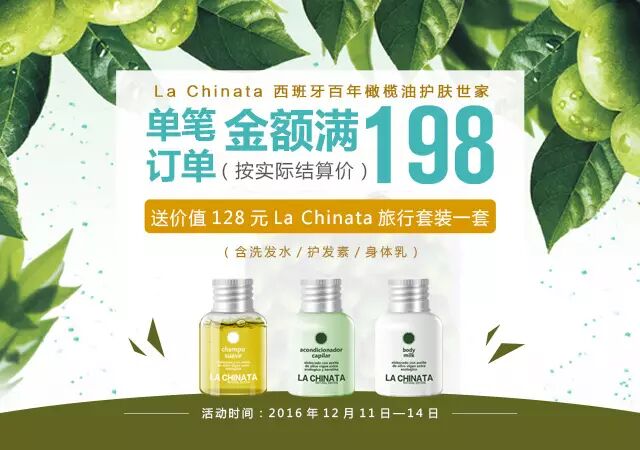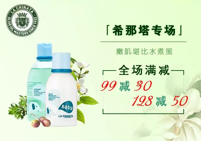 La Chinata始创于1932年,极致经典,来自西班牙的橄榄油护肤专家。双十二期间,LaChinata专场下单满99减30,满128减50,单笔订单金额满198元还送价值128元旅行套装。疯狂双十二,错过再等一年,爱美的姑娘们点击图片好货直接屯。