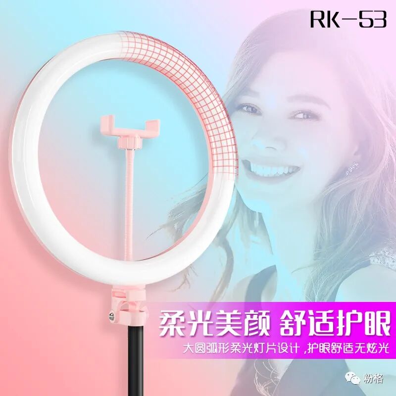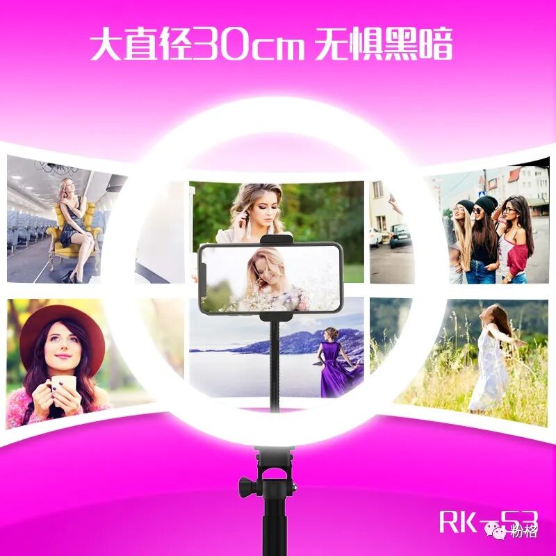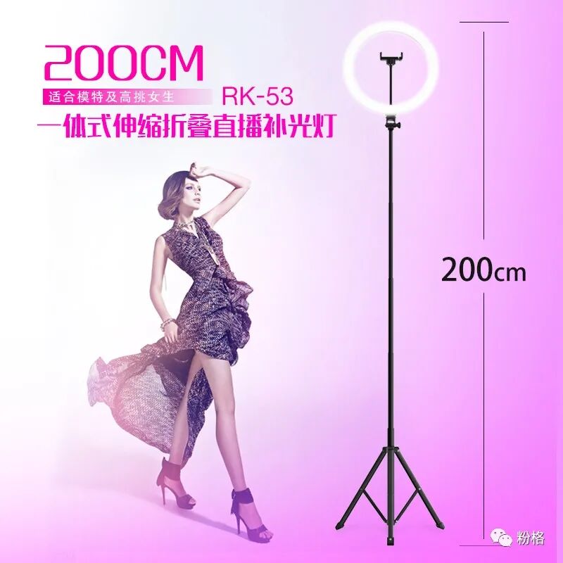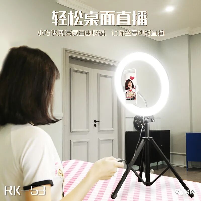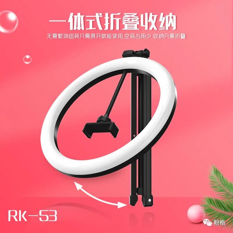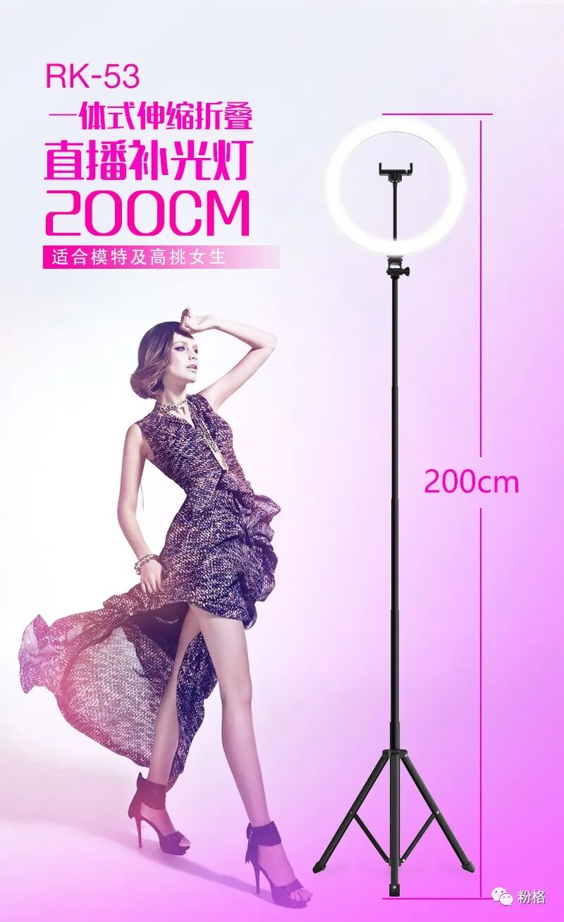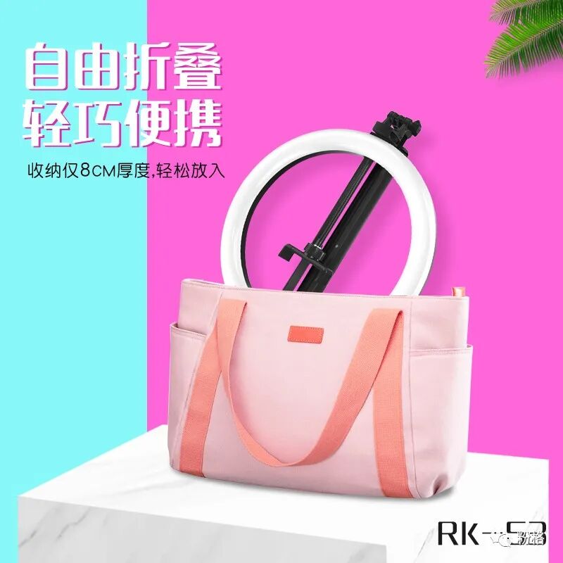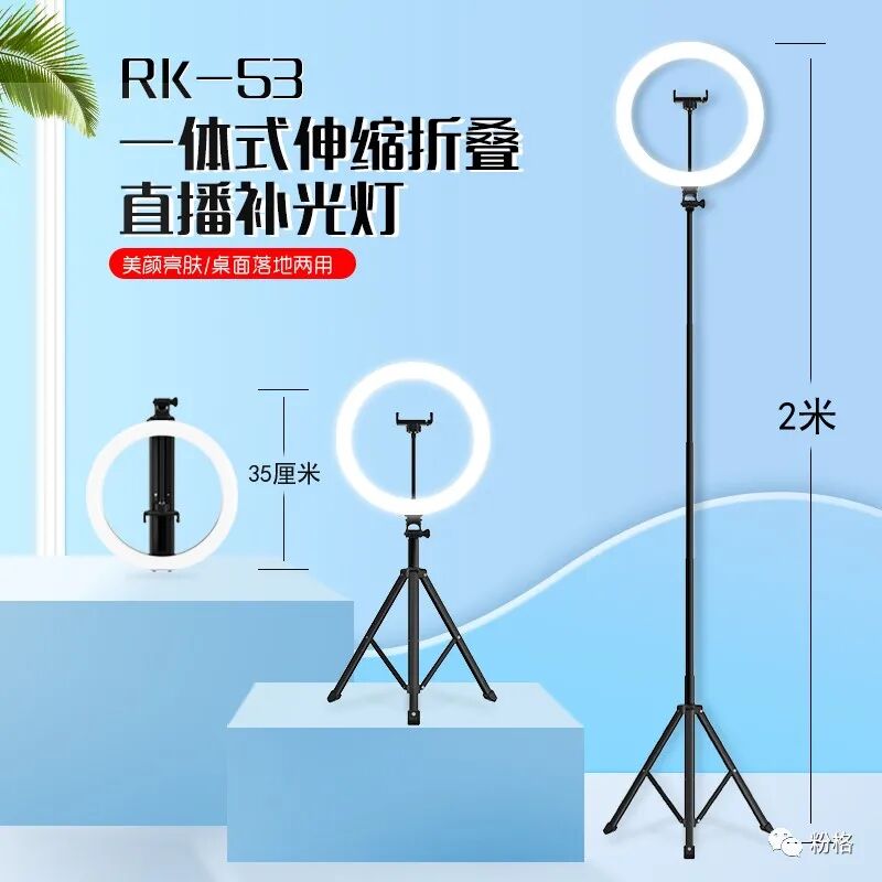 直播灯要折叠、要迷你、我们还要“稳”。12寸直径30厘米一体式伸缩折叠大光圈直播灯RK53“她”来了!一体式无需拆卸繁杂安装步骤,可自由伸缩高度,可桌面落地双用,折叠时仅为35厘米长度,伸展时高度可达2米(此高度可适用模特及高挑女神),三角架中心点重心支撑让直播时更“稳”!大圆弧形柔光灯片设计让你直播美颜亮肤,创新型实用专利为销售保驾护航,实惠的价格让使用人群更加广泛。这么一款拥有“高”“稳”“小”“实用”“创新”等众多优点又实惠的折叠伸缩直播灯,她必将成为你直播的吸粉利器!