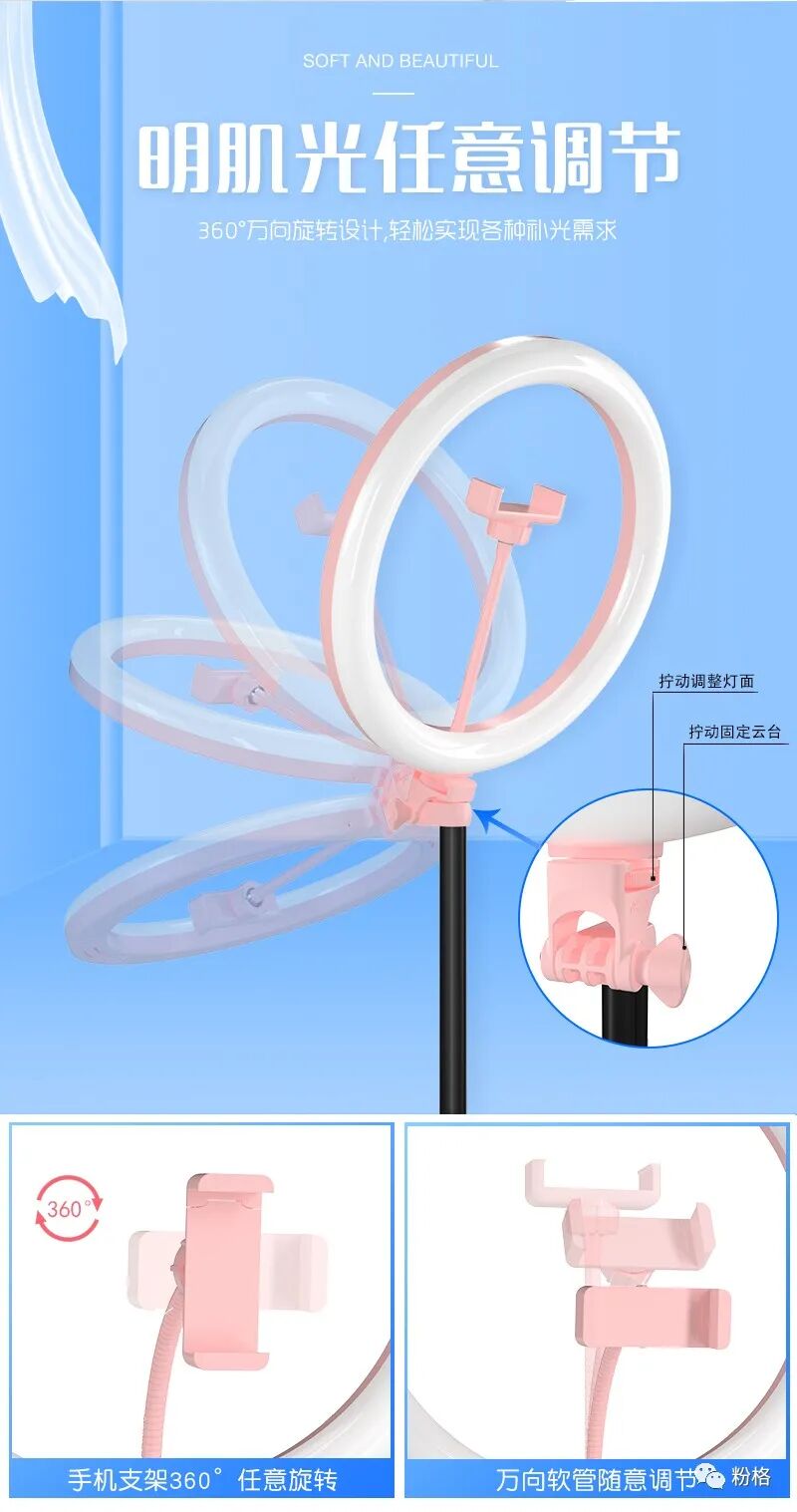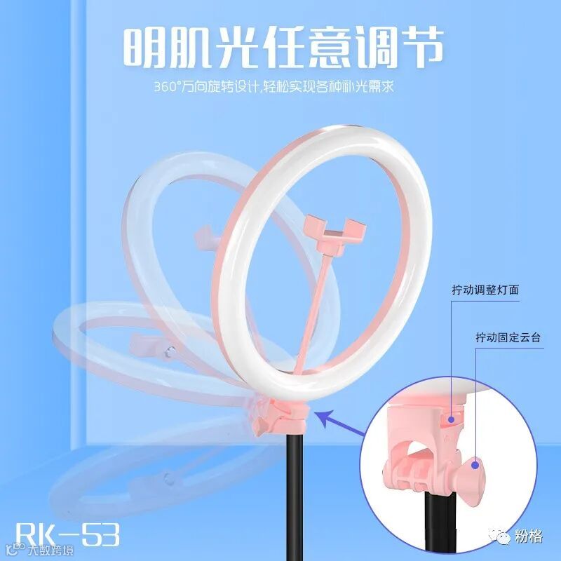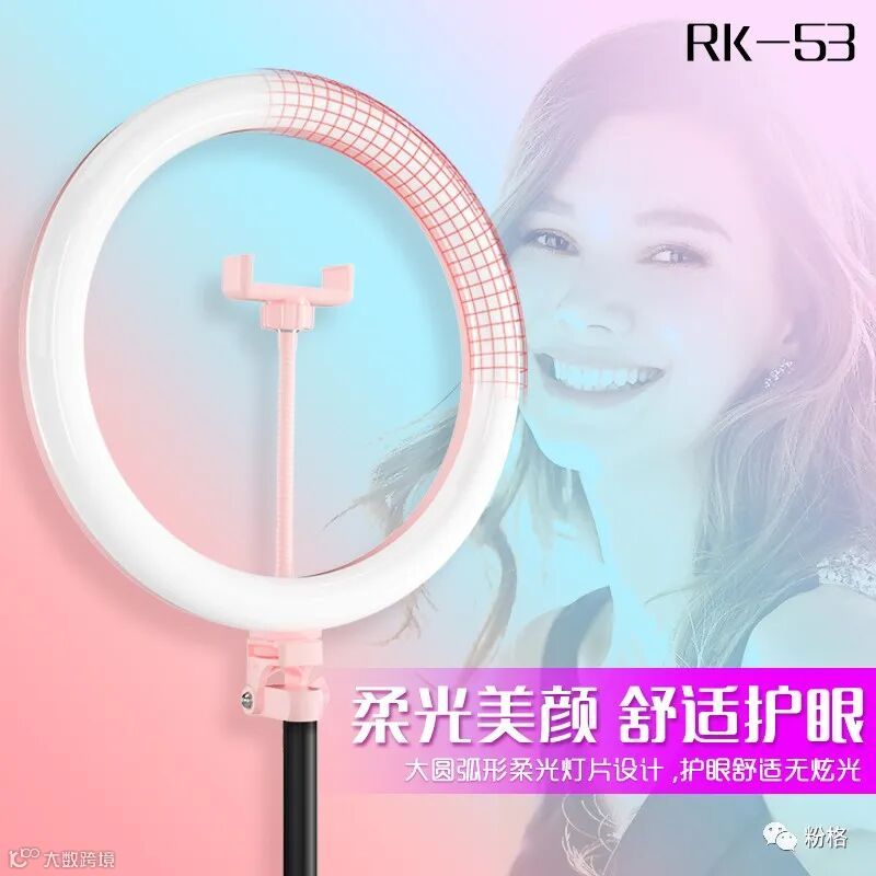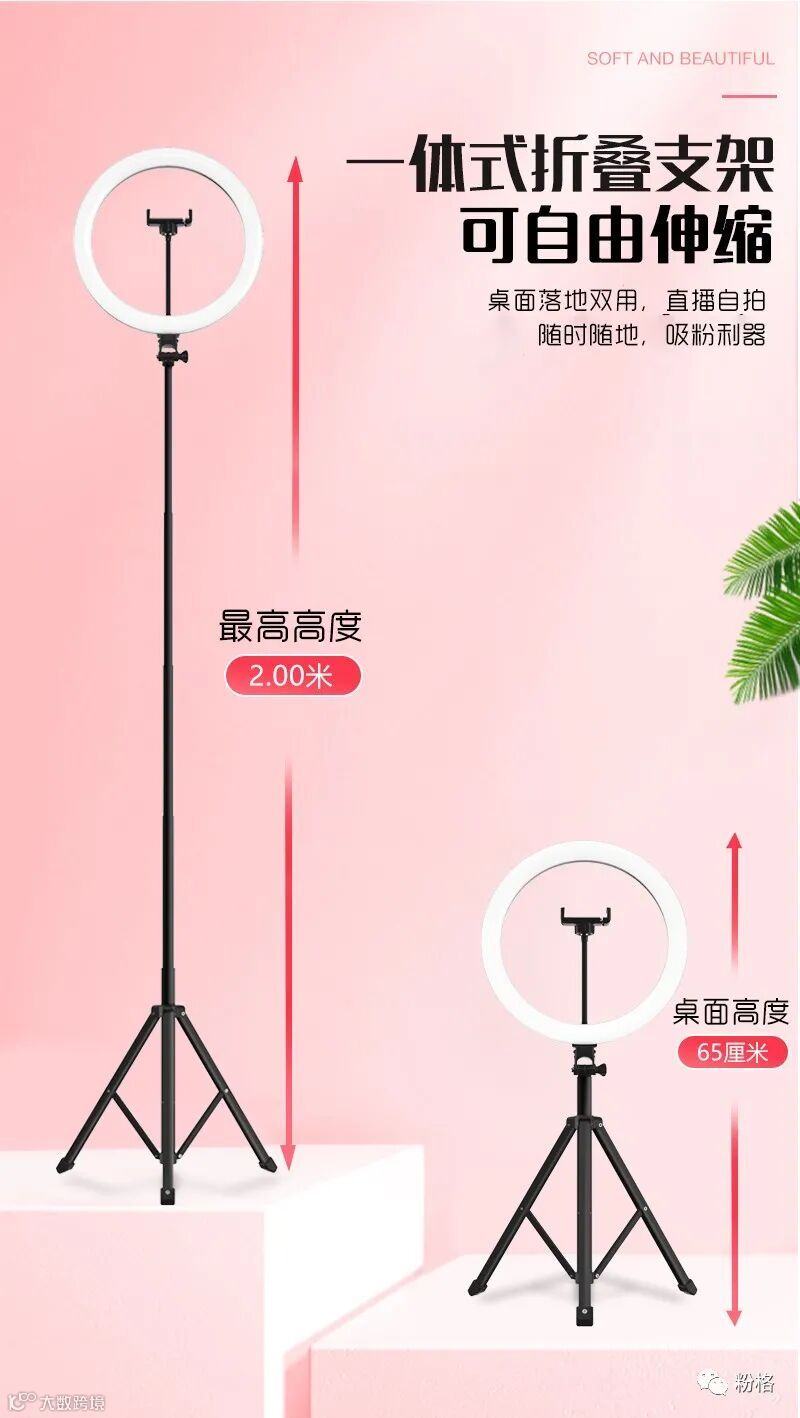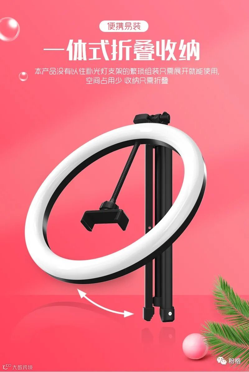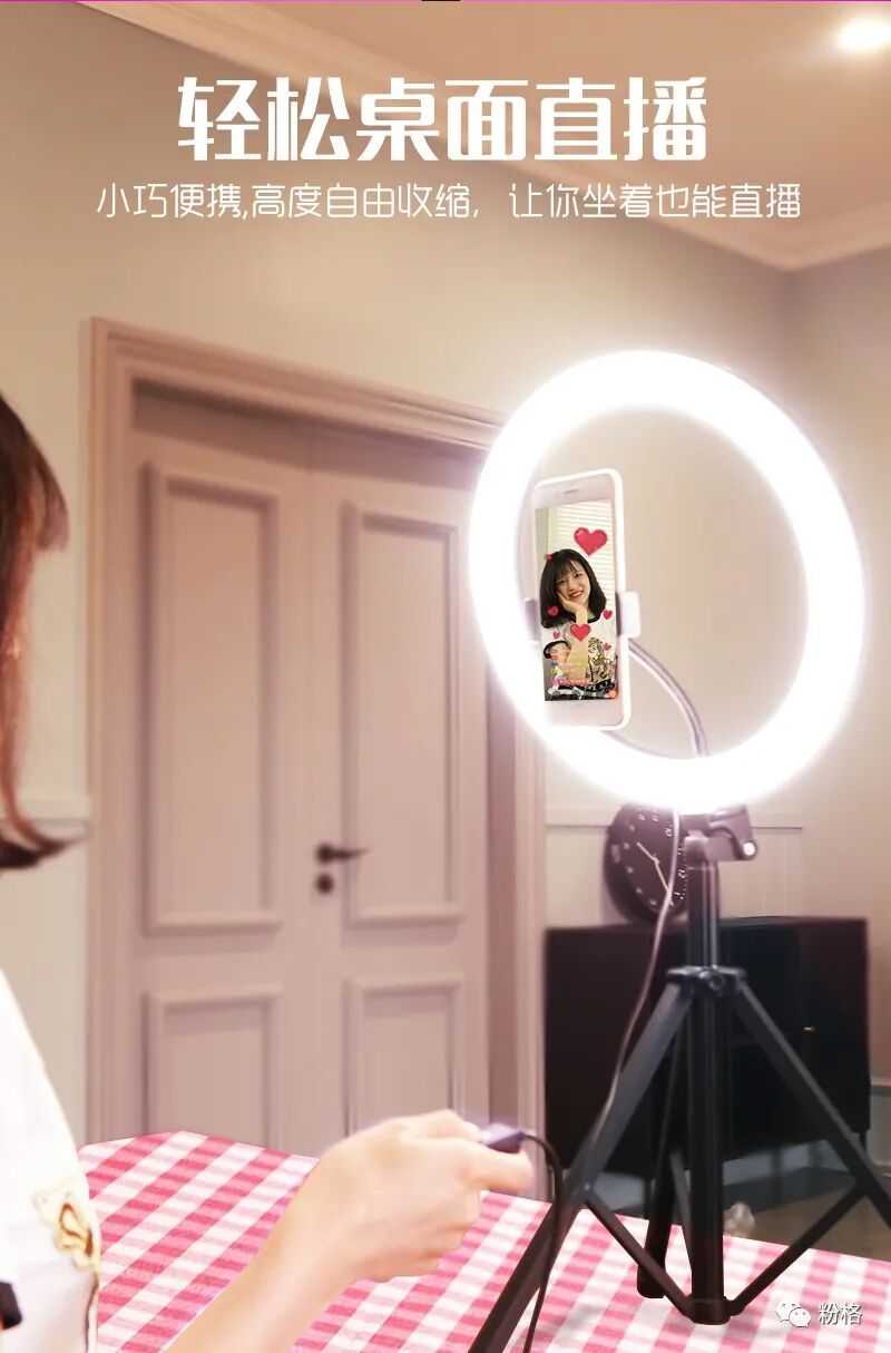直播灯要折叠、要迷你、我们还要“稳”。12寸直径30厘米一体式伸缩折叠大光圈直播灯RK53“她”来了!一体式无需拆卸繁杂安装步骤,可自由伸缩高度,可桌面落地双用,折叠时仅为35厘米长度,伸展时高度可达2米(此高度可适用模特及高挑女神),三角架中心点重心支撑让直播时更“稳”!大圆弧形柔光灯片设计让你直播美颜亮肤,创新型实用专利为销售保驾护航,实惠的价格让使用人群更加广泛。这么一款拥有“高”“稳”“小”“实用”“创新”等众多优点又实惠的折叠伸缩直播灯,她必将成为你直播的吸粉利器!