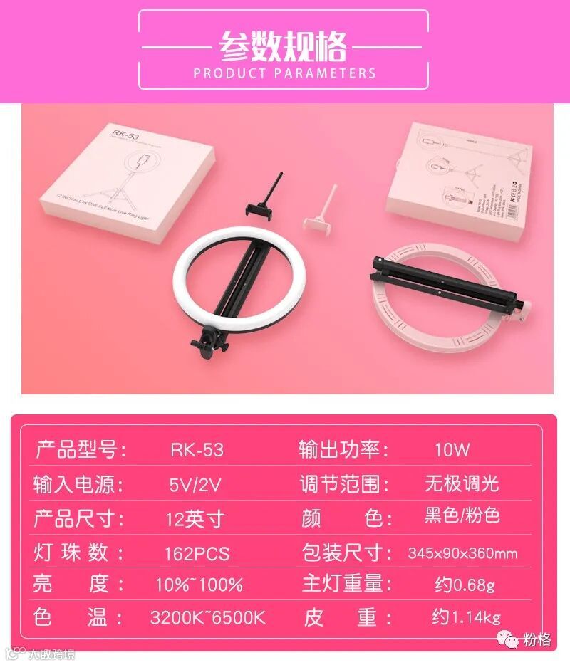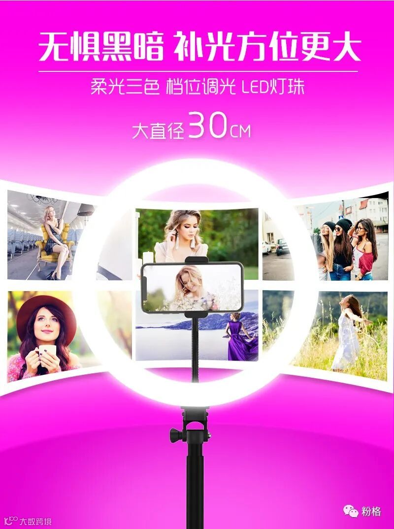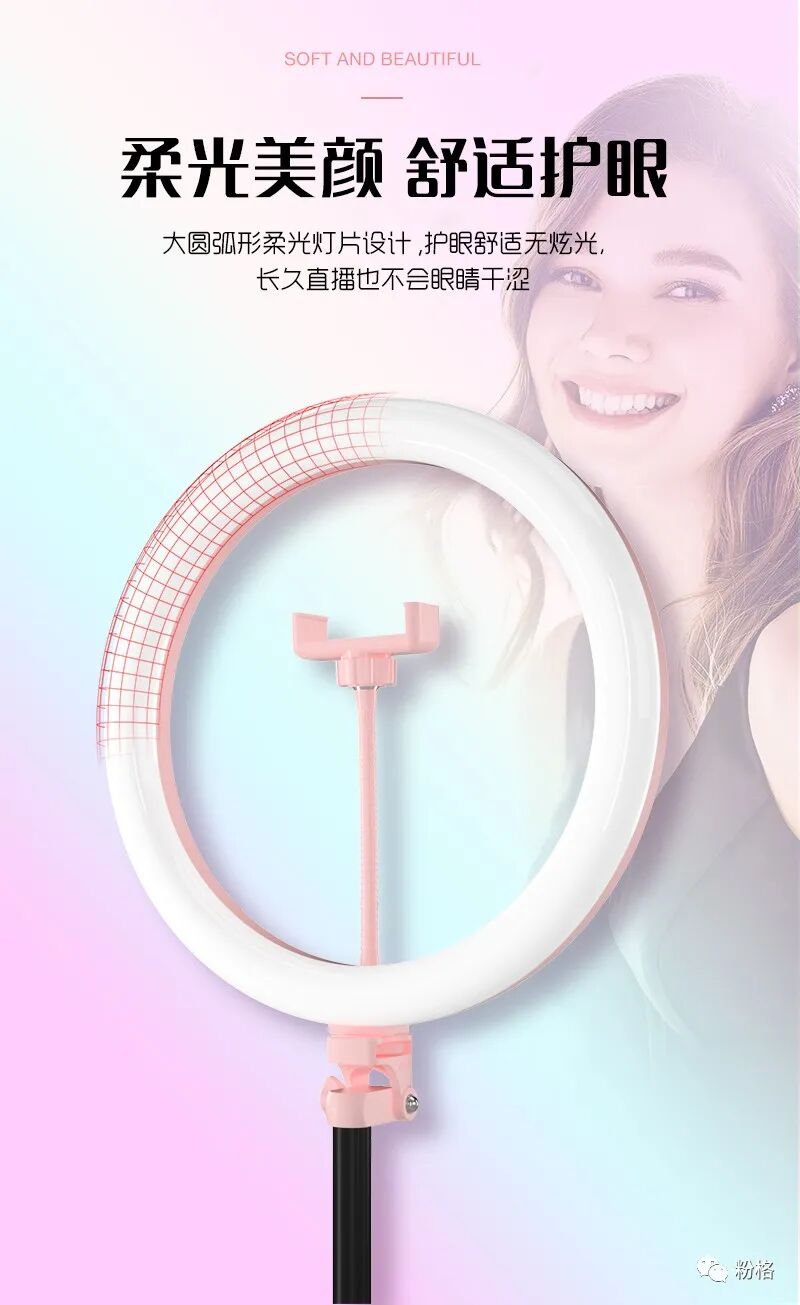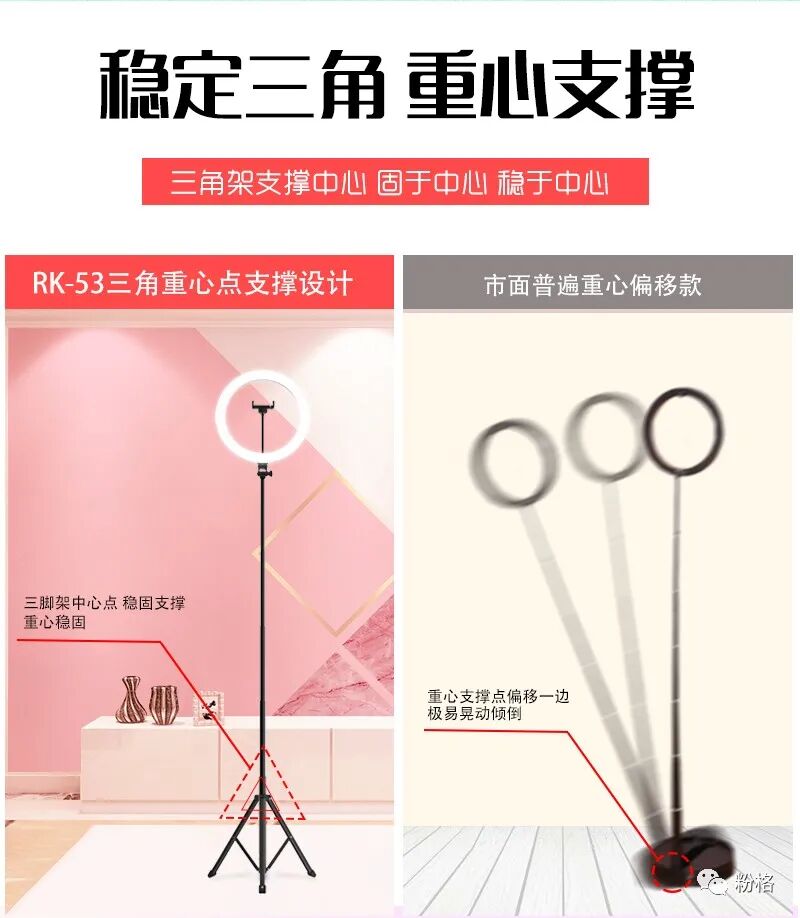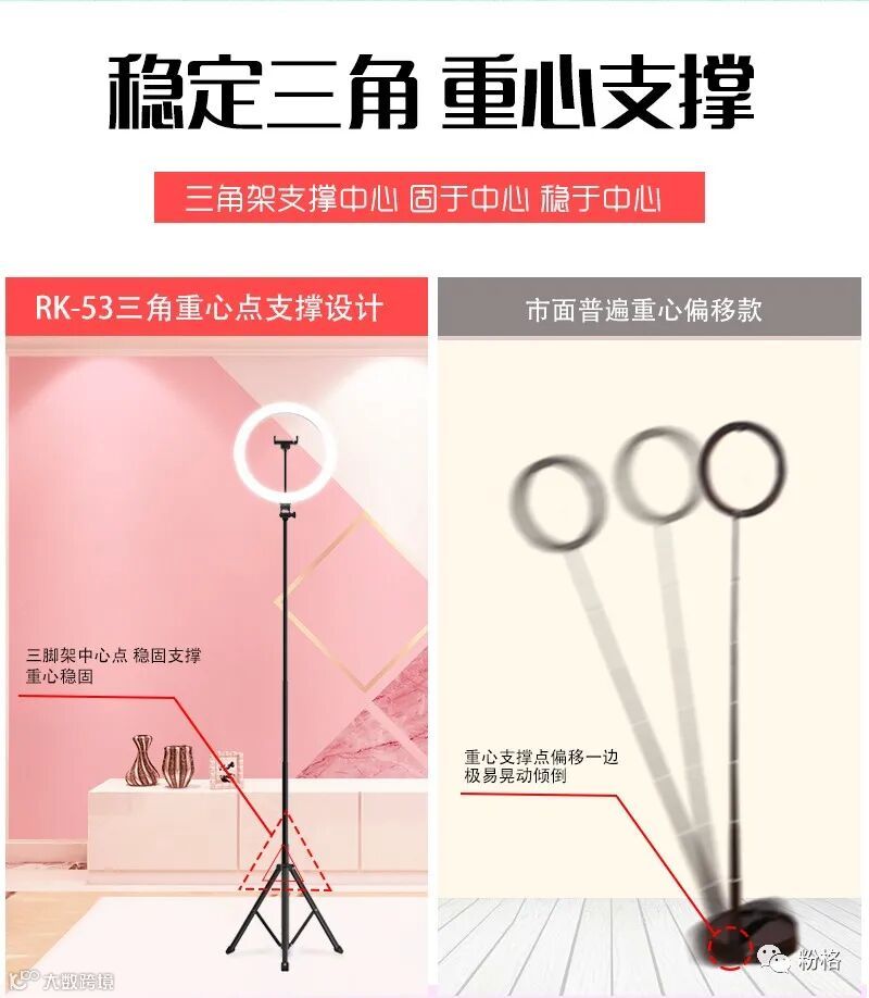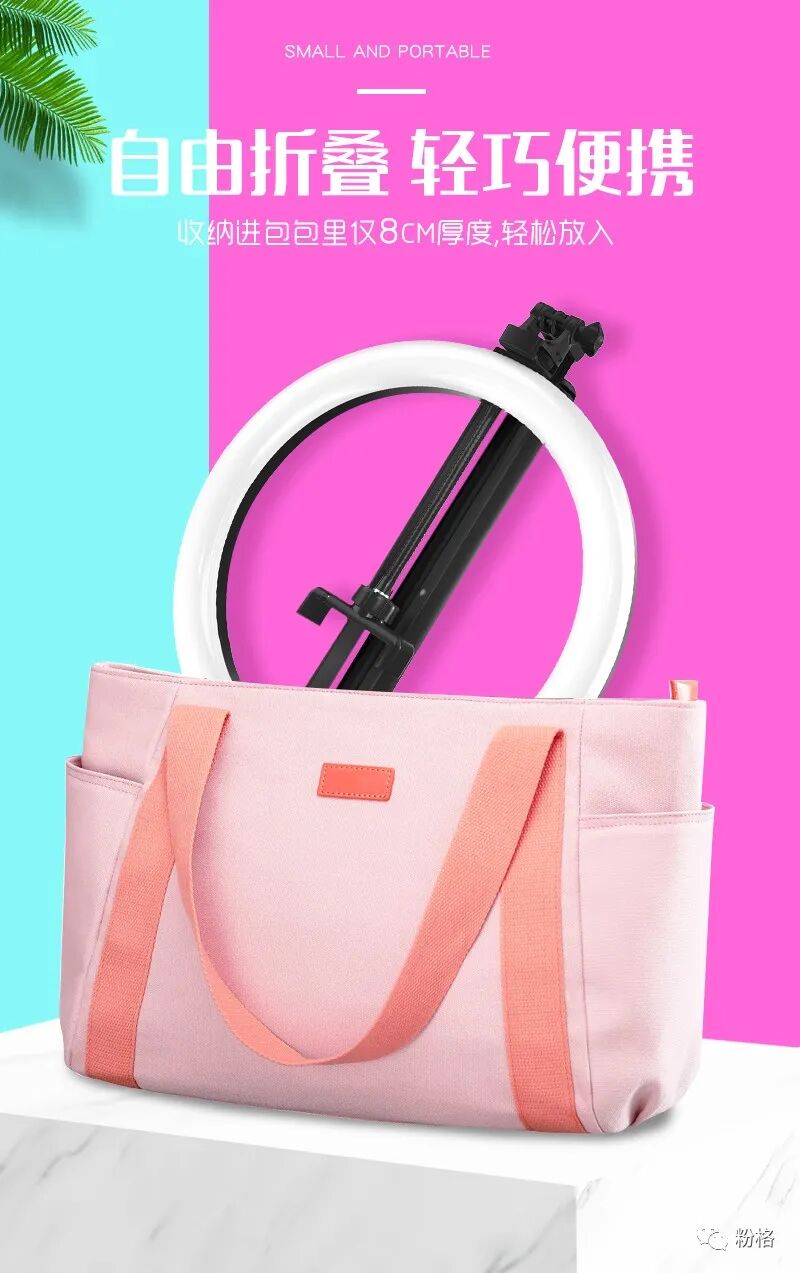直播灯要折叠、要迷你、我们还要“稳”。12寸直径30厘米一体式伸缩折叠大光圈直播灯RK53“她”来了!一体式无需拆卸繁杂安装步骤,可自由伸缩高度,可桌面落地双用,折叠时仅为35厘米长度,伸展时高度可达2米(此高度可适用模特及高挑女神),三角架中心点重心支撑让直播时更“稳”!大圆弧形柔光灯片设计让你直播美颜亮肤,创新型实用专利为销售保驾护航,实惠的价格让使用人群更加广泛。这么一款拥有“高”“稳”“小”“实用”“创新”等众多优点又实惠的折叠伸缩直播灯,她必将成为你直播的吸粉利器!