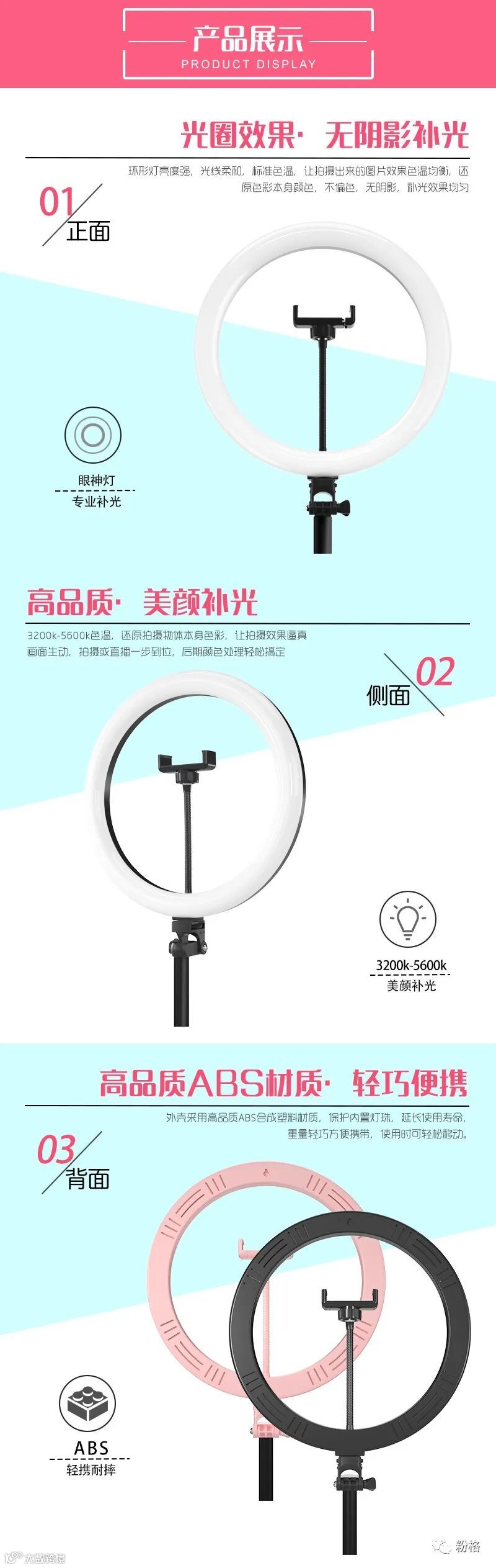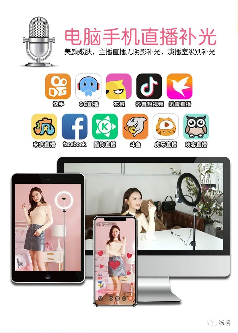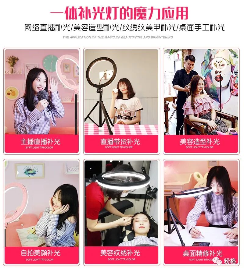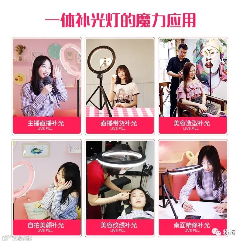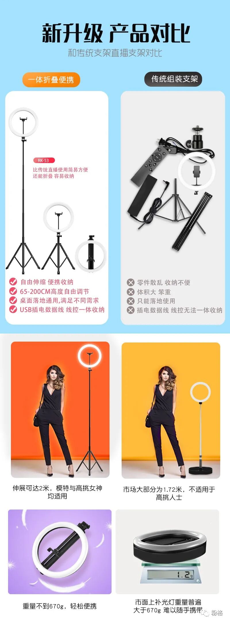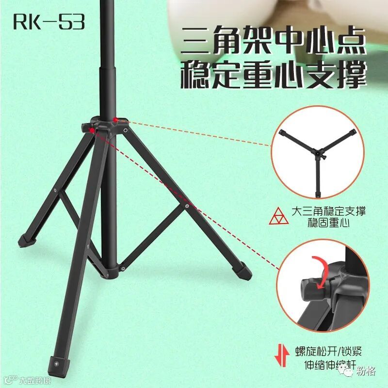 直播灯要折叠、要迷你、我们还要“稳”。12寸直径30厘米一体式伸缩折叠大光圈直播灯RK53“她”来了!一体式无需拆卸繁杂安装步骤,可自由伸缩高度,可桌面落地双用,折叠时仅为35厘米长度,伸展时高度可达2米(此高度可适用模特及高挑女神),三角架中心点重心支撑让直播时更“稳”!大圆弧形柔光灯片设计让你直播美颜亮肤,创新型实用专利为销售保驾护航,实惠的价格让使用人群更加广泛。这么一款拥有“高”“稳”“小”“实用”“创新”等众多优点又实惠的折叠伸缩直播灯,她必将成为你直播的吸粉利器!