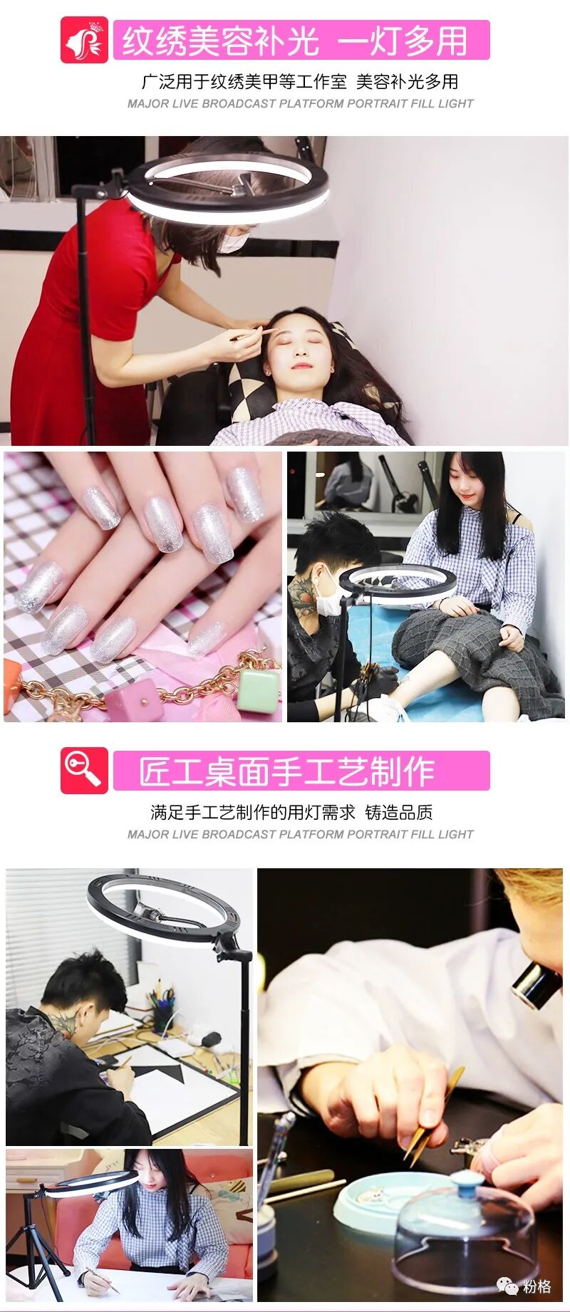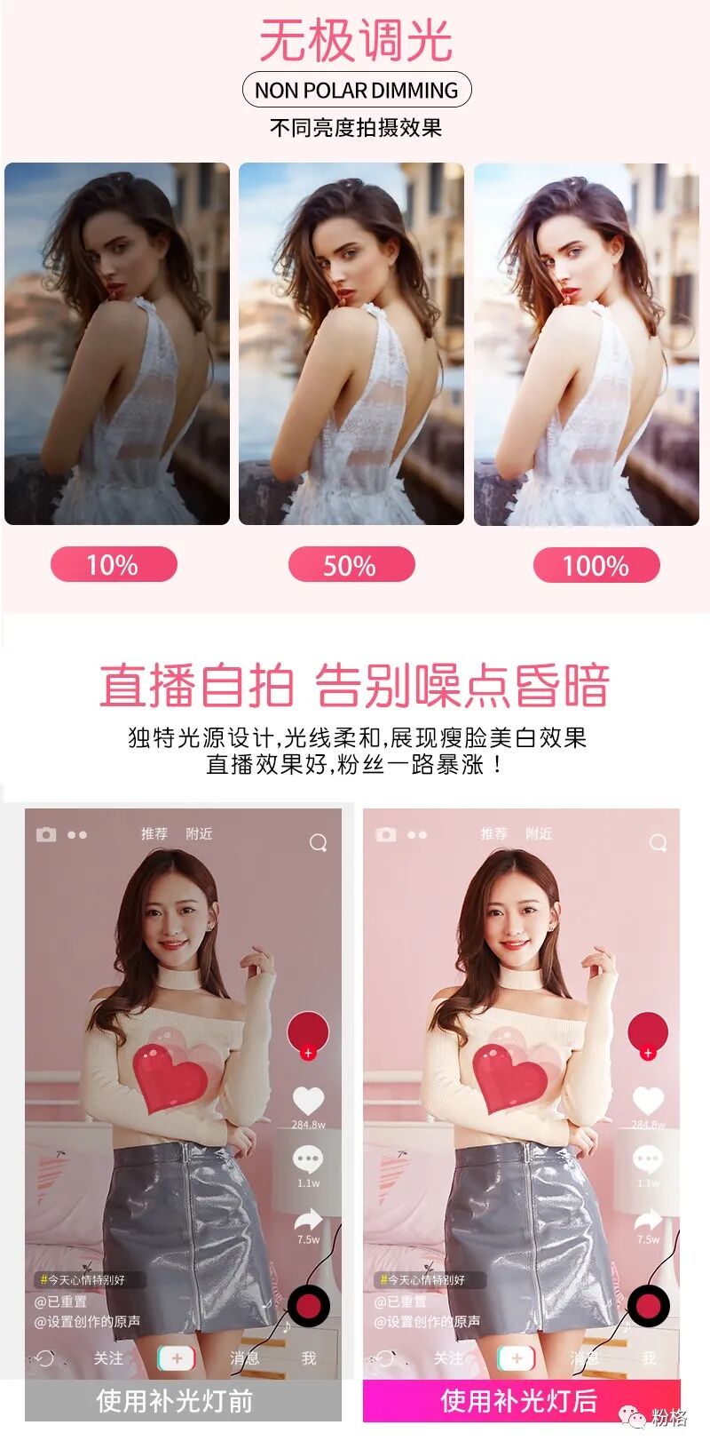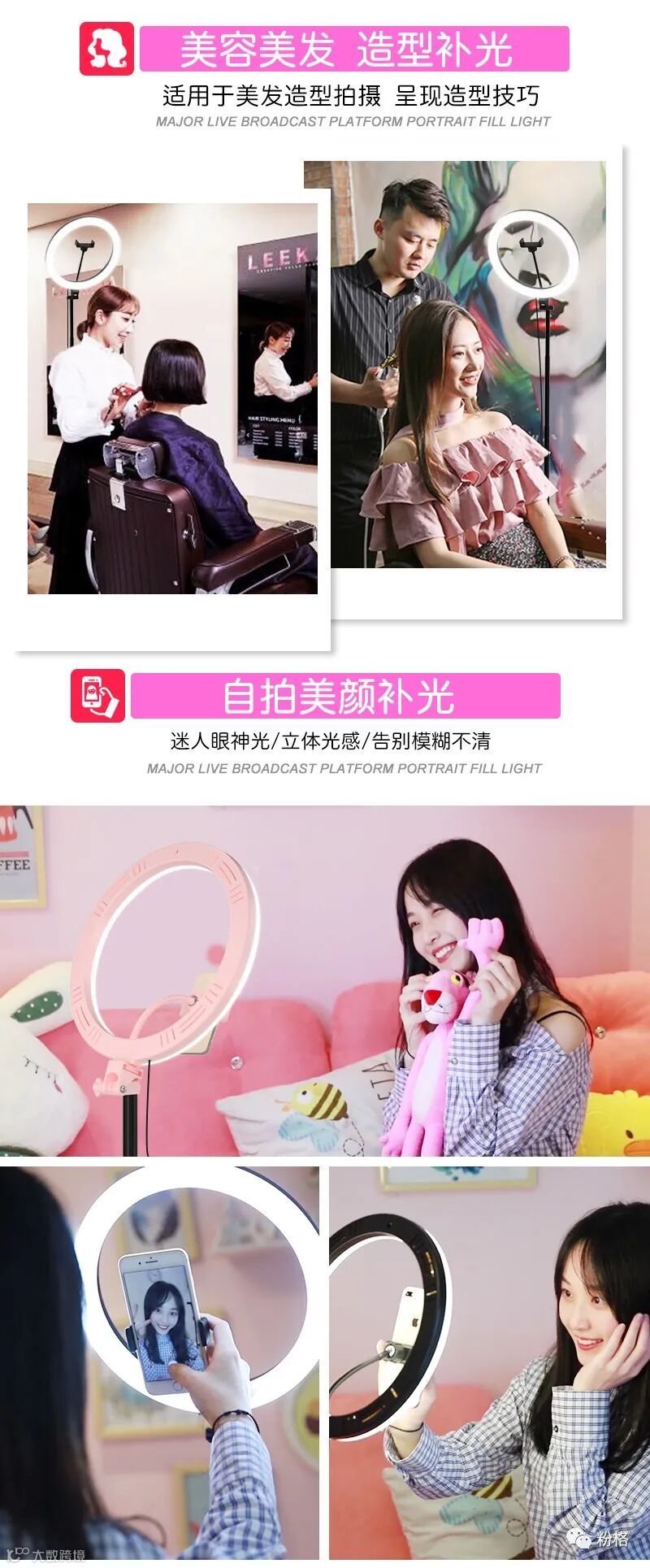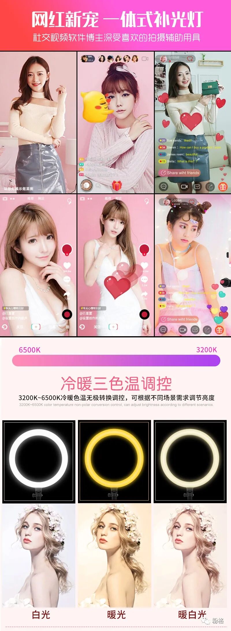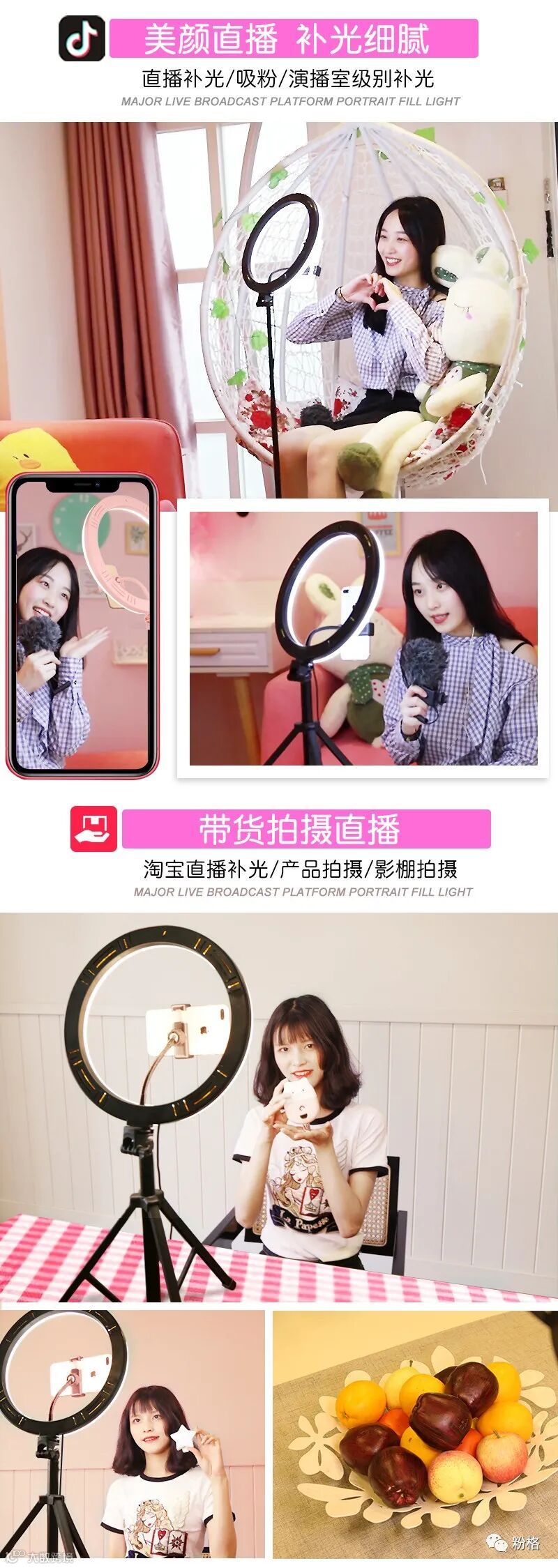 直播灯要折叠、要迷你、我们还要“稳”。12寸直径30厘米一体式伸缩折叠大光圈直播灯RK53“她”来了!一体式无需拆卸繁杂安装步骤,可自由伸缩高度,可桌面落地双用,折叠时仅为35厘米长度,伸展时高度可达2米(此高度可适用模特及高挑女神),三角架中心点重心支撑让直播时更“稳”!大圆弧形柔光灯片设计让你直播美颜亮肤,创新型实用专利为销售保驾护航,实惠的价格让使用人群更加广泛。这么一款拥有“高”“稳”“小”“实用”“创新”等众多优点又实惠的折叠伸缩直播灯,她必将成为你直播的吸粉利器!