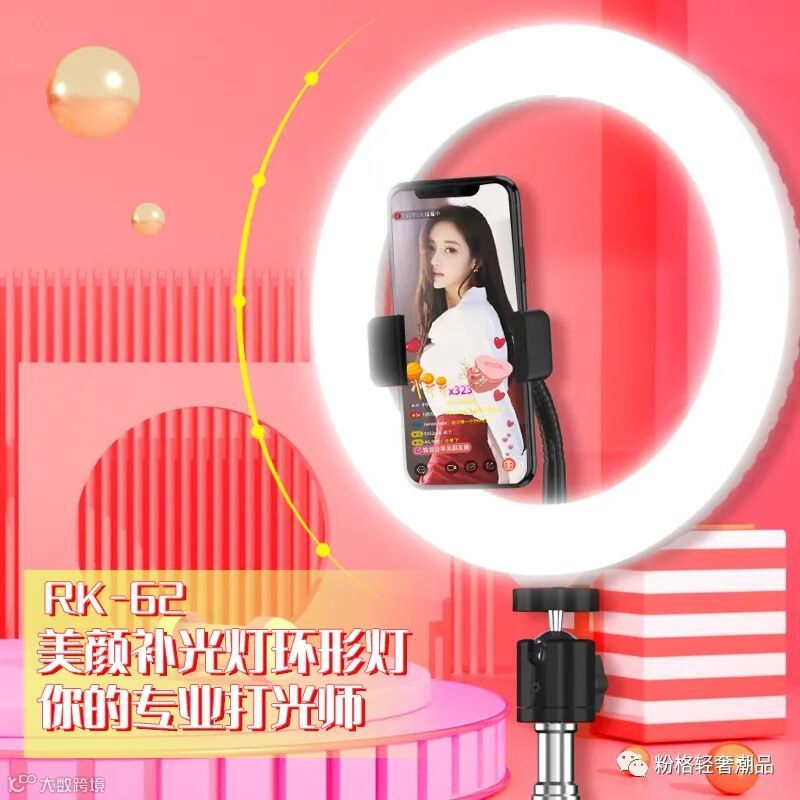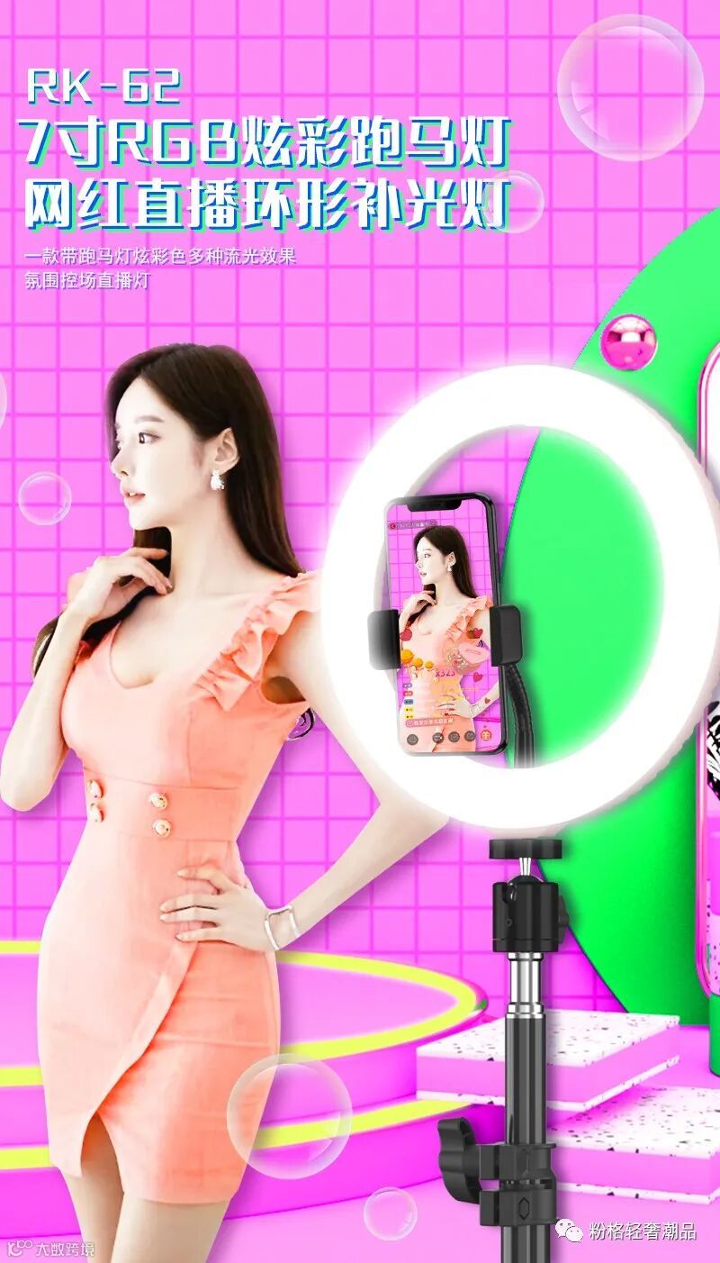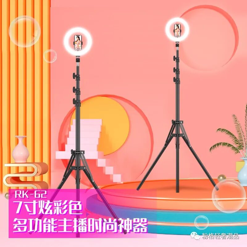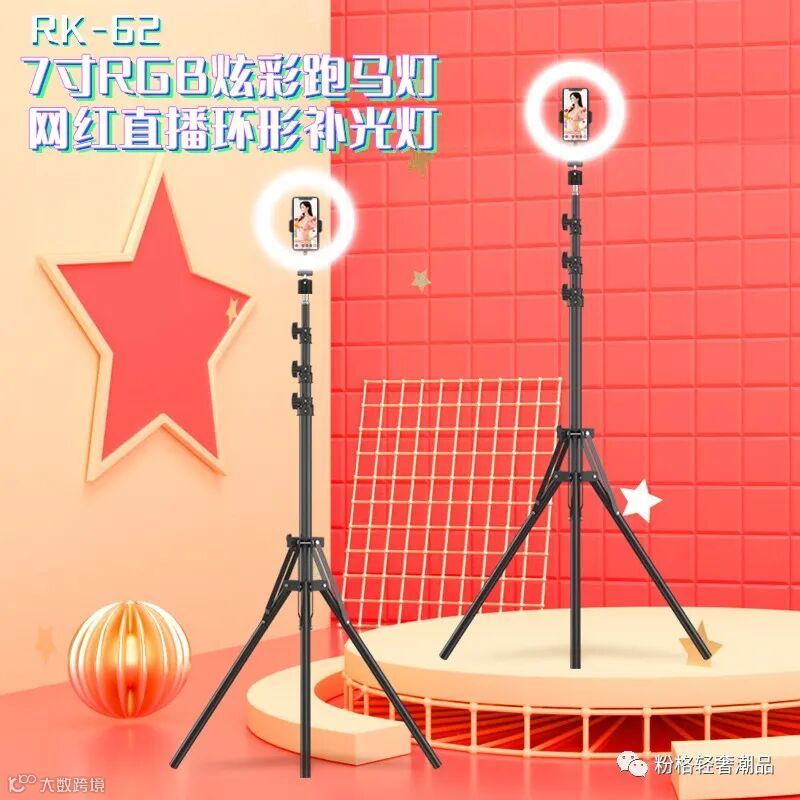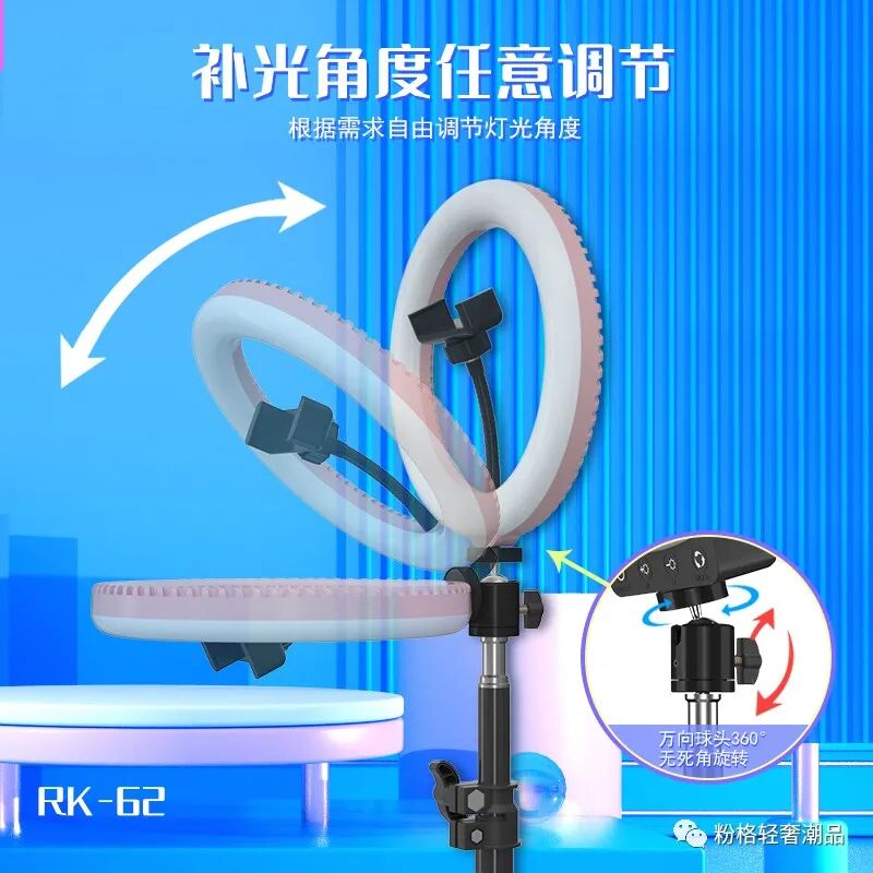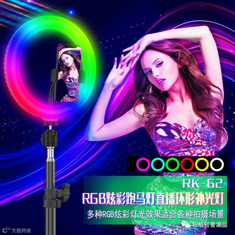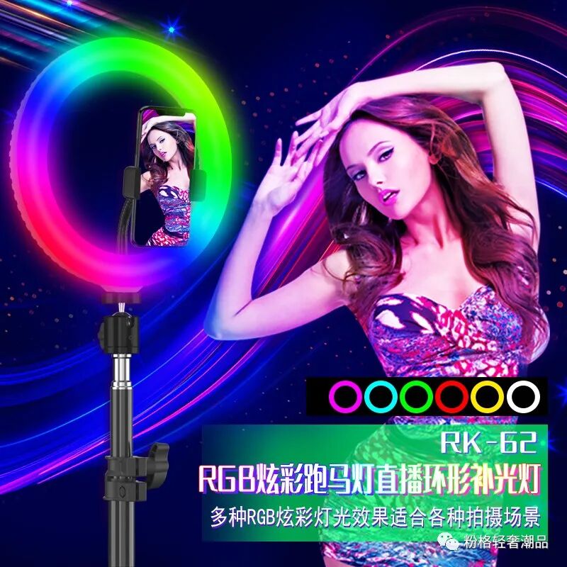 7寸RGB炫彩跑马灯网红直播环形补光灯RK-62是一款带跑马灯炫彩色多种流光特效氛围控场直播灯,神秘时尚炫彩流光效果,赤、橙、黄、绿、青、蓝、紫等多色灯光组合,时而它像彩虹,时而它像DJ氛围灯,时而它是呼吸灯,可直播、装饰、催眠等,7寸RGB炫彩跑马灯网红直播环形补光灯RK-62版是一款多功能主播时尚神器,线控控制调节色温、亮度、RGB模式,白光高冷女神范,暖光萌妹子,各种直播风格轻松控场,自带360°旋转云台可实现无死角万向打光。