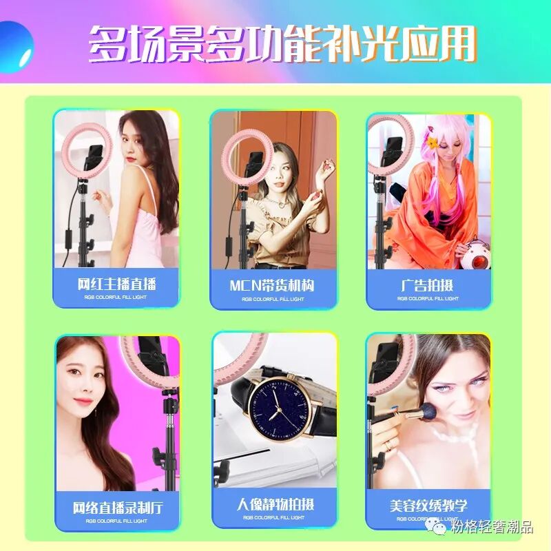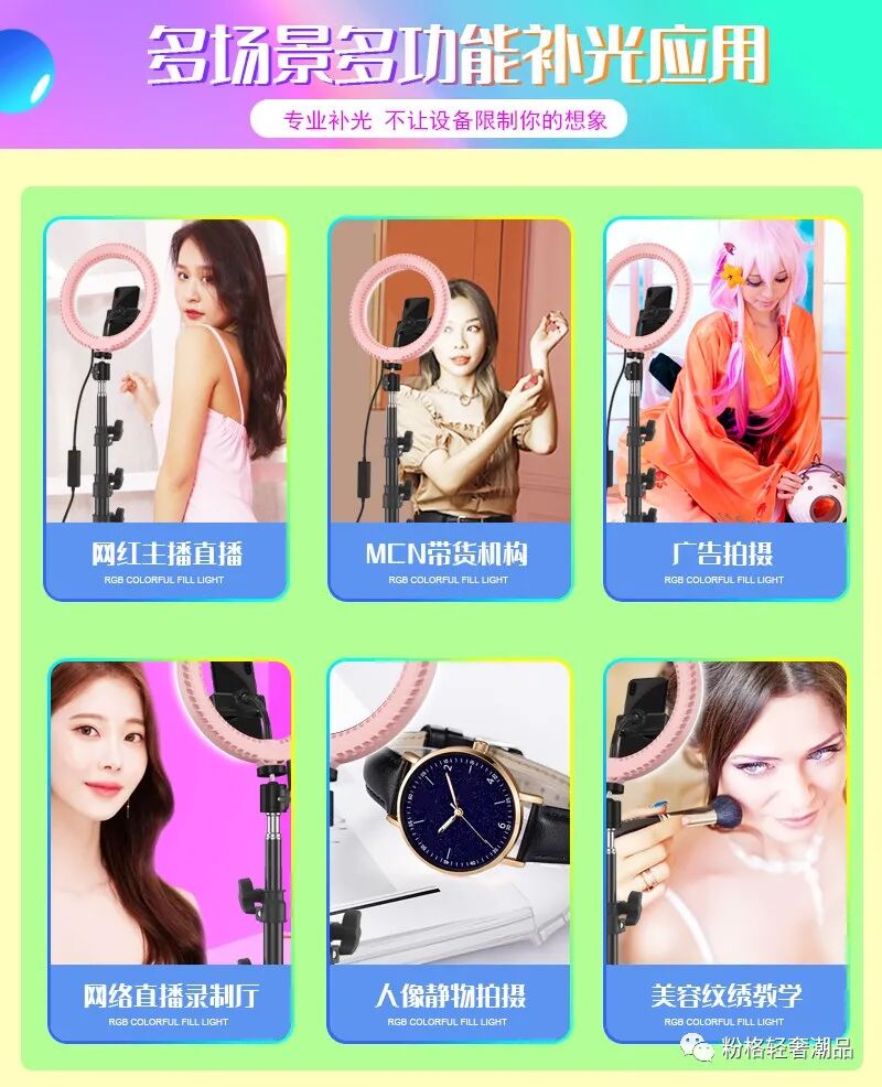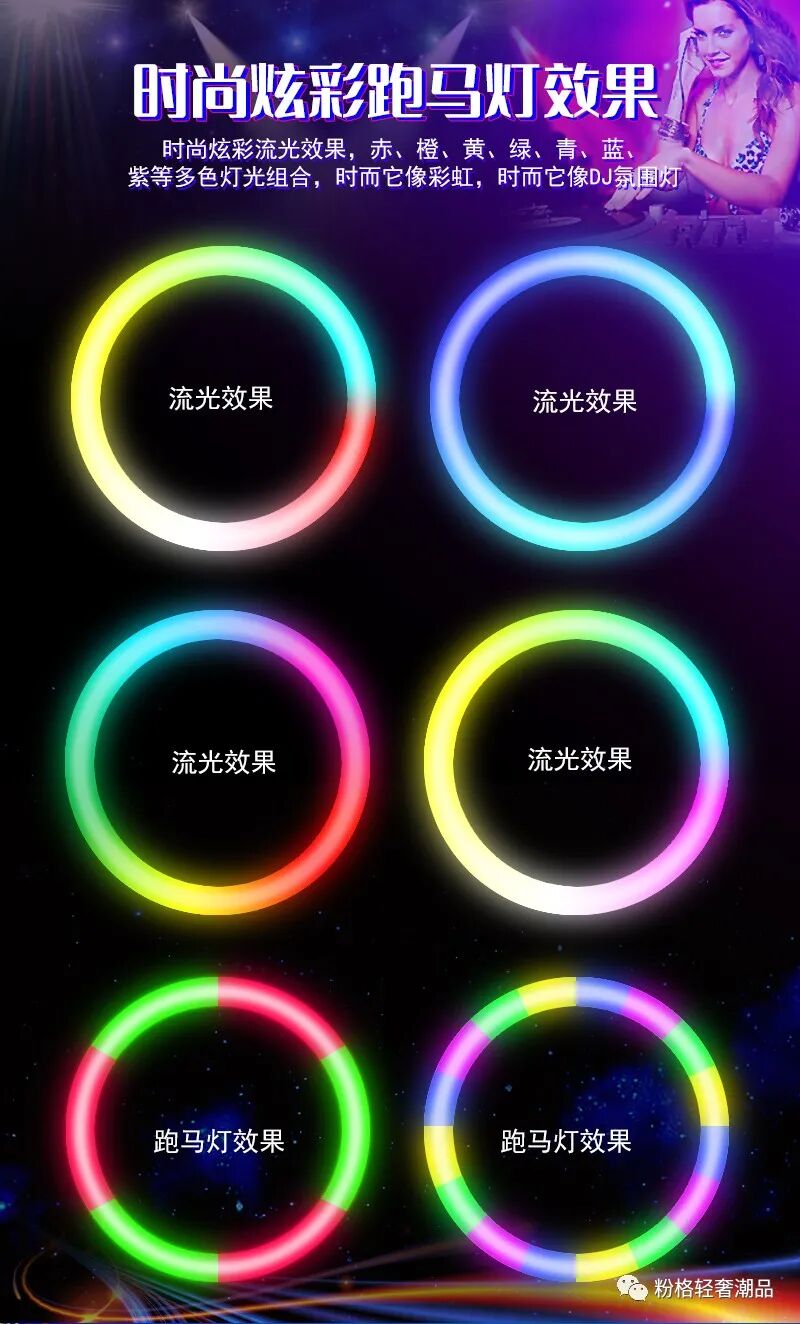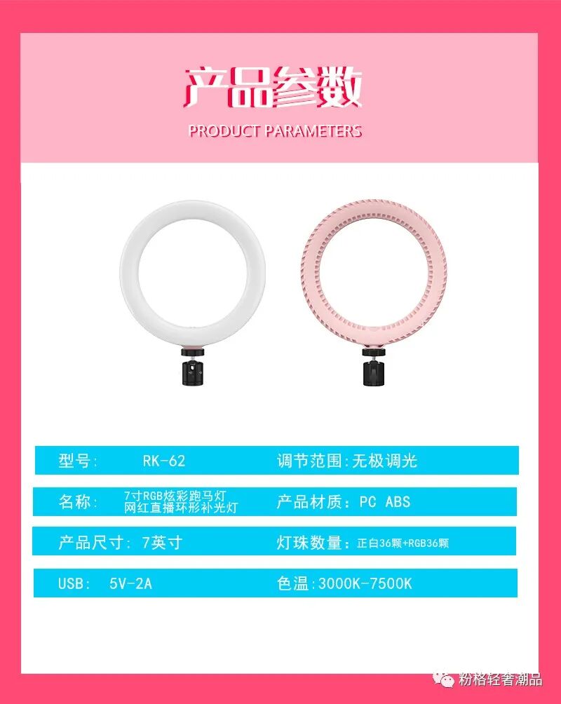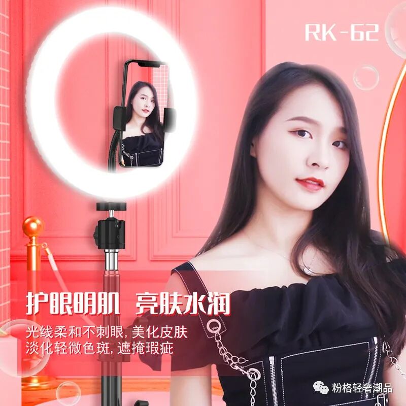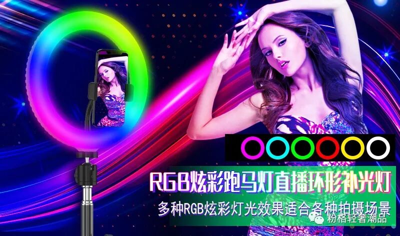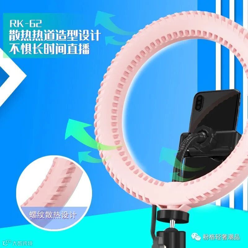 7寸RGB炫彩跑马灯网红直播环形补光灯RK-62是一款带跑马灯炫彩色多种流光特效氛围控场直播灯,神秘时尚炫彩流光效果,赤、橙、黄、绿、青、蓝、紫等多色灯光组合,时而它像彩虹,时而它像DJ氛围灯,时而它是呼吸灯,可直播、装饰、催眠等,7寸RGB炫彩跑马灯网红直播环形补光灯RK-62版是一款多功能主播时尚神器,线控控制调节色温、亮度、RGB模式,白光高冷女神范,暖光萌妹子,各种直播风格轻松控场,自带360°旋转云台可实现无死角万向打光。