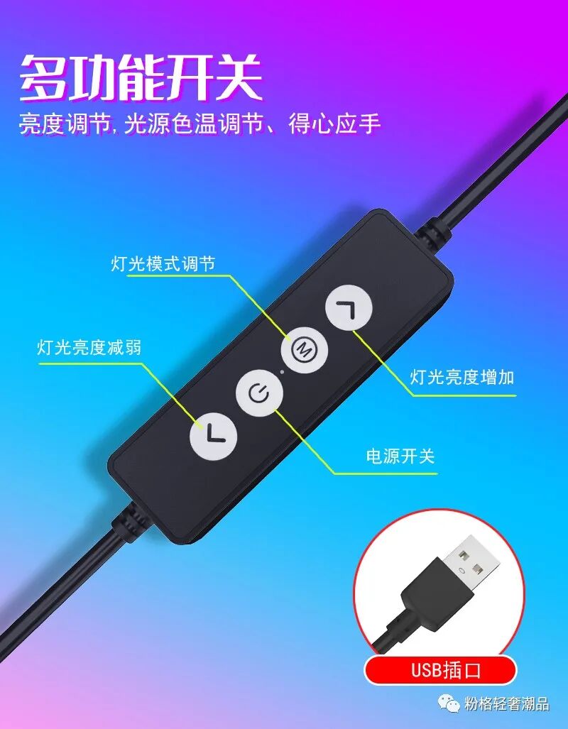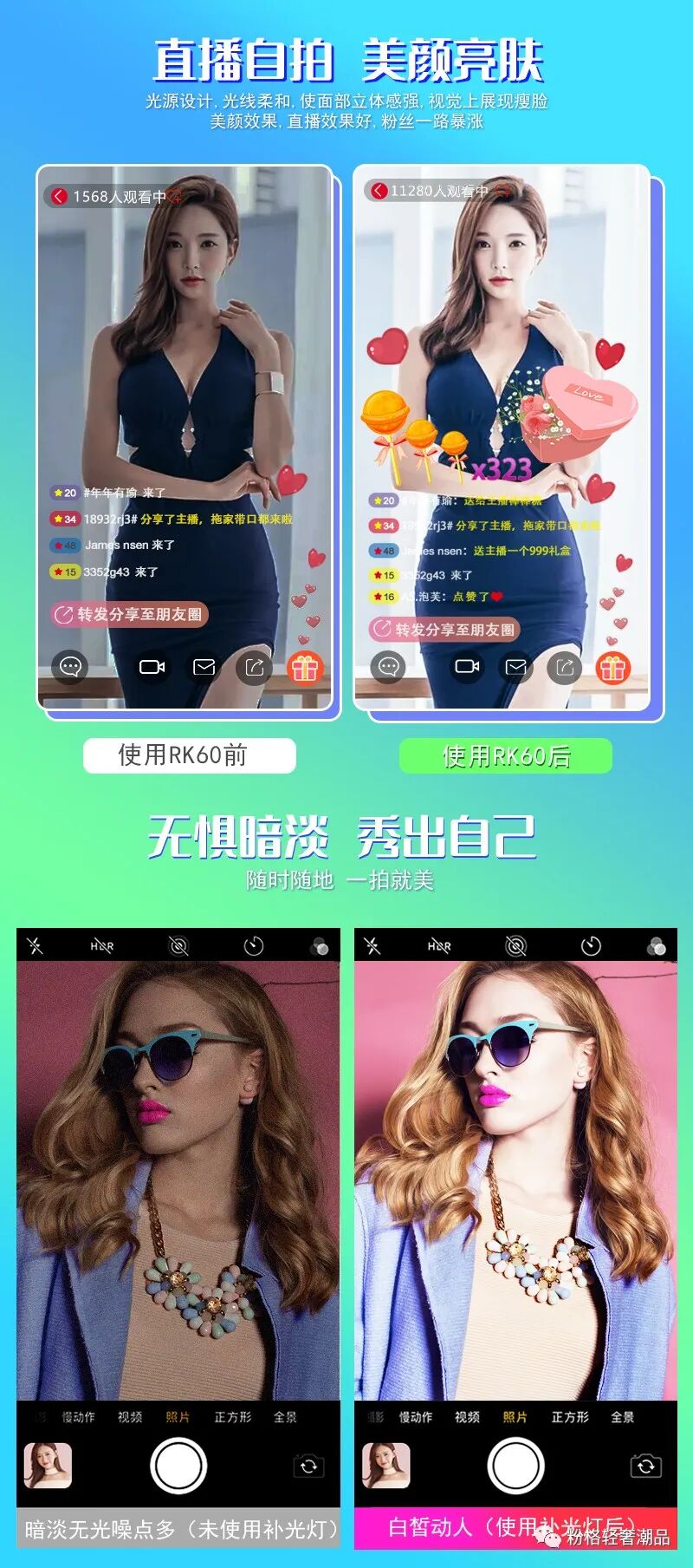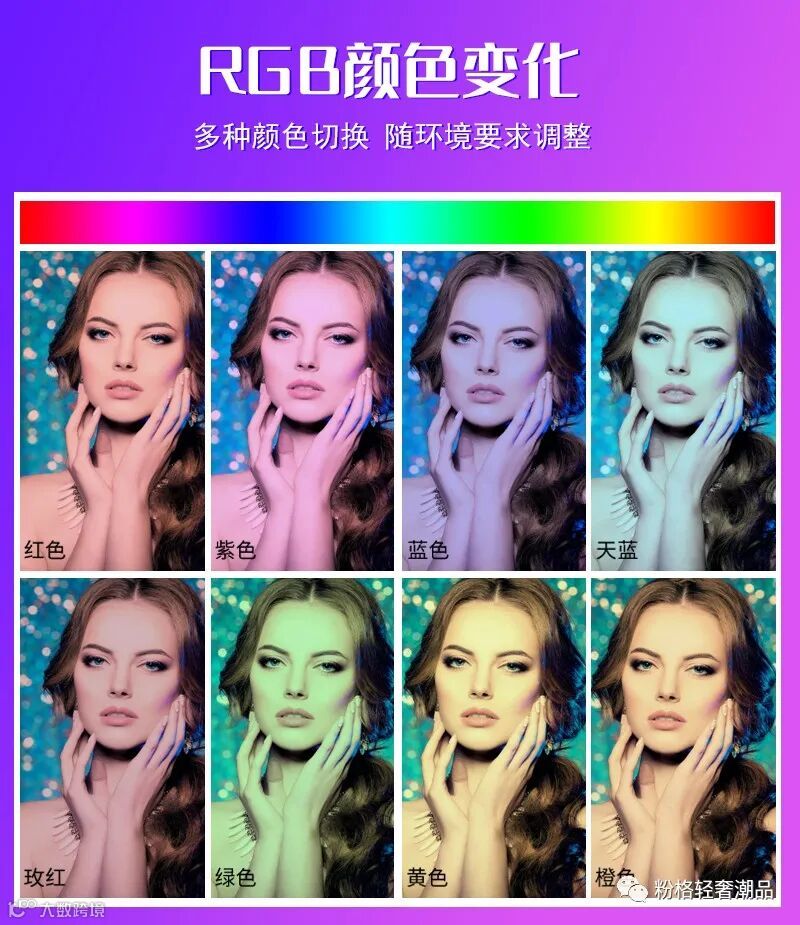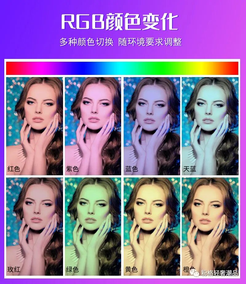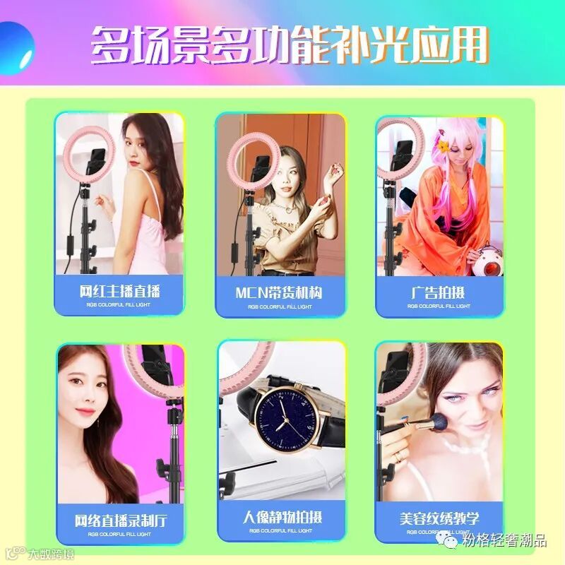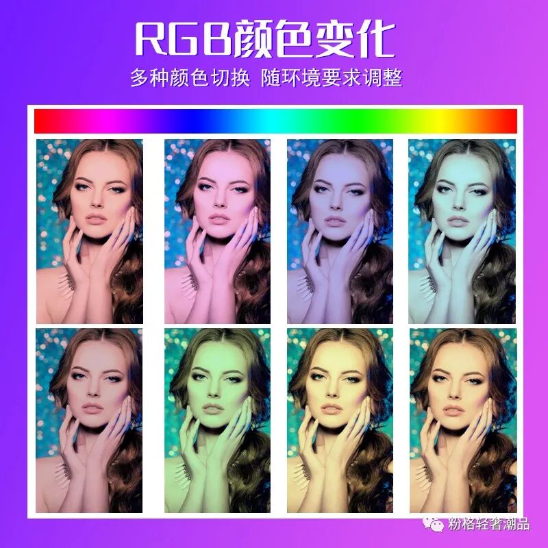 7寸RGB炫彩跑马灯网红直播环形补光灯RK-62是一款带跑马灯炫彩色多种流光特效氛围控场直播灯,神秘时尚炫彩流光效果,赤、橙、黄、绿、青、蓝、紫等多色灯光组合,时而它像彩虹,时而它像DJ氛围灯,时而它是呼吸灯,可直播、装饰、催眠等,7寸RGB炫彩跑马灯网红直播环形补光灯RK-62版是一款多功能主播时尚神器,线控控制调节色温、亮度、RGB模式,白光高冷女神范,暖光萌妹子,各种直播风格轻松控场,自带360°旋转云台可实现无死角万向打光。