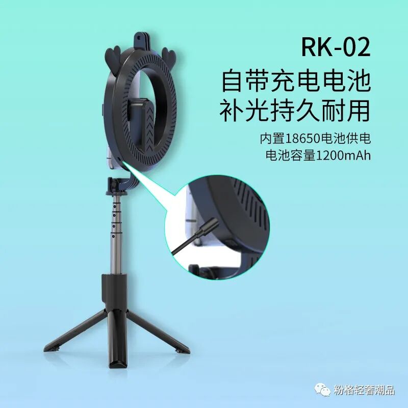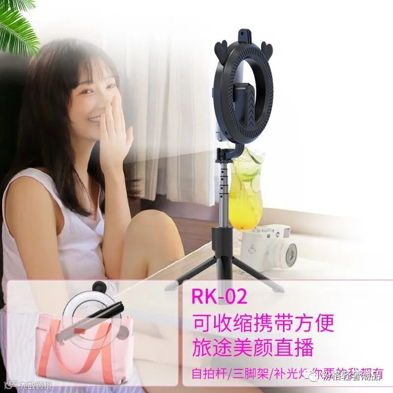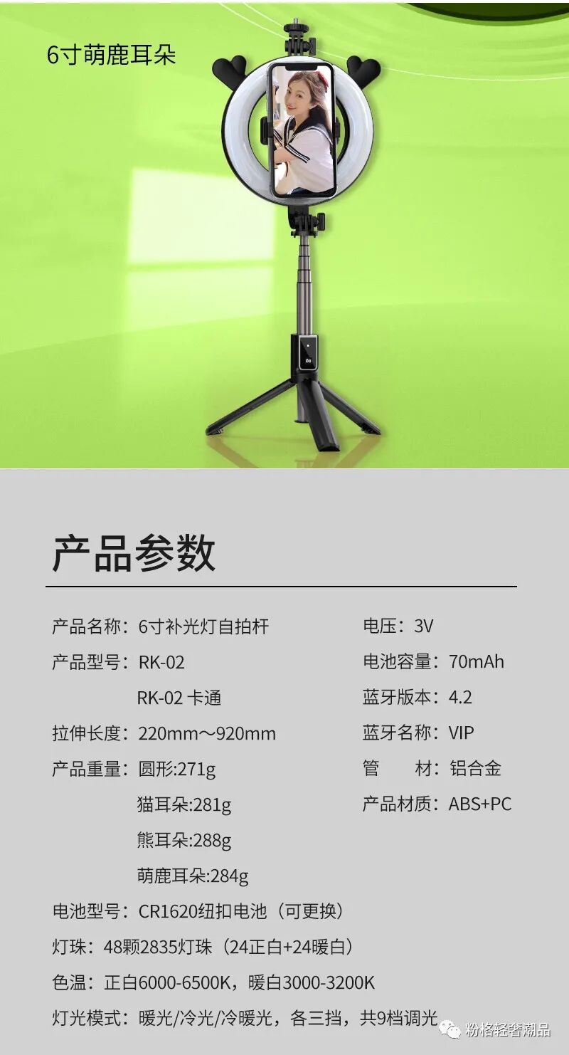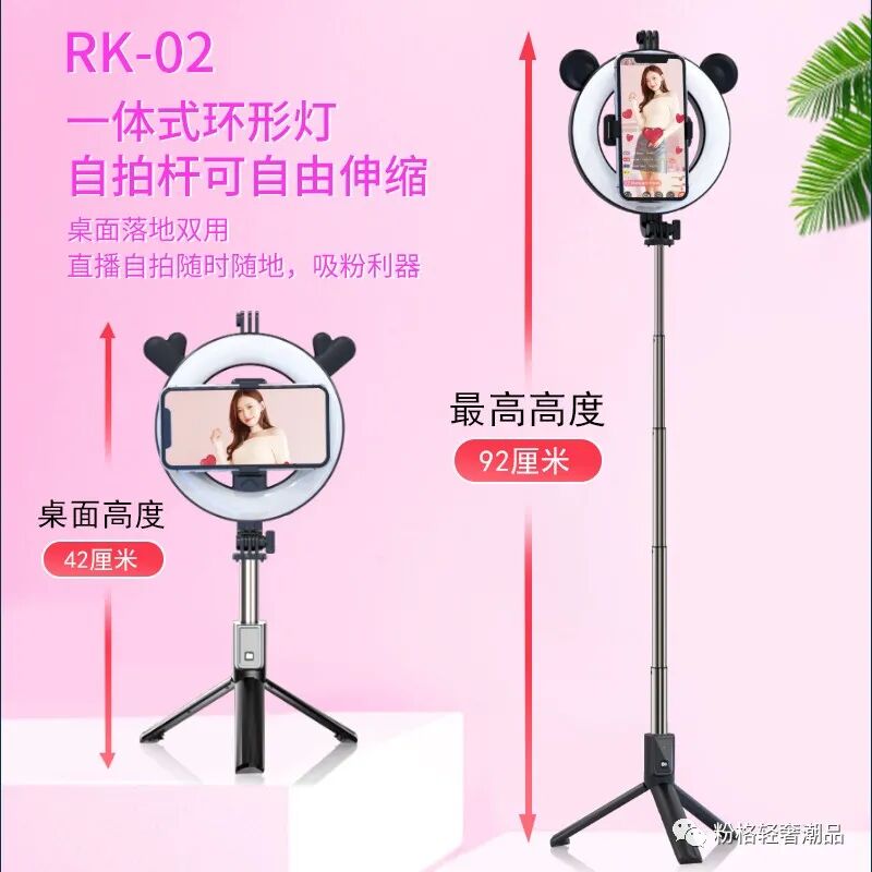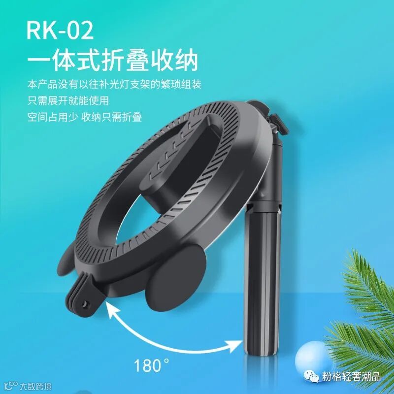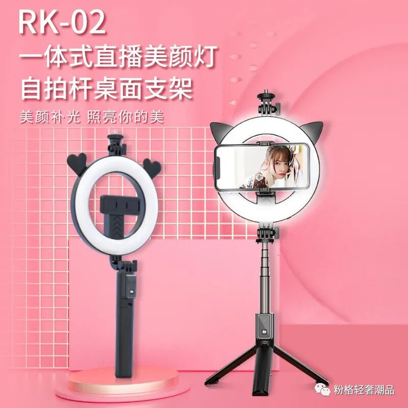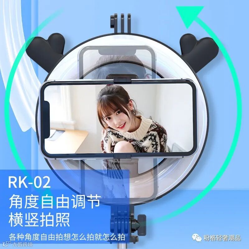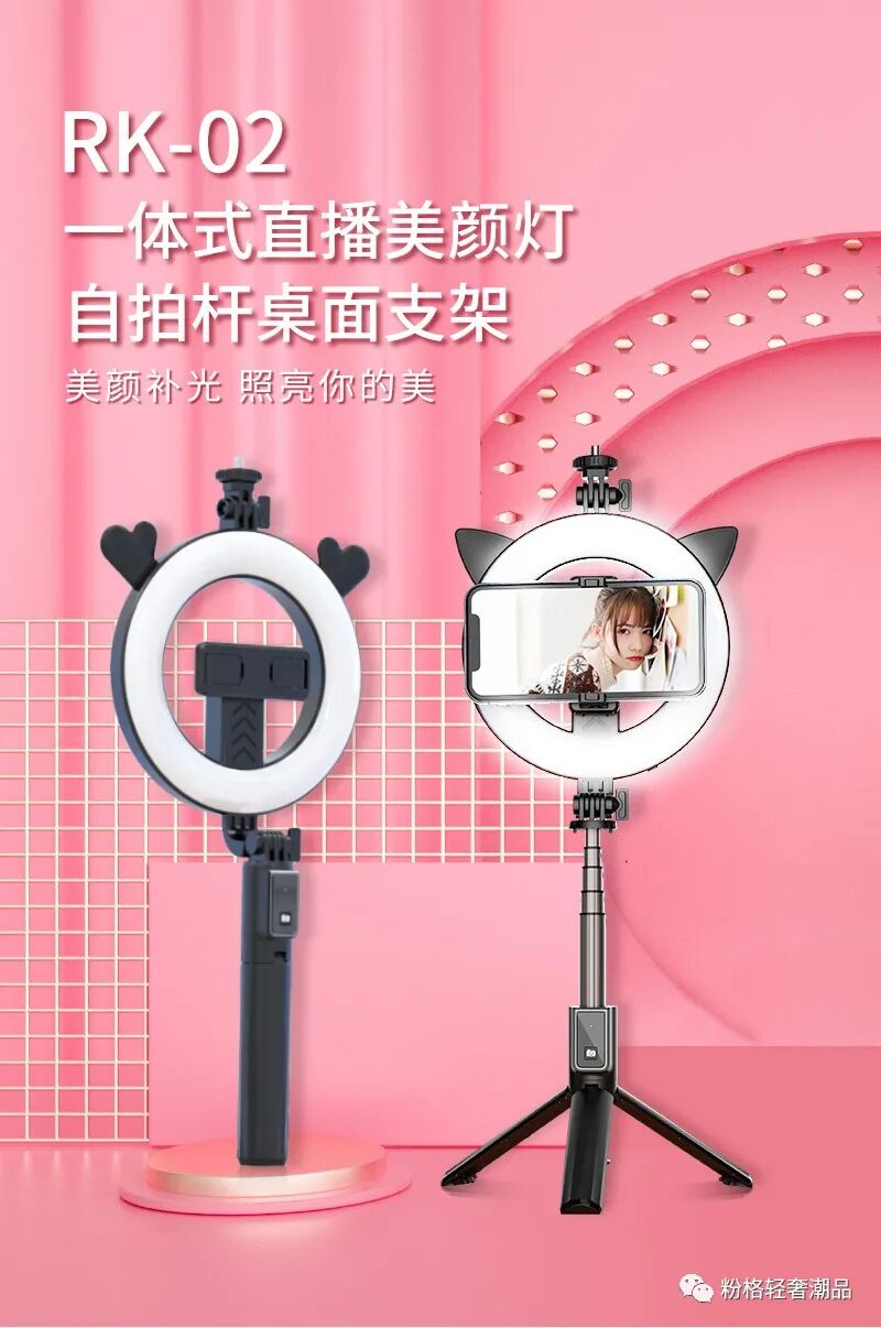 智能明肌直播支架RK-02是一款一体式环形灯自拍杆、美颜灯直播支架、网课学习AI护眼灯桌面支架、横竖拍蓝牙器自拍杆等,6寸美颜灯可做入门直播桌面支架使用,进口柔光罩材料搭配80颗冷暖灯珠打破黑暗噪点,让你直播眼有光 脸有神,三挡亮度调节,让你每个场合都是美美的女王。便携折叠设计,收纳自如,拉伸长92厘米折叠后仅22厘米,360度自由旋转,满足各种角度自拍。全铝合金伸缩杆与可收拢三脚架让拍摄更稳固,可卸蓝牙遥控器可更远距离自拍,解放双手拍出更美好的自己,自带电池,补光持久耐用,横竖拍夹子设计,让你自拍直播玩个够,有卡通版与普通版供你选择,5G直播短视频时代,赶紧下手抢购吧!