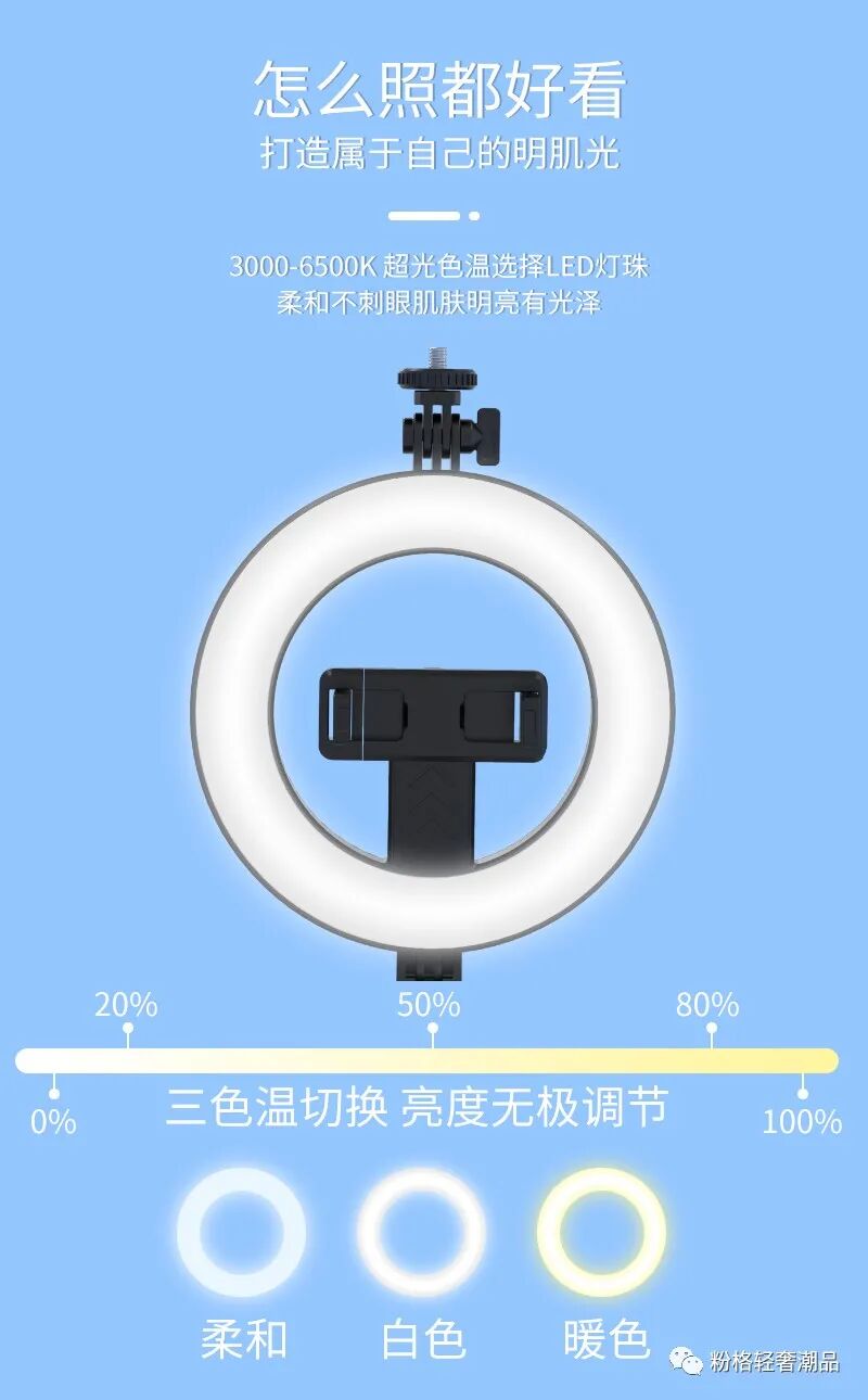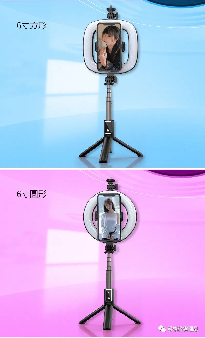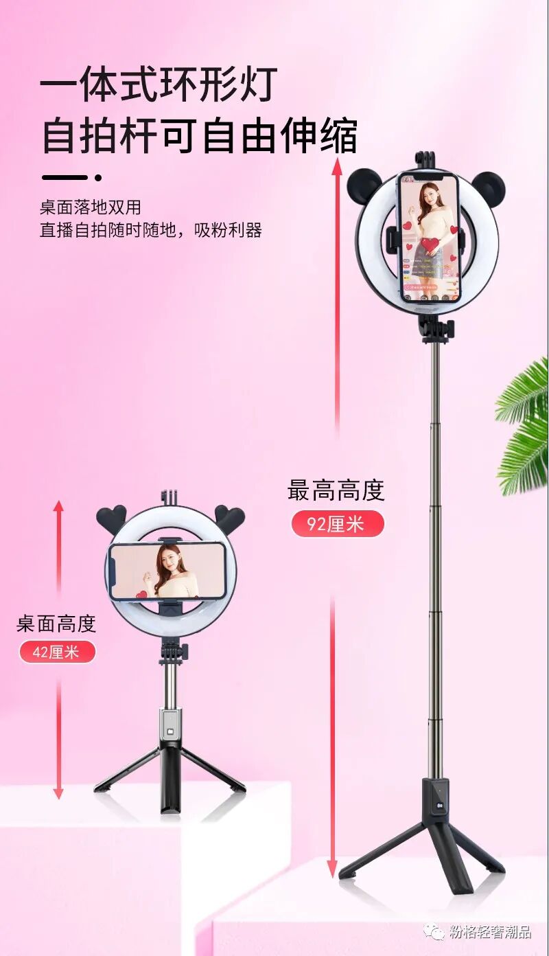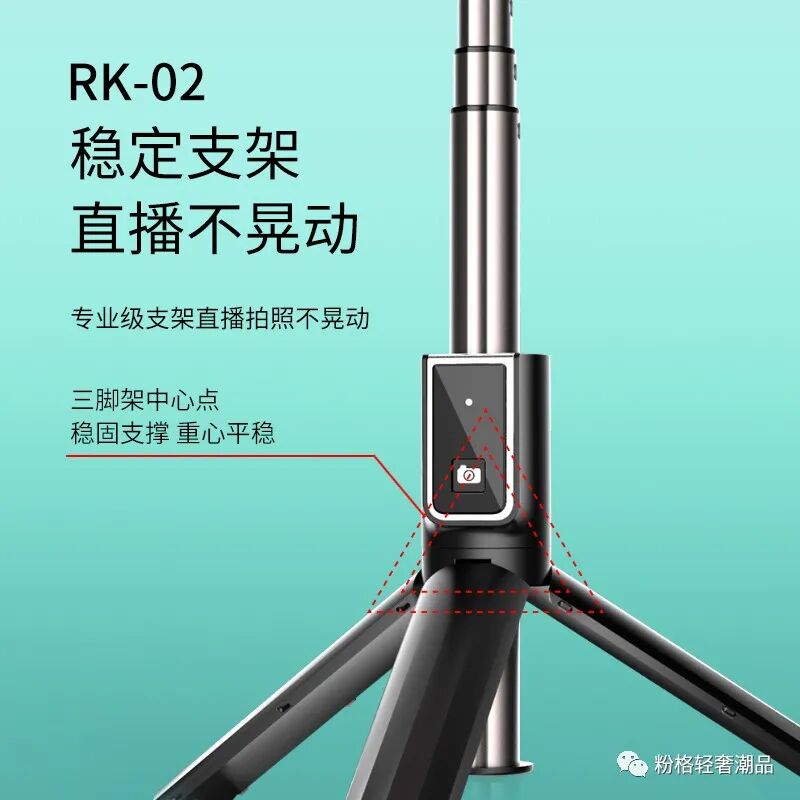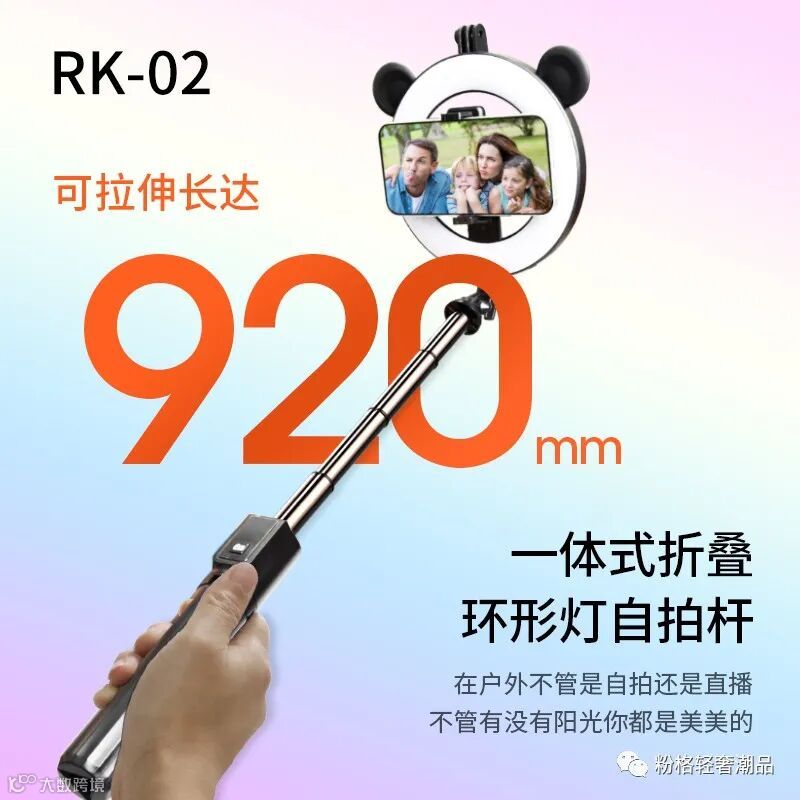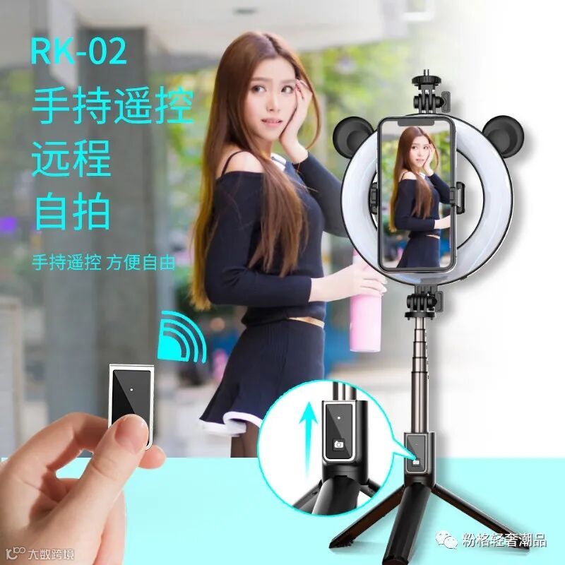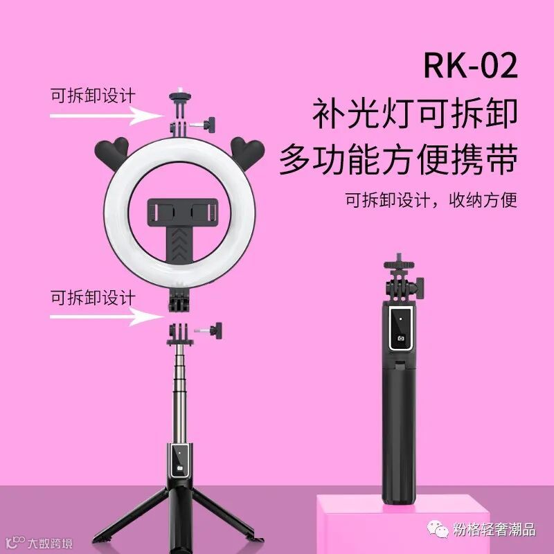 智能明肌直播支架RK-02是一款一体式环形灯自拍杆、美颜灯直播支架、网课学习AI护眼灯桌面支架、横竖拍蓝牙器自拍杆等,6寸美颜灯可做入门直播桌面支架使用,进口柔光罩材料搭配80颗冷暖灯珠打破黑暗噪点,让你直播眼有光 脸有神,三挡亮度调节,让你每个场合都是美美的女王。便携折叠设计,收纳自如,拉伸长92厘米折叠后仅22厘米,360度自由旋转,满足各种角度自拍。全铝合金伸缩杆与可收拢三脚架让拍摄更稳固,可卸蓝牙遥控器可更远距离自拍,解放双手拍出更美好的自己,自带电池,补光持久耐用,横竖拍夹子设计,让你自拍直播玩个够,有卡通版与普通版供你选择,5G直播短视频时代,赶紧下手抢购吧!