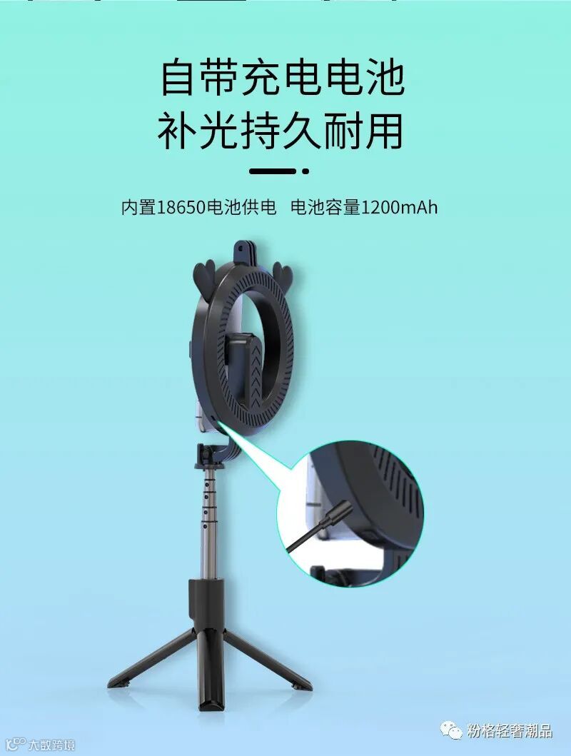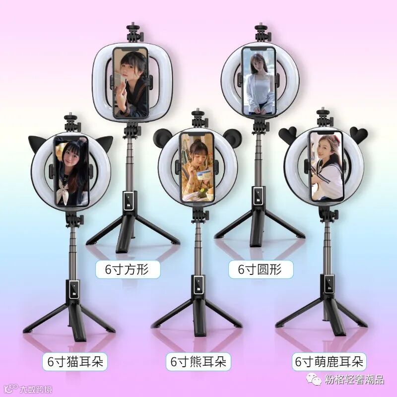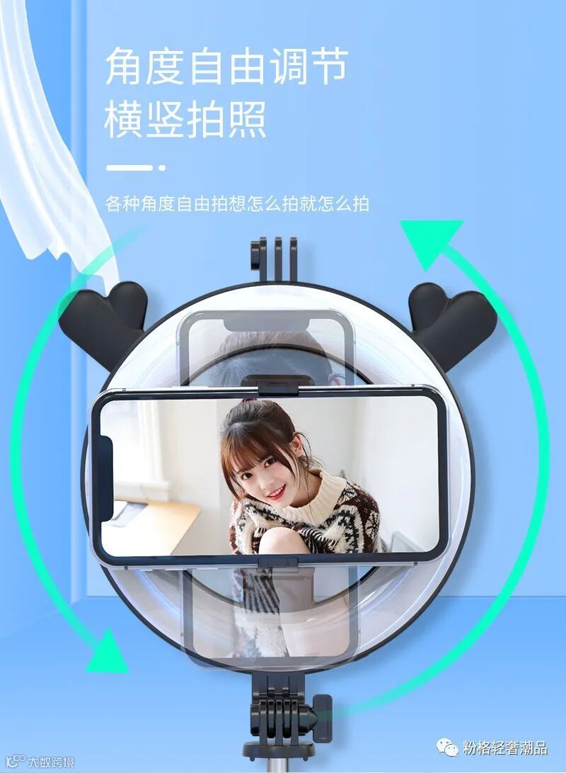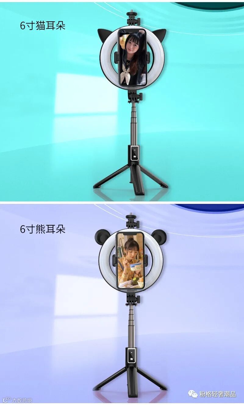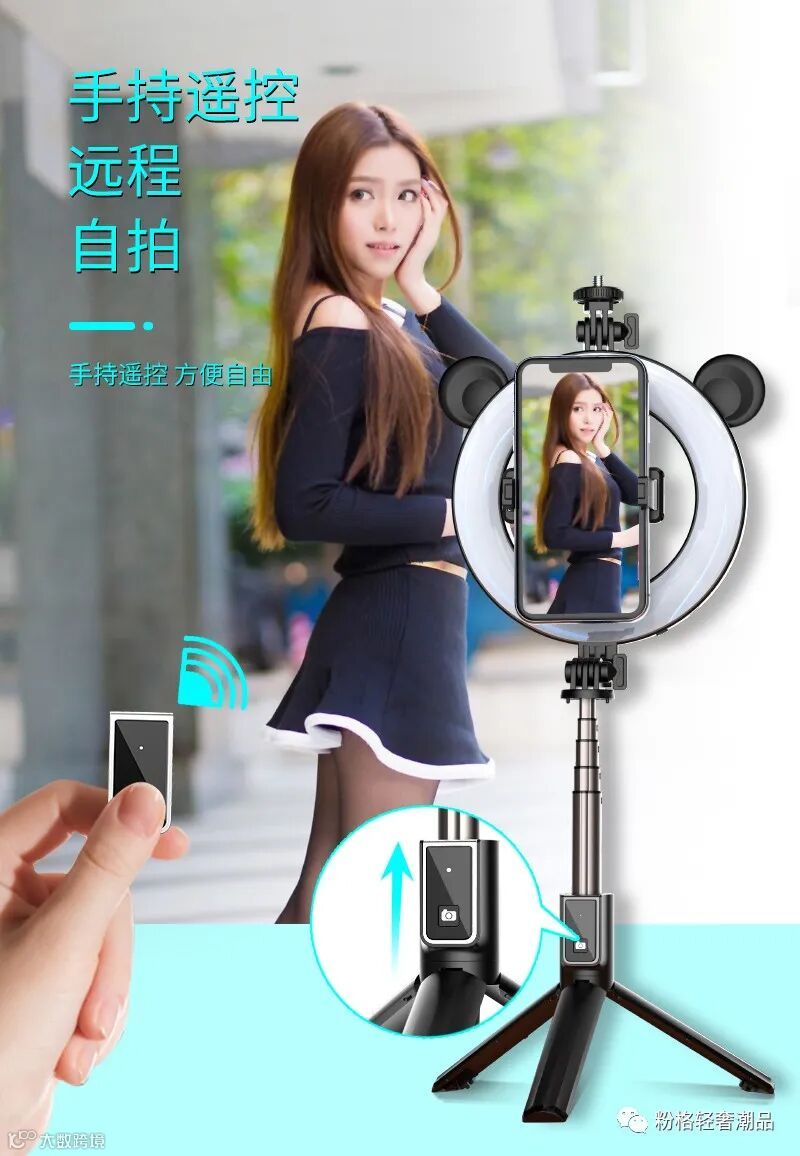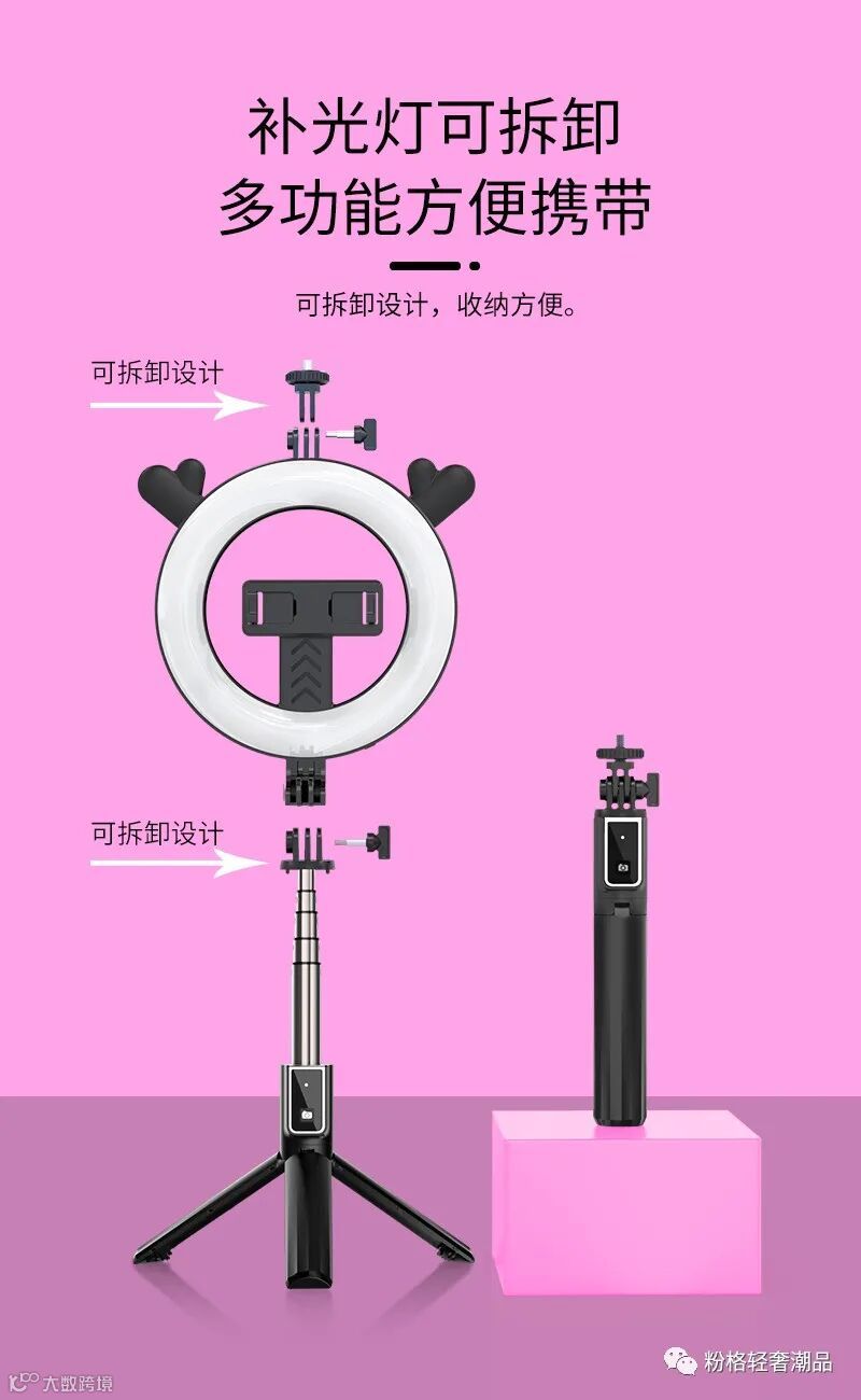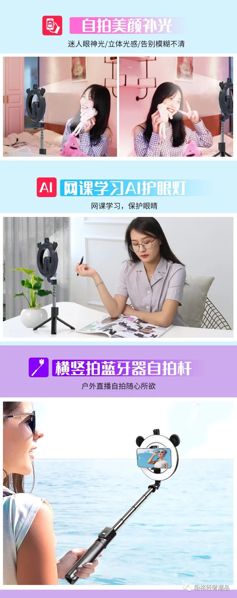 智能明肌直播支架RK-02是一款一体式环形灯自拍杆、美颜灯直播支架、网课学习AI护眼灯桌面支架、横竖拍蓝牙器自拍杆等,6寸美颜灯可做入门直播桌面支架使用,进口柔光罩材料搭配80颗冷暖灯珠打破黑暗噪点,让你直播眼有光 脸有神,三挡亮度调节,让你每个场合都是美美的女王。便携折叠设计,收纳自如,拉伸长92厘米折叠后仅22厘米,360度自由旋转,满足各种角度自拍。全铝合金伸缩杆与可收拢三脚架让拍摄更稳固,可卸蓝牙遥控器可更远距离自拍,解放双手拍出更美好的自己,自带电池,补光持久耐用,横竖拍夹子设计,让你自拍直播玩个够,有卡通版与普通版供你选择,5G直播短视频时代,赶紧下手抢购吧!