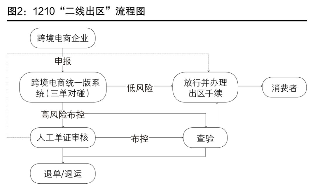 企业将商品批量出口至区域(中心),海关对其实行账册管理;企业在区域(中心)内完成理货、拼箱后,批量出口(1210)至海外仓,通过电子商务平台完成零售后再将商品从海外仓送达境外消费者的模式。