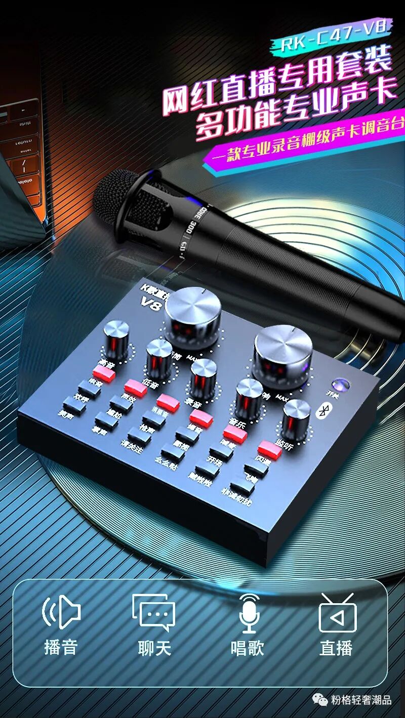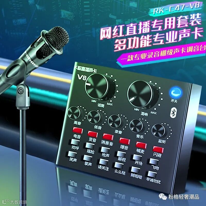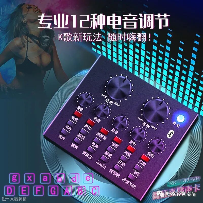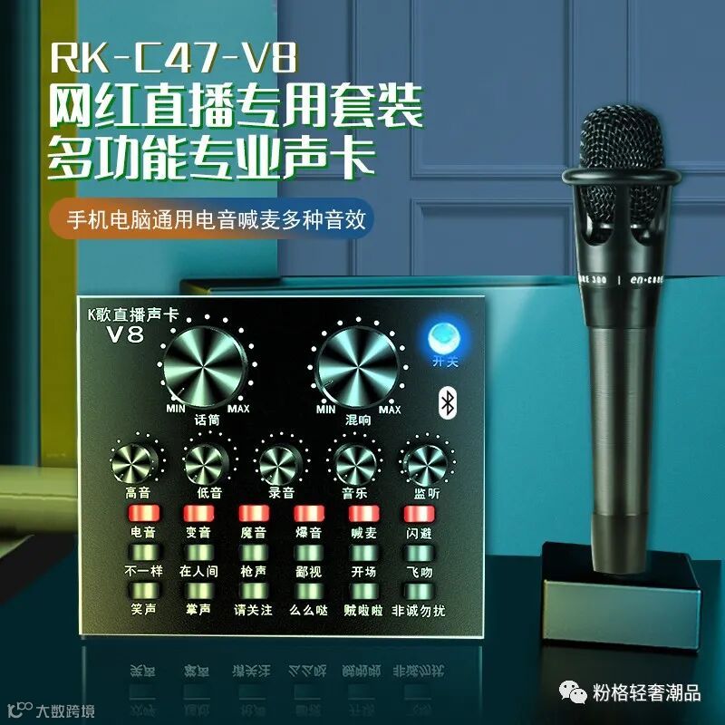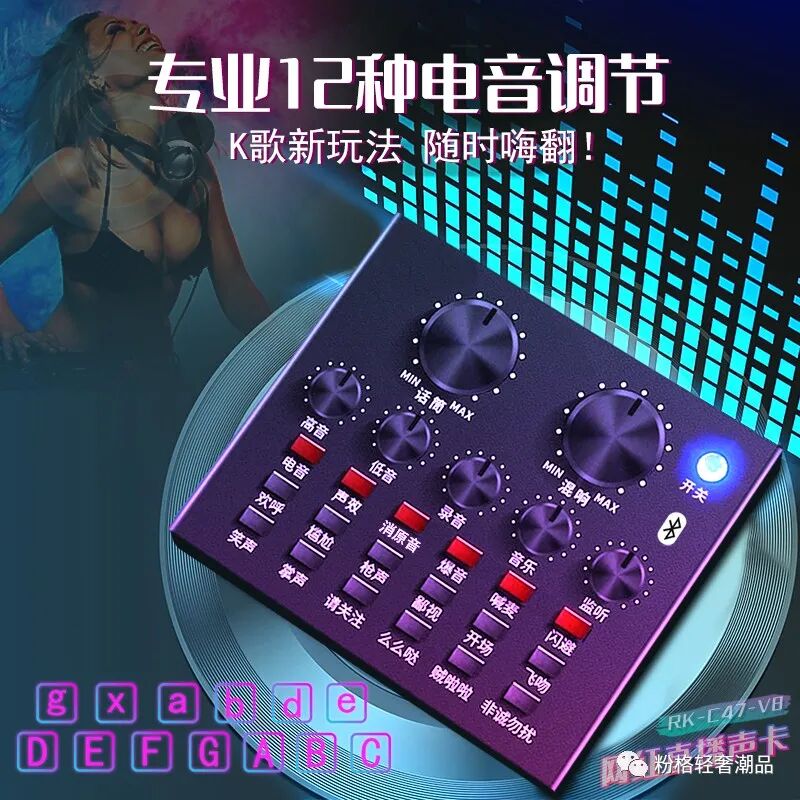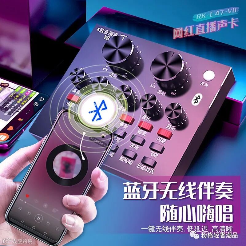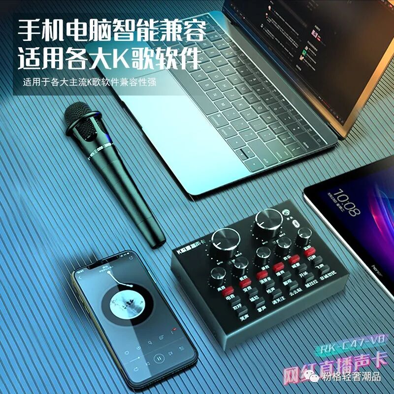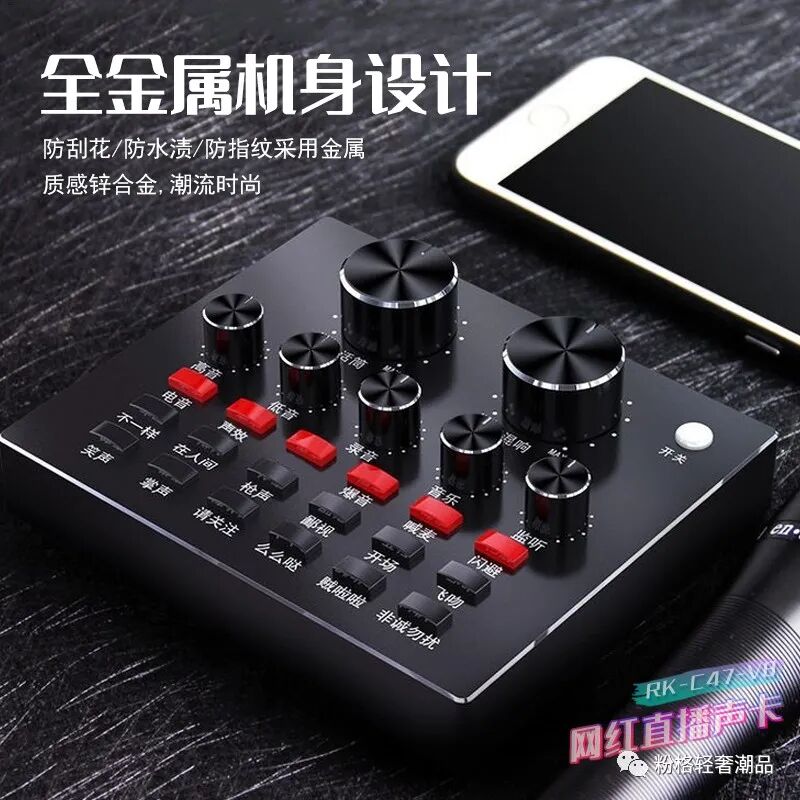 网红主播直播声卡套装RK-C47-V8,是一款专业录音棚级声卡调音台,一键开关,功能齐全,操作简单,新手主播易上手,手机电脑通用,铝合金材质,进口DSP智能降噪芯片、灵敏度高、噪音低、无线蓝牙伴奏,七大调节旋钮,均衡调节,舒适调音,12种电音基调、多种变声功能、多种直播控场音效、一键消原音,智能闪避,丰富接口,支持三台手机连接(两个直播,一个伴奏),实时耳返监听。12000毫安大容量电池可连续12小时直播,兼容市场主流软件,让直播更专业!真正的吸粉利器——网红主播直播声卡套装RK-C47-V8,这么好的直播设备,赶紧下手购买吧!