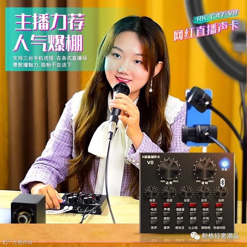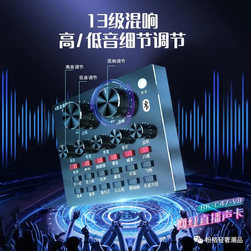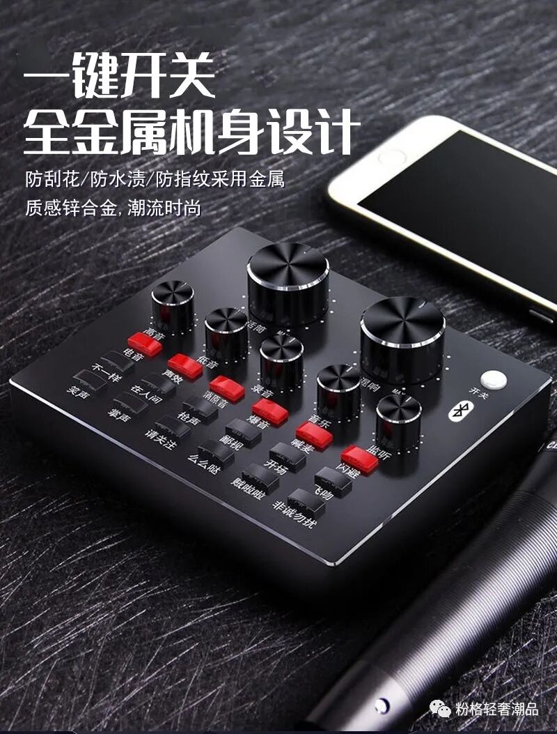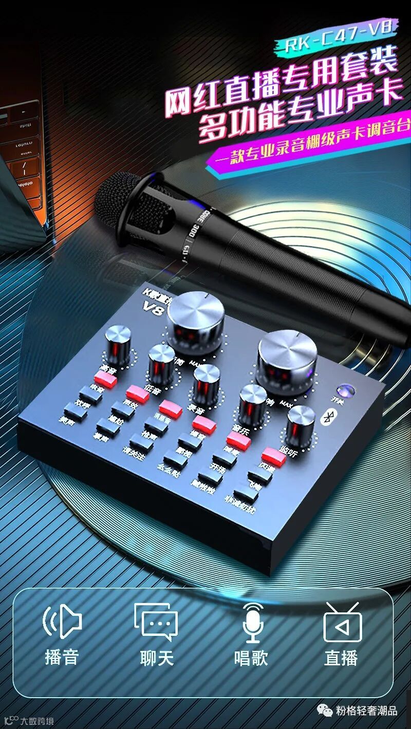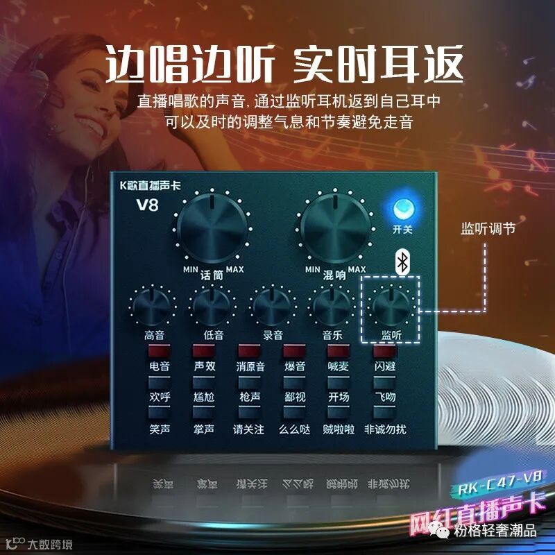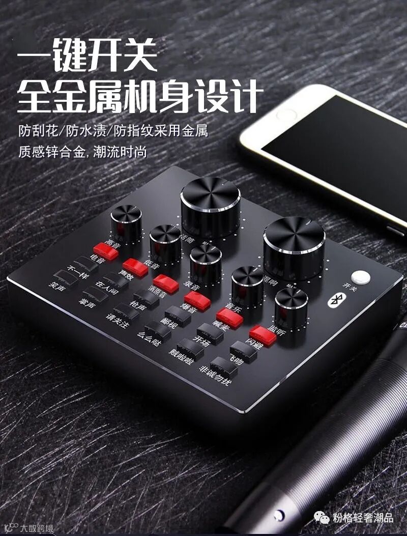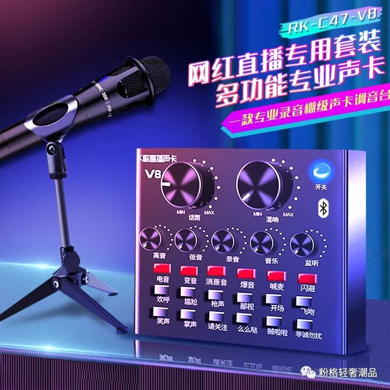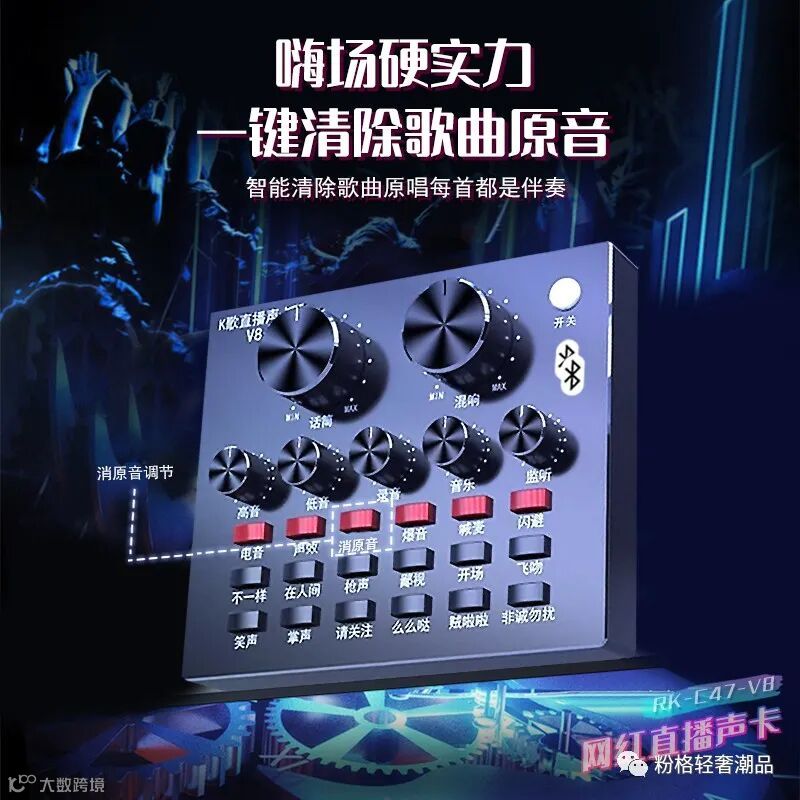 网红主播直播声卡套装RK-C47-V8,是一款专业录音棚级声卡调音台,一键开关,功能齐全,操作简单,新手主播易上手,手机电脑通用,铝合金材质,进口DSP智能降噪芯片、灵敏度高、噪音低、无线蓝牙伴奏,七大调节旋钮,均衡调节,舒适调音,12种电音基调、多种变声功能、多种直播控场音效、一键消原音,智能闪避,丰富接口,支持三台手机连接(两个直播,一个伴奏),实时耳返监听。12000毫安大容量电池可连续12小时直播,兼容市场主流软件,让直播更专业!真正的吸粉利器——网红主播直播声卡套装RK-C47-V8,这么好的直播设备,赶紧下手购买吧!