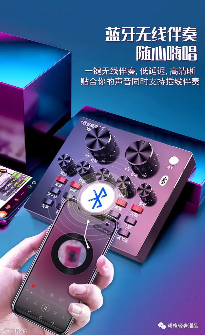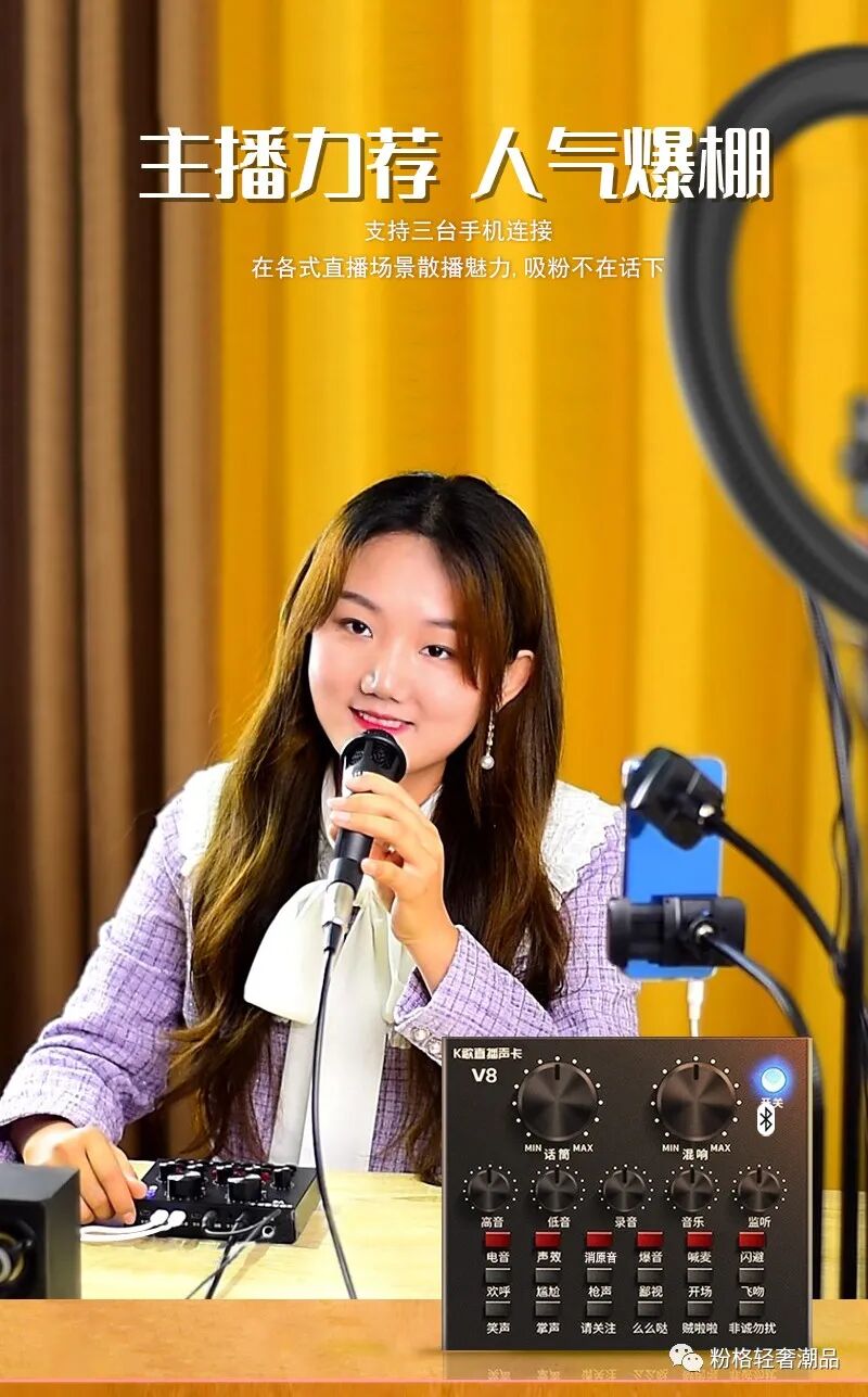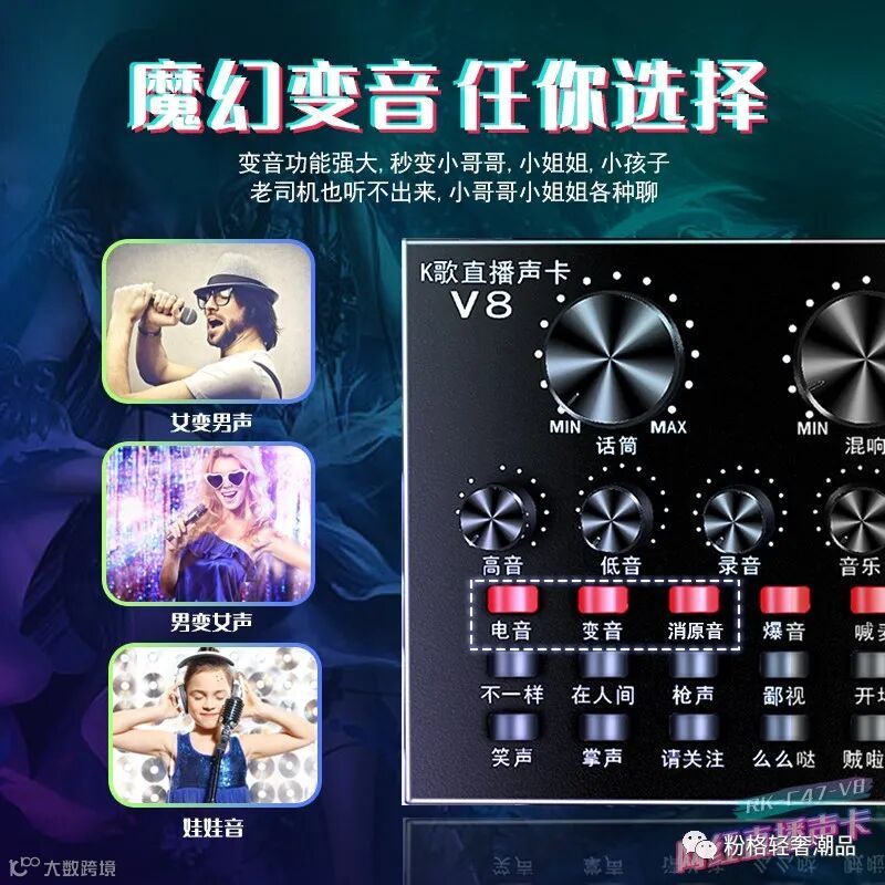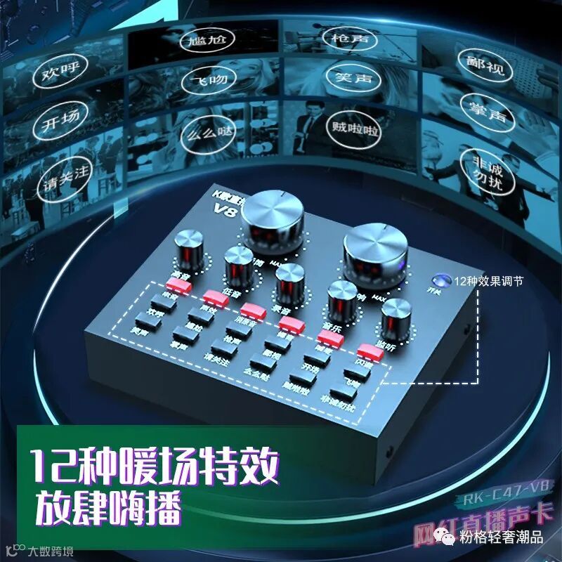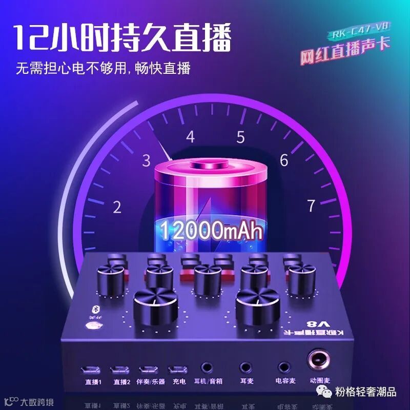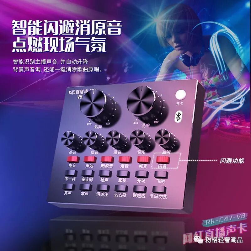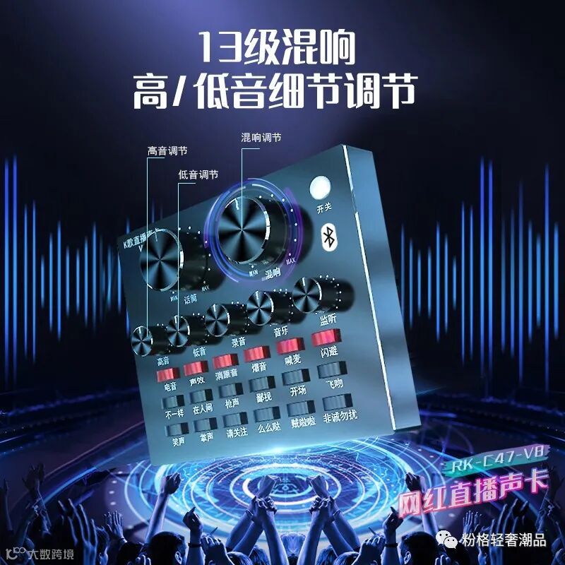 网红主播直播声卡套装RK-C47-V8,是一款专业录音棚级声卡调音台,一键开关,功能齐全,操作简单,新手主播易上手,手机电脑通用,铝合金材质,进口DSP智能降噪芯片、灵敏度高、噪音低、无线蓝牙伴奏,七大调节旋钮,均衡调节,舒适调音,12种电音基调、多种变声功能、多种直播控场音效、一键消原音,智能闪避,丰富接口,支持三台手机连接(两个直播,一个伴奏),实时耳返监听。12000毫安大容量电池可连续12小时直播,兼容市场主流软件,让直播更专业!真正的吸粉利器——网红主播直播声卡套装RK-C47-V8,这么好的直播设备,赶紧下手购买吧!