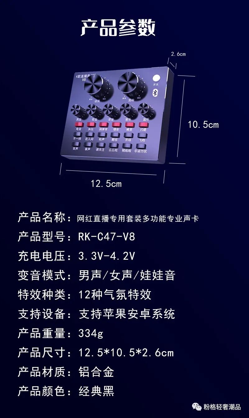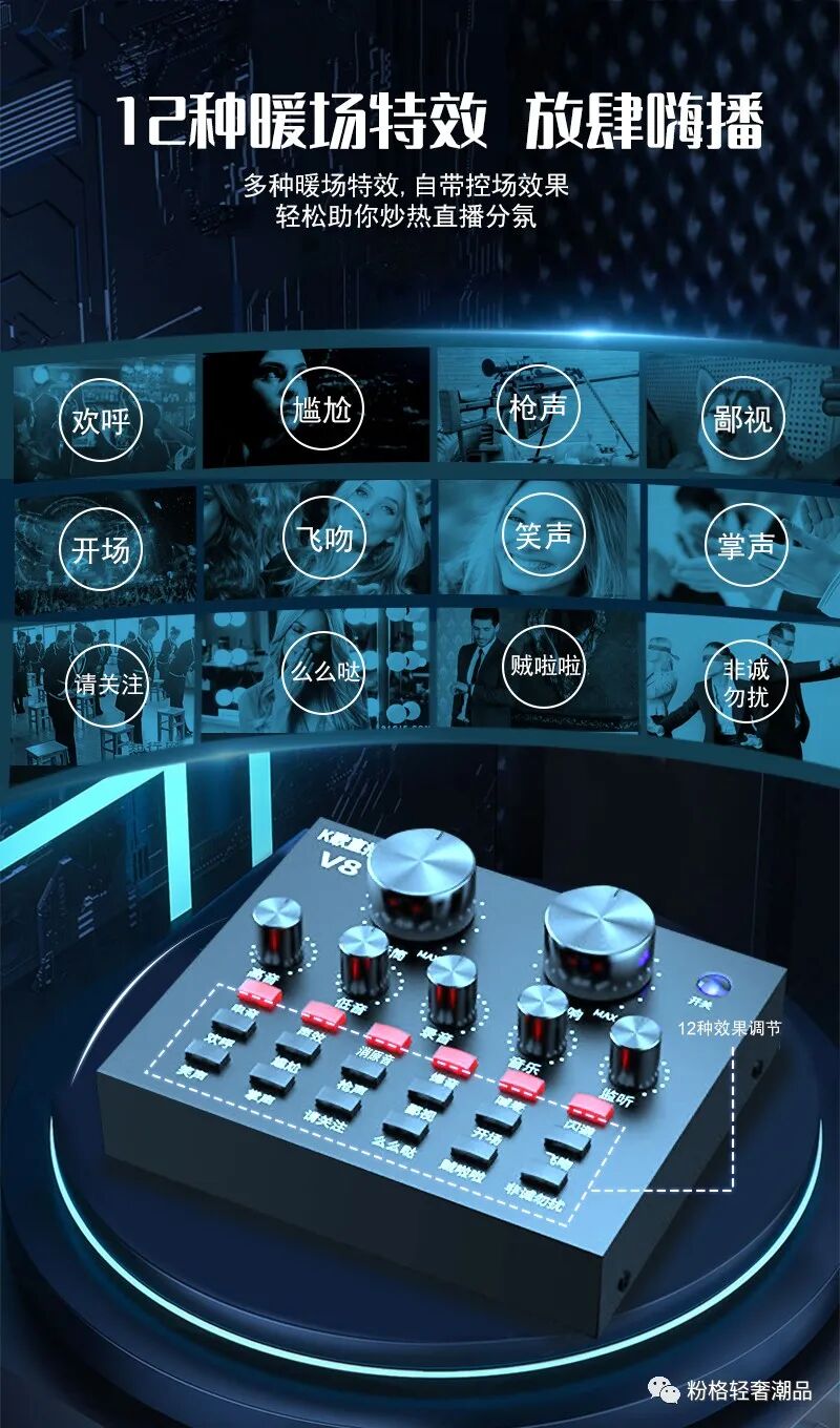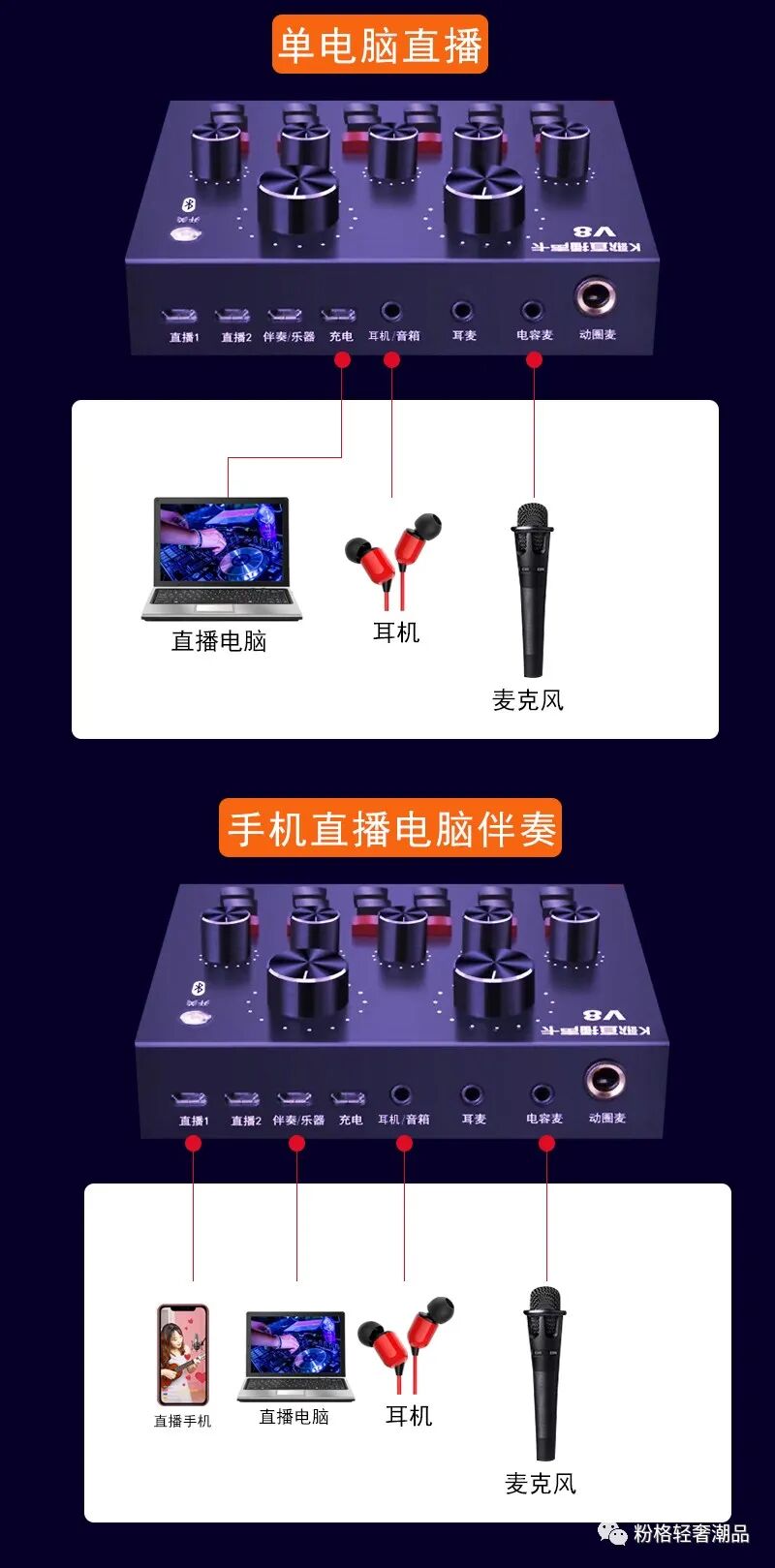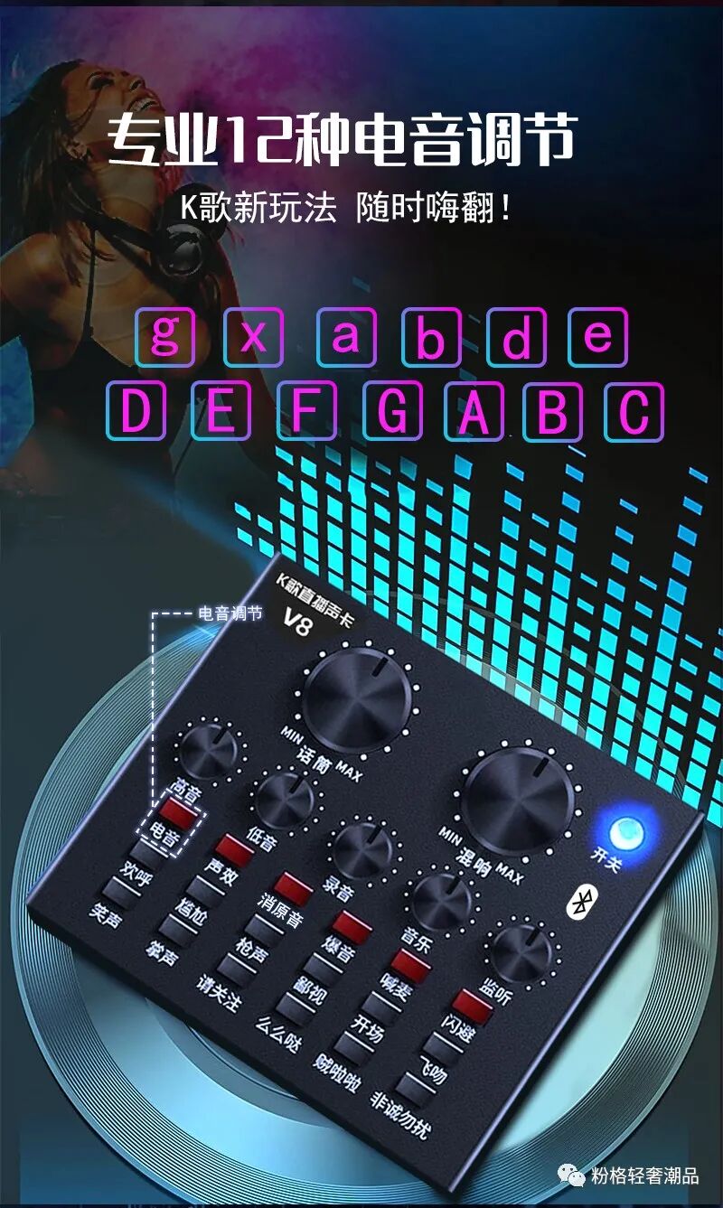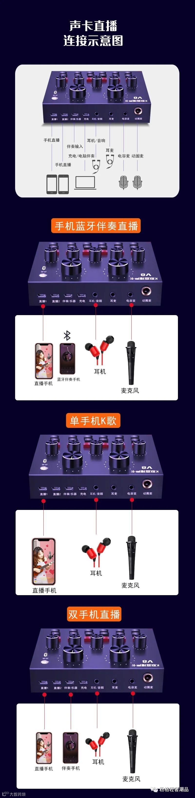 网红主播直播声卡套装RK-C47-V8,是一款专业录音棚级声卡调音台,一键开关,功能齐全,操作简单,新手主播易上手,手机电脑通用,铝合金材质,进口DSP智能降噪芯片、灵敏度高、噪音低、无线蓝牙伴奏,七大调节旋钮,均衡调节,舒适调音,12种电音基调、多种变声功能、多种直播控场音效、一键消原音,智能闪避,丰富接口,支持三台手机连接(两个直播,一个伴奏),实时耳返监听。12000毫安大容量电池可连续12小时直播,兼容市场主流软件,让直播更专业!真正的吸粉利器——网红主播直播声卡套装RK-C47-V8,这么好的直播设备,赶紧下手购买吧!