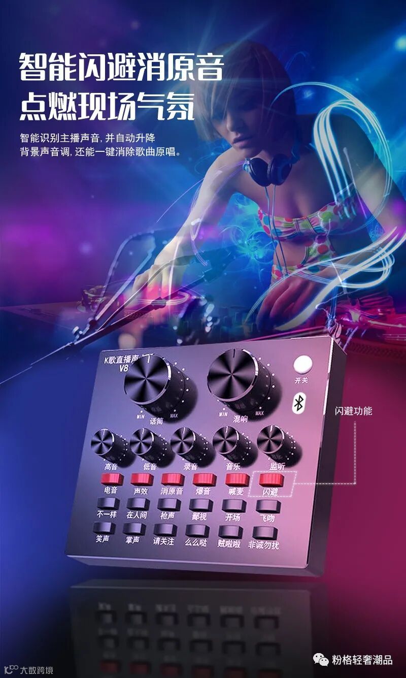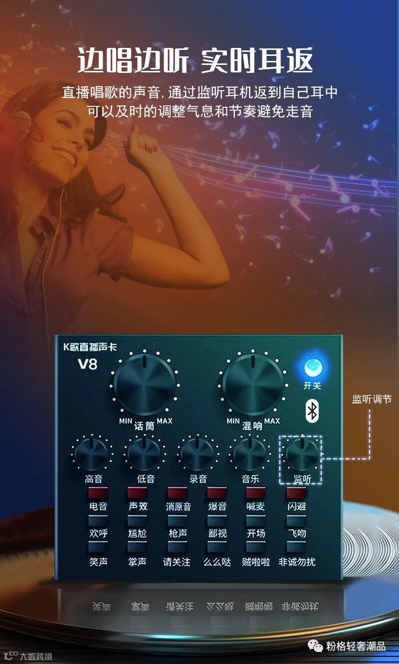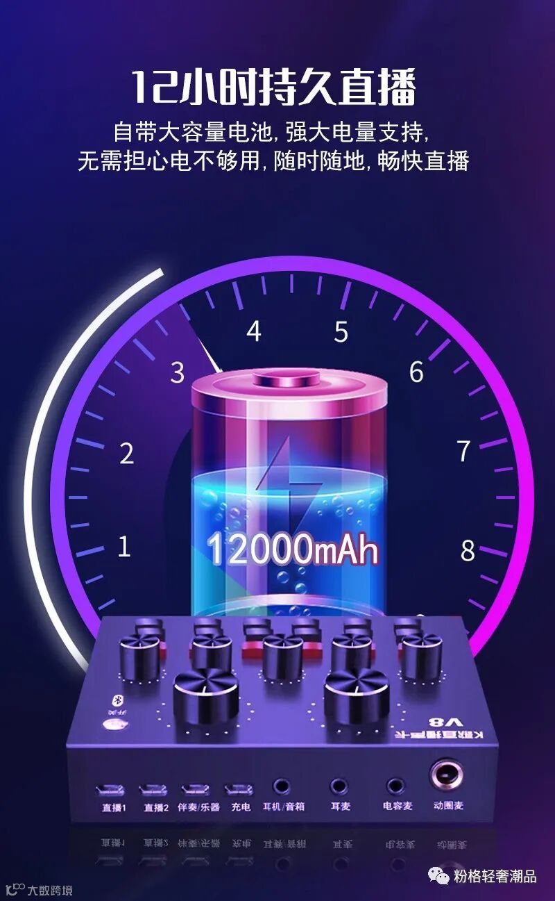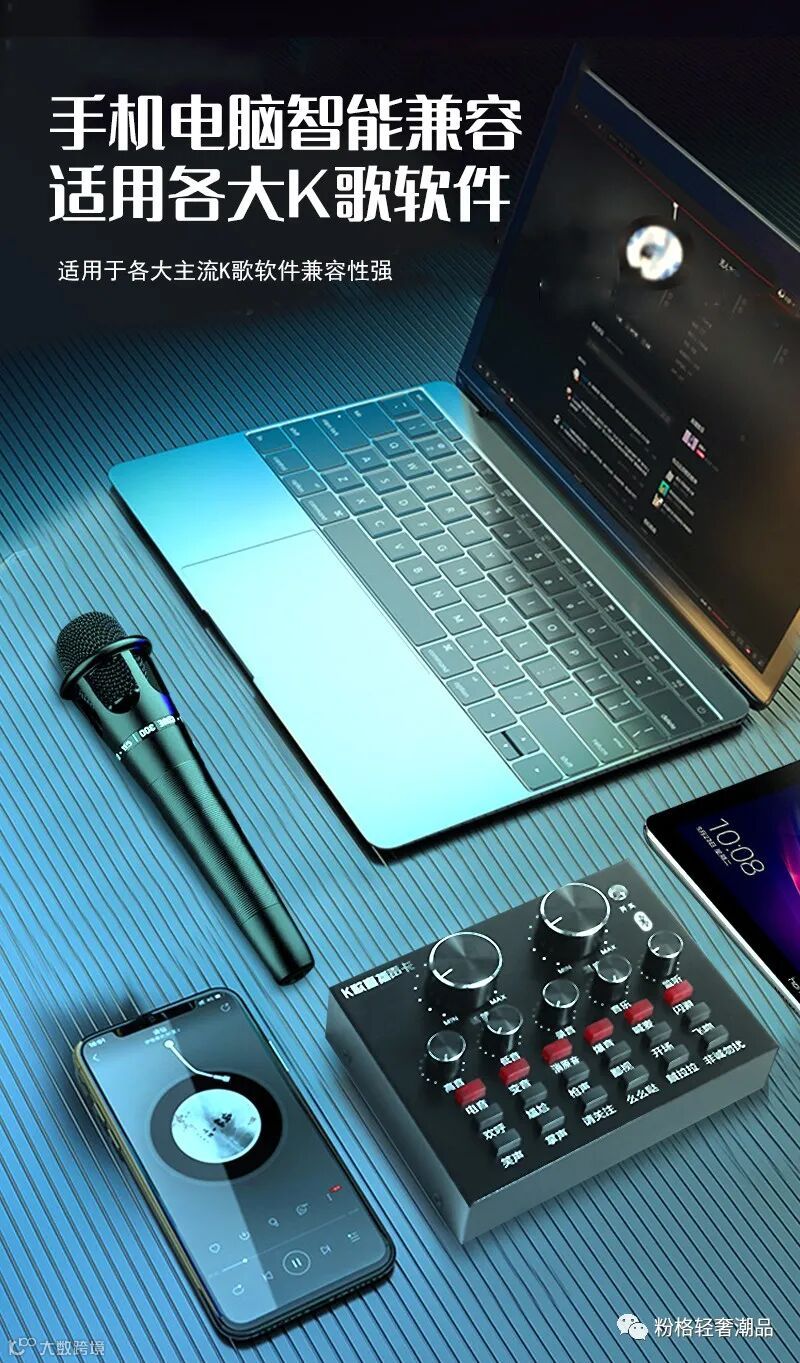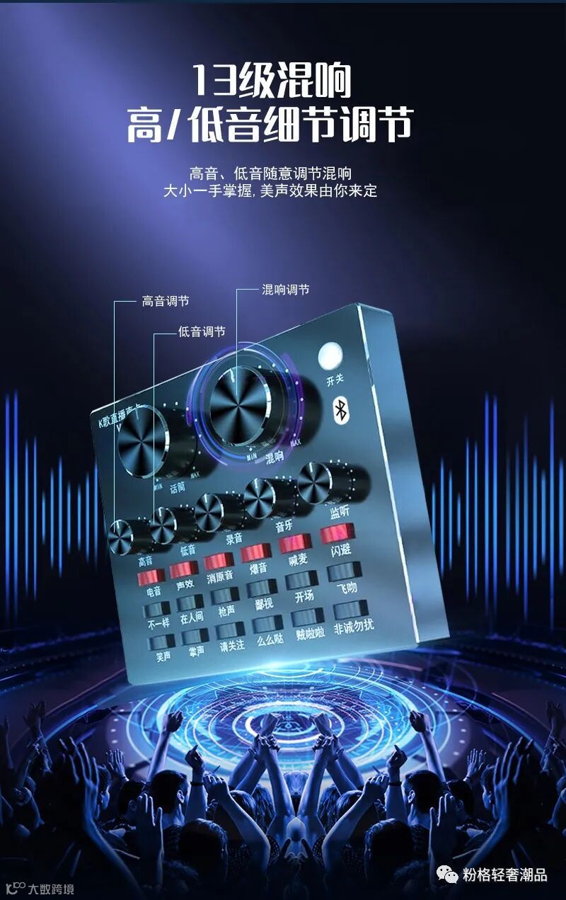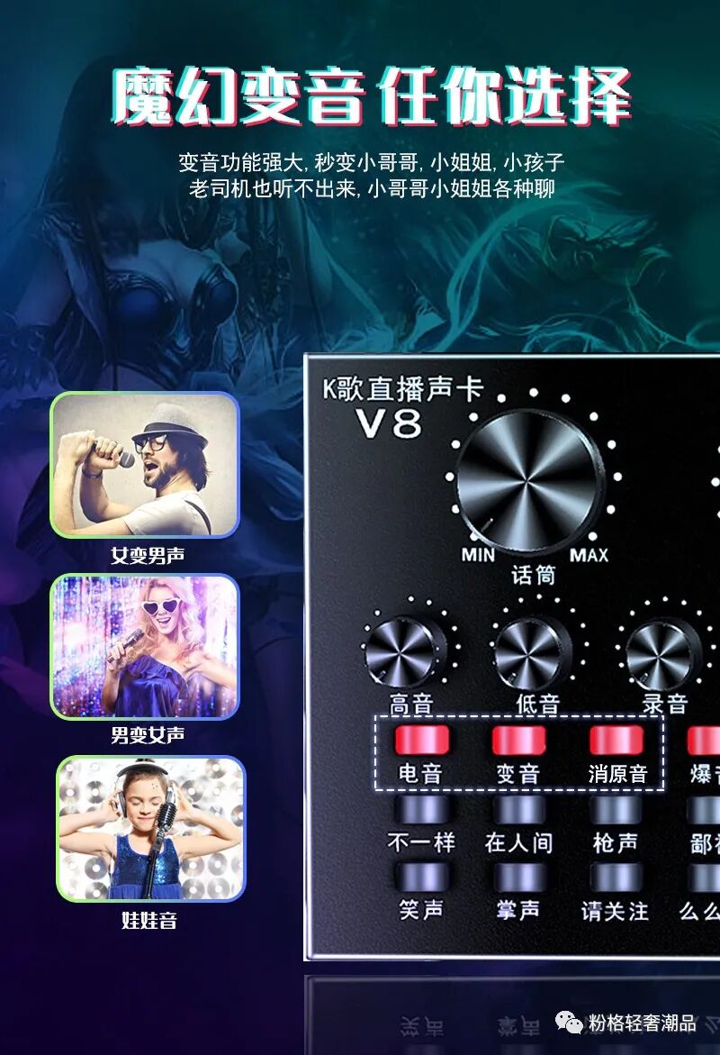 网红主播直播声卡套装RK-C47-V8,是一款专业录音棚级声卡调音台,一键开关,功能齐全,操作简单,新手主播易上手,手机电脑通用,铝合金材质,进口DSP智能降噪芯片、灵敏度高、噪音低、无线蓝牙伴奏,七大调节旋钮,均衡调节,舒适调音,12种电音基调、多种变声功能、多种直播控场音效、一键消原音,智能闪避,丰富接口,支持三台手机连接(两个直播,一个伴奏),实时耳返监听。12000毫安大容量电池可连续12小时直播,兼容市场主流软件,让直播更专业!真正的吸粉利器——网红主播直播声卡套装RK-C47-V8,这么好的直播设备,赶紧下手购买吧!