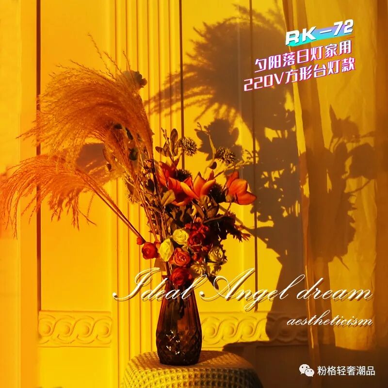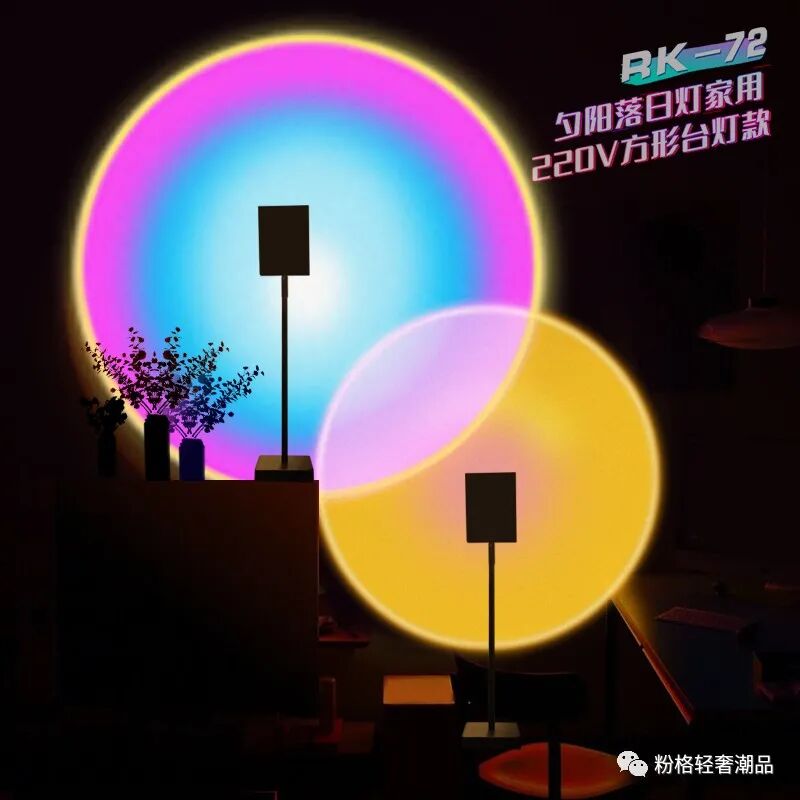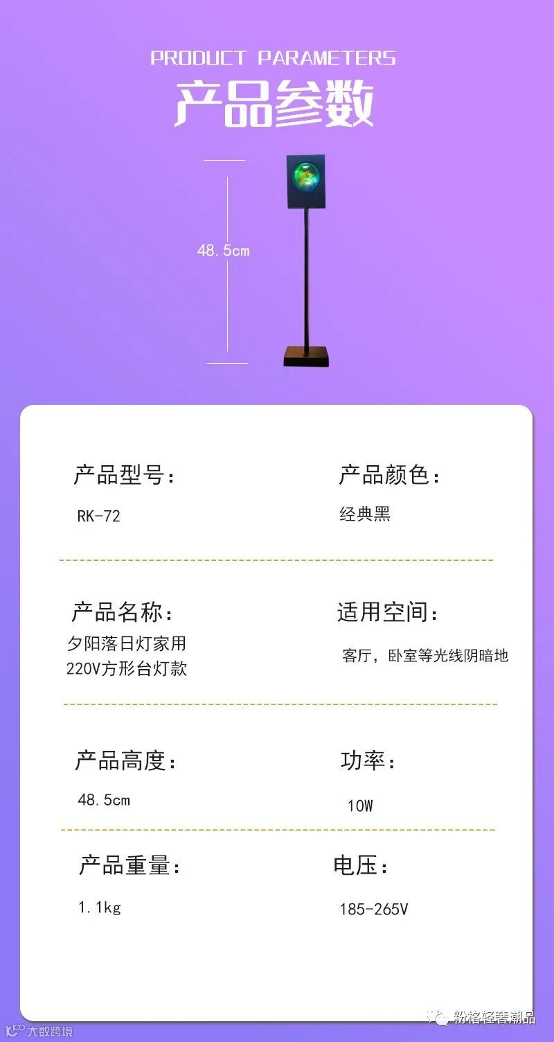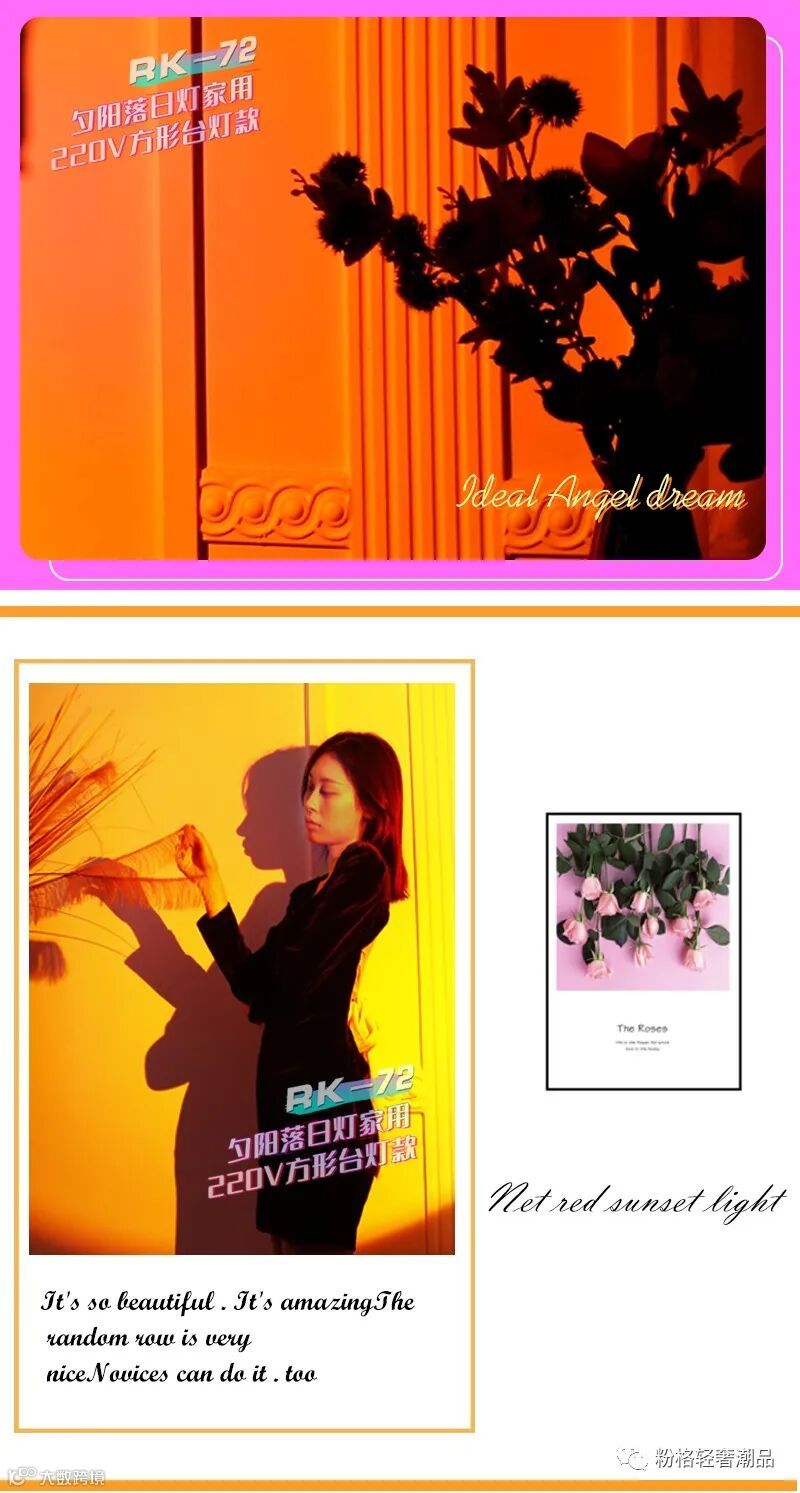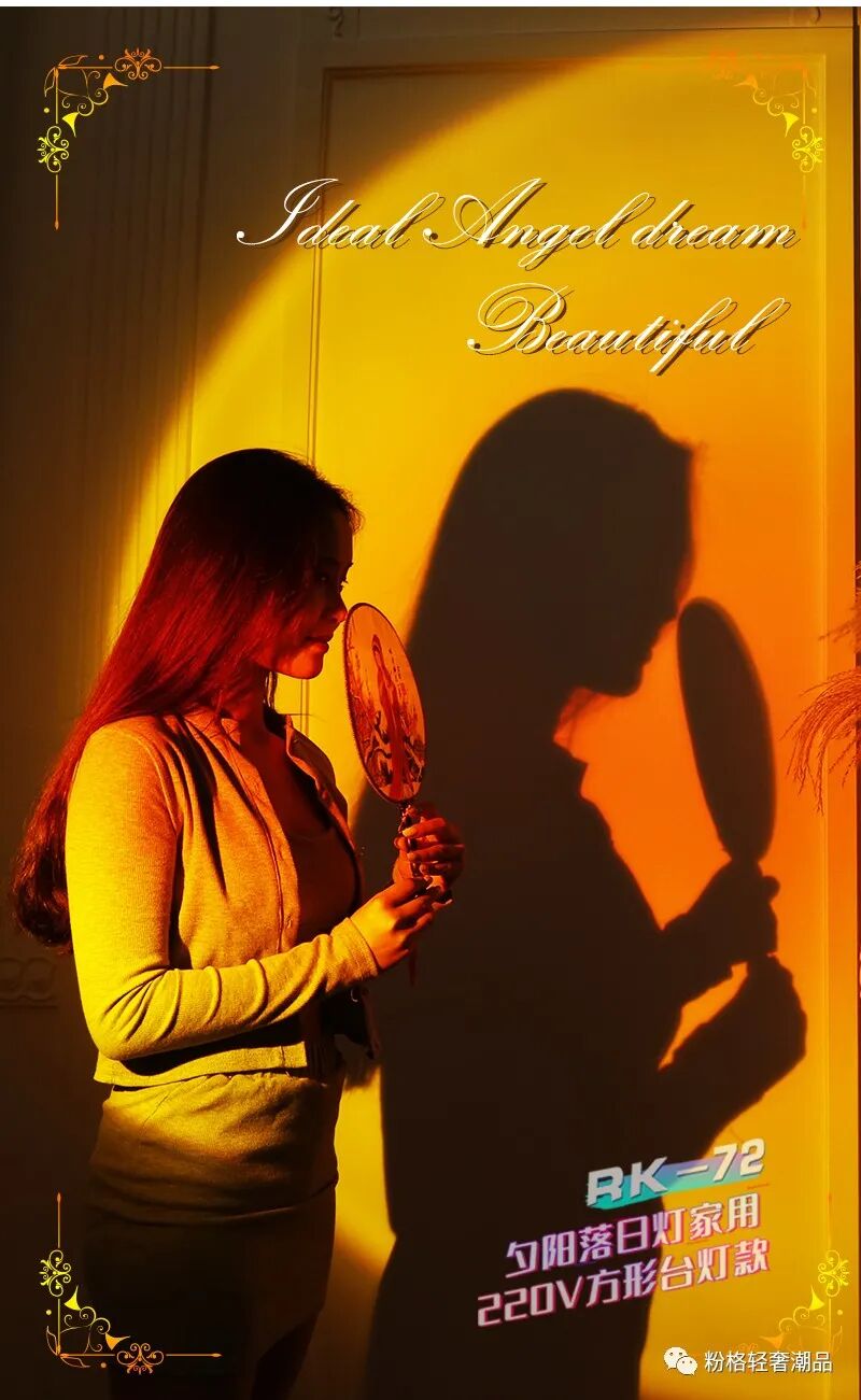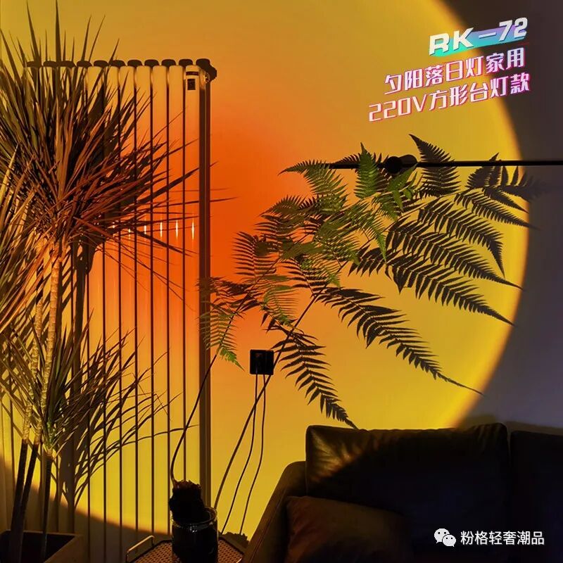 夕阳落日灯RK-72家用220V方形台灯款带你一起在家看日落之美,就像夕阳落在墙壁上,氛围浪漫,网红夕阳落日灯款RK-72是一款电源输入为185V-265V的高亮家用款夕阳灯,打破USB供电不足导致的亮度不够,厚实的散热铝材,长期使用温度不高,网红小姐姐拍摄必备神器,动感舞姿伴侣、各种投影浪漫氛围情景,夕阳落日、雨后彩虹、夕阳红等,自主外观设计,无需担心侵权,销售无忧!
