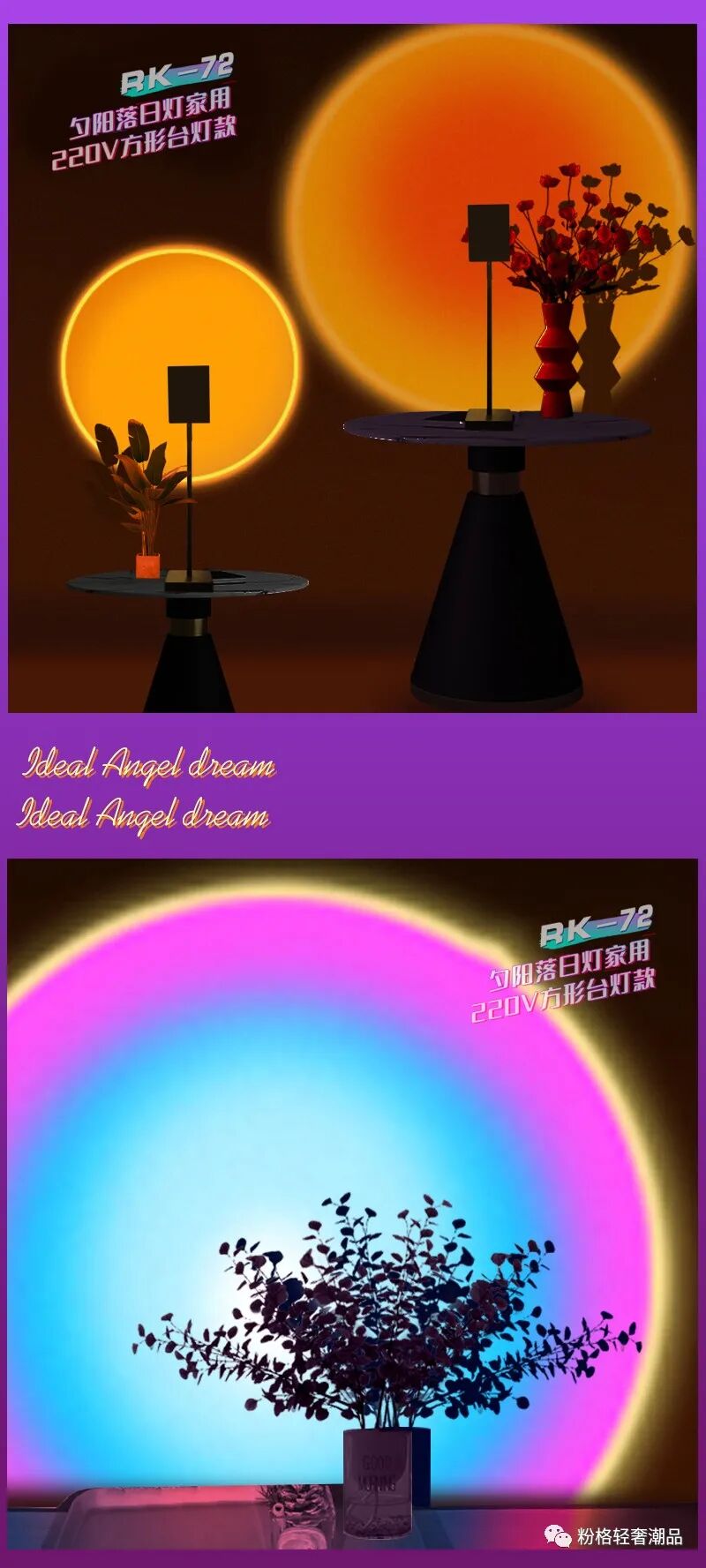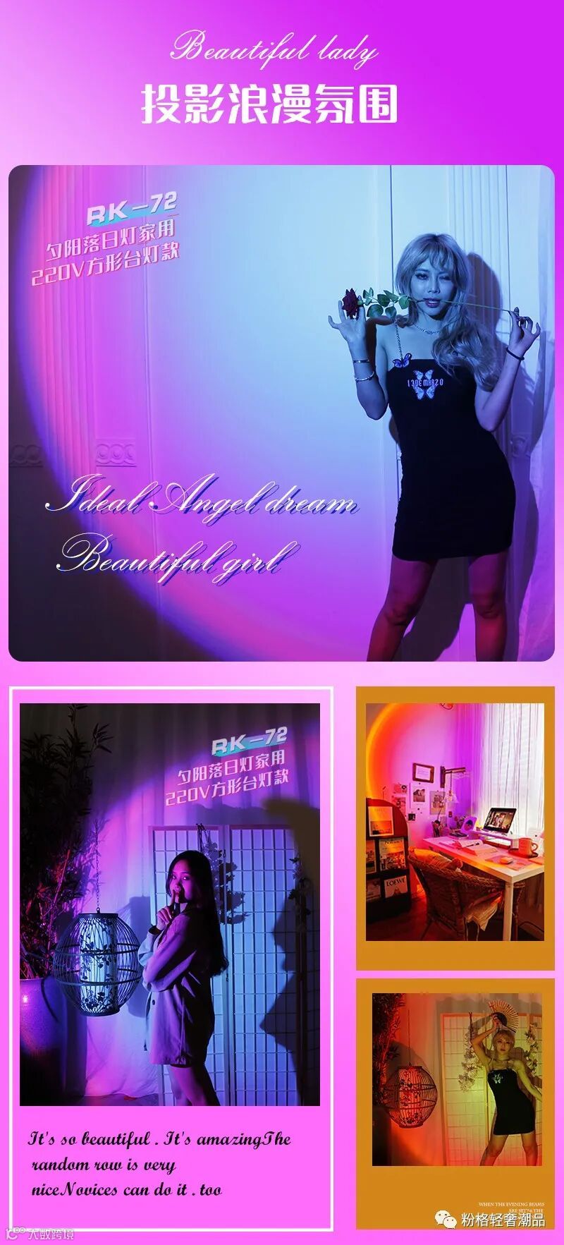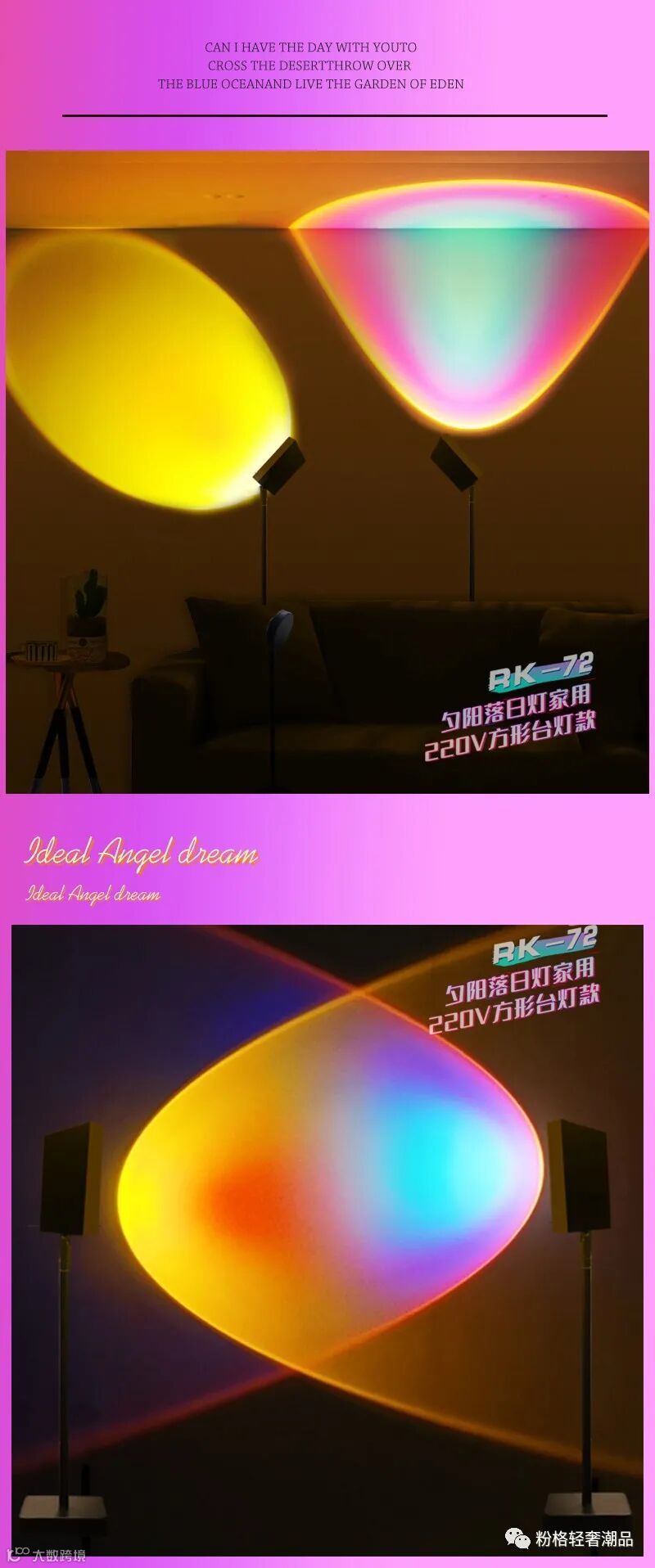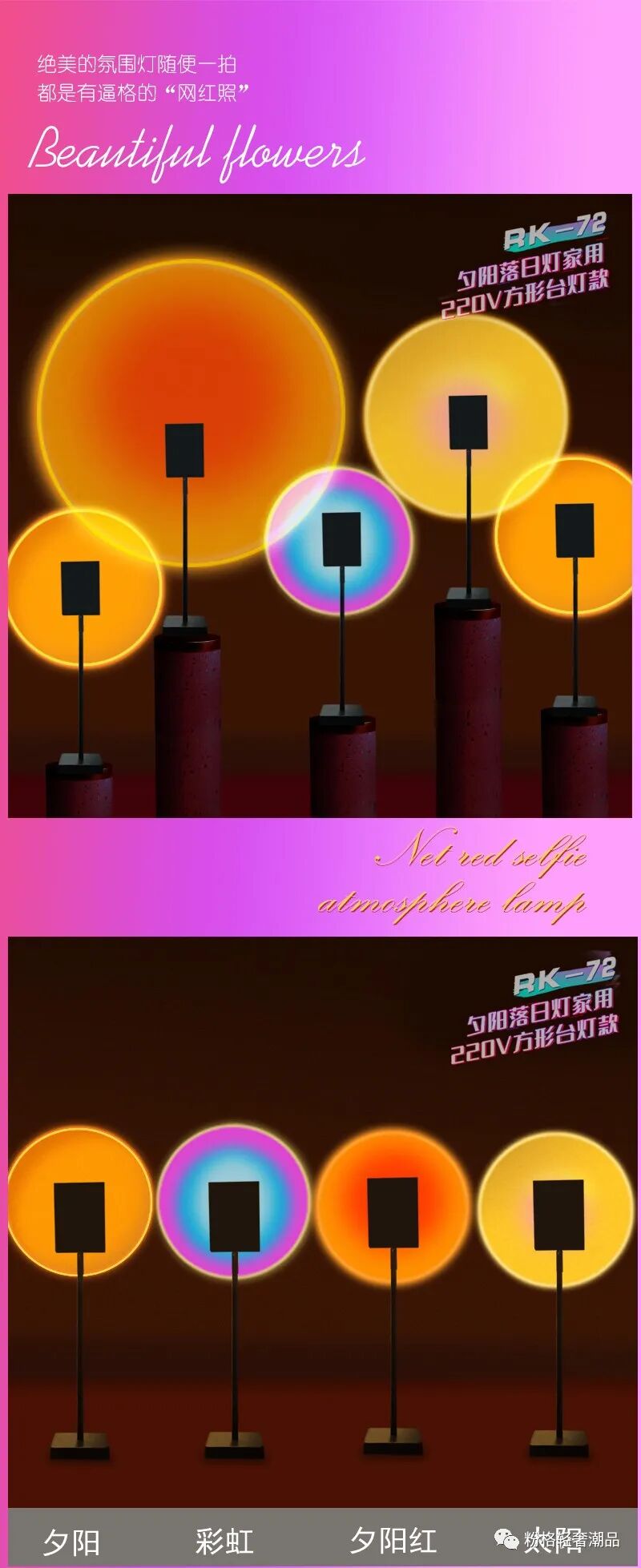 夕阳落日灯RK-72家用220V方形台灯款带你一起在家看日落之美,就像夕阳落在墙壁上,氛围浪漫,网红夕阳落日灯款RK-72是一款电源输入为185V-265V的高亮家用款夕阳灯,打破USB供电不足导致的亮度不够,厚实的散热铝材,长期使用温度不高,网红小姐姐拍摄必备神器,动感舞姿伴侣、各种投影浪漫氛围情景,夕阳落日、雨后彩虹、夕阳红等,自主外观设计,无需担心侵权,销售无忧!