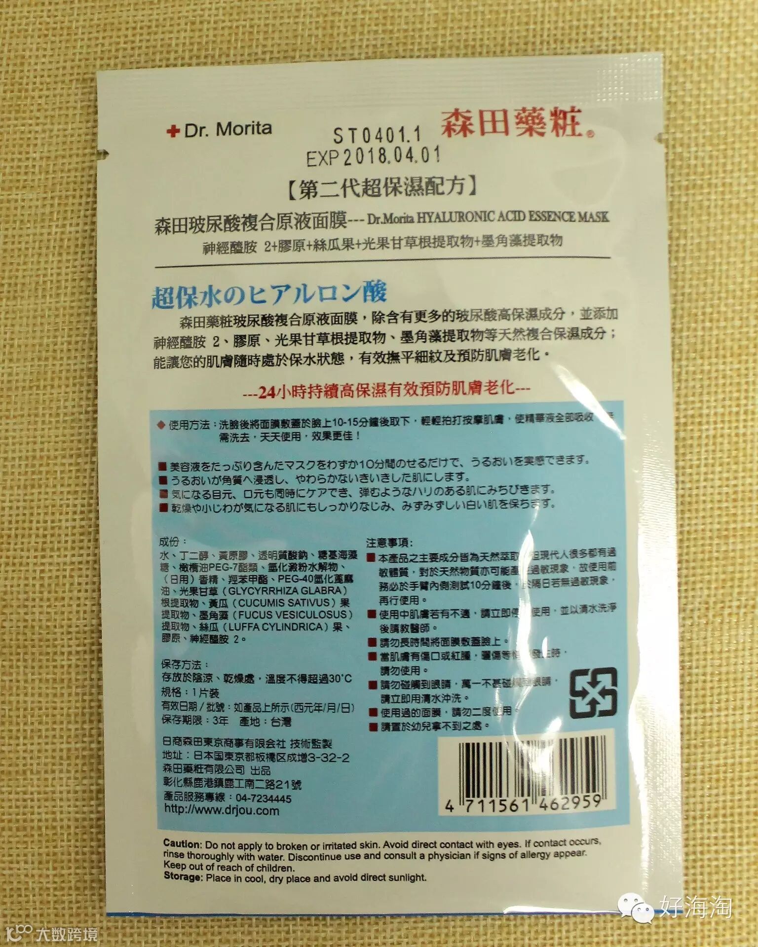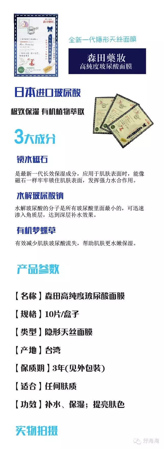 来自宝岛台湾的热销美妆产品——台湾森田玻尿酸复合原液面膜,让肌肤在这个冬季在水润盈透中绽放光彩!