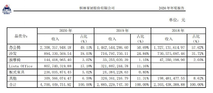 占比最大的是办公椅,2020年营收约23.08亿元,占到其总营收的49.11%;