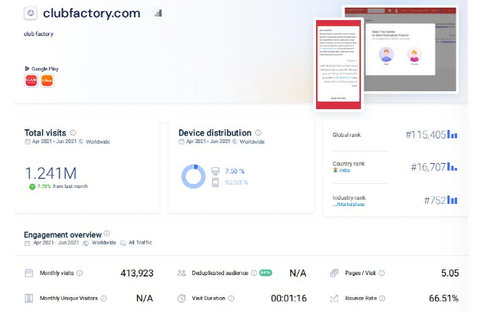 Club Factory的访问量中,92.5%来自于移动端,印度对其APP的封杀造成十分严重的后果。目前其在印度网站排名中排到了16707名,商超类网站排名在752名。