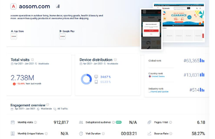 根据SimilarWeb数据,2021年4-6月份,遨森主要独立站aosom.com总访问量达到了273.8万,月均访问量达到了约91.28万。