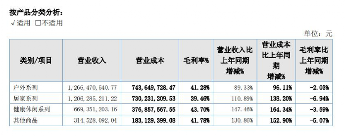 遨森户外系列产品,2020年营收约12.66亿元,有庭院木椅、沙滩椅、帐篷等产品;