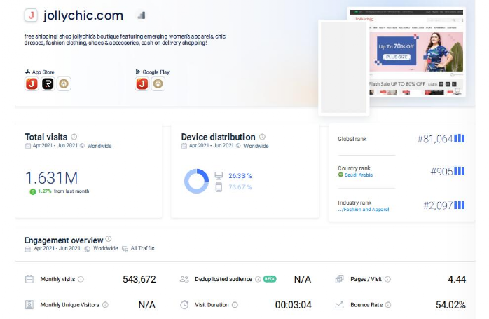目前Jollychic在2021年4-6月份总访问量达到了163.1万,月均访问量约54.27万。访客平均访问时间约3分04秒,平均访问页面4.44页,跳出率约54.02%,这个数据在中东地区还算可以。