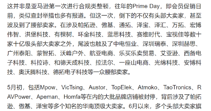 在这一波封号中,除了帕拓逊、通拓、泽宝、有棵树等几十亿超级卖家之外,一些中尾部的卖家,也遭到了关店处理,包括中电恒业、深圳瑞泰、深圳赫思、广州泰阳、蒙智拓、沃峰户外、航亚电商等。