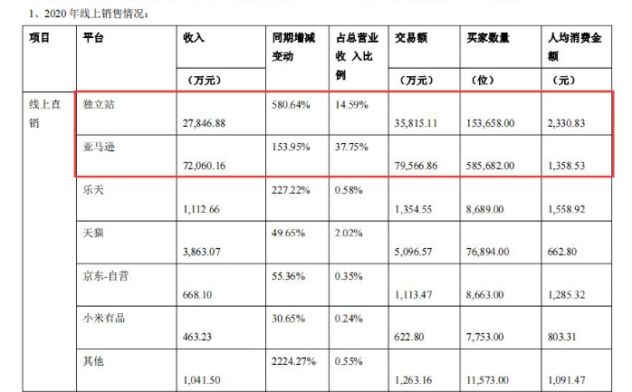 当然,其最主要的收入渠道,还是亚马逊,2020年营收约7.21亿元,占比37.75%,位列营收渠道第一位。