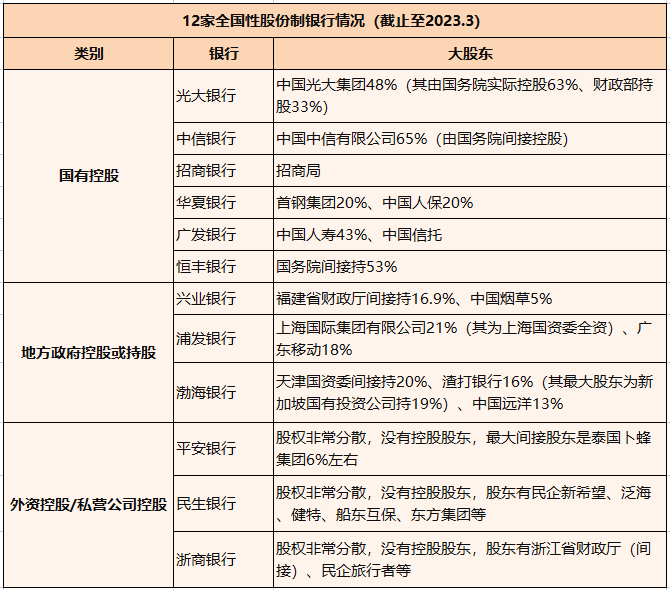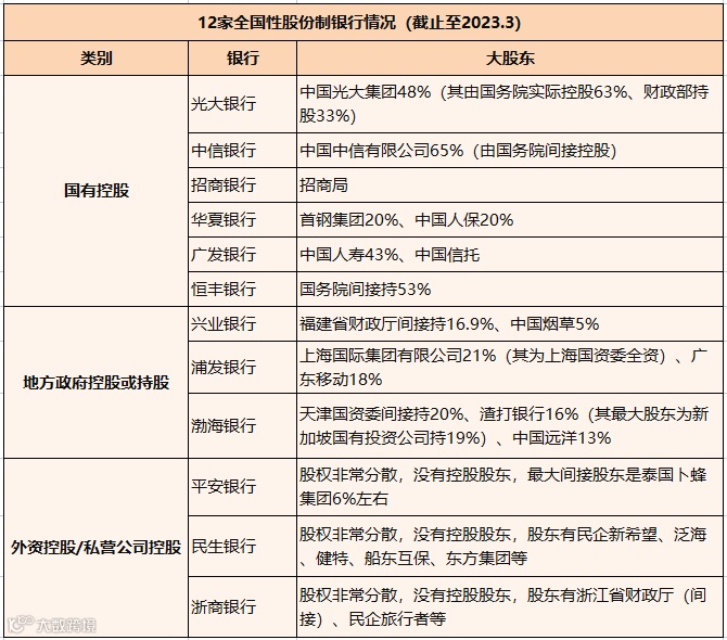 说得不好听,他们如果出事,造成的社会影响力比较大, 国家出面兜底的可能性也增大了。这12家全国性股份制公司的股东情况我都给大家总结好了,看股东你就明白了: