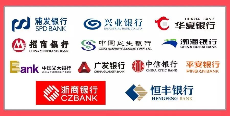 招商银行、浦发银行、中信银行、中国光大银行、华夏银行、中国民生银行、广发银行、兴业银行、平安银行、恒丰银行、浙商银行、渤海银行。
