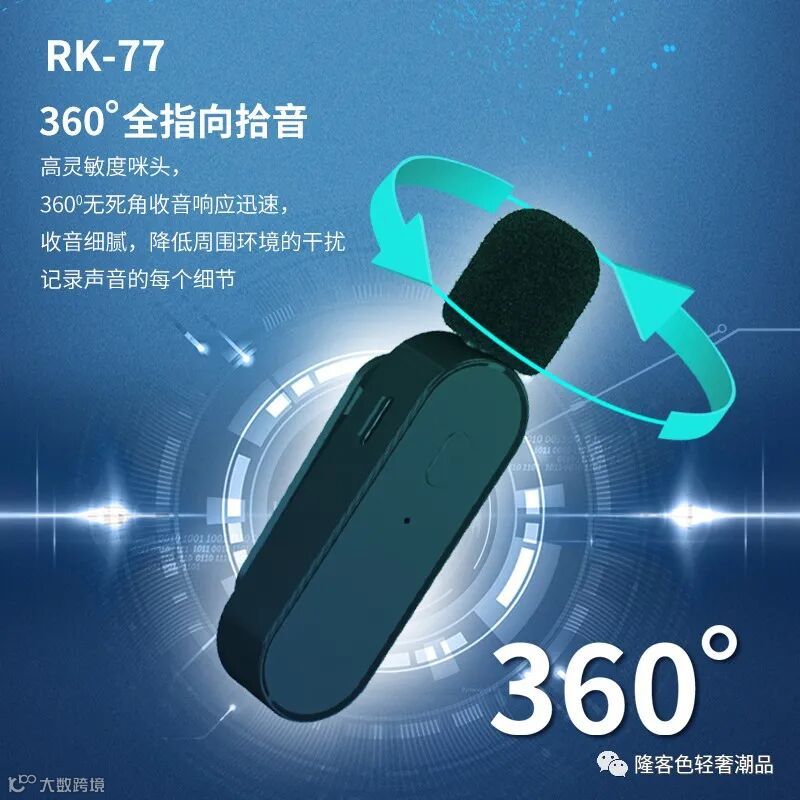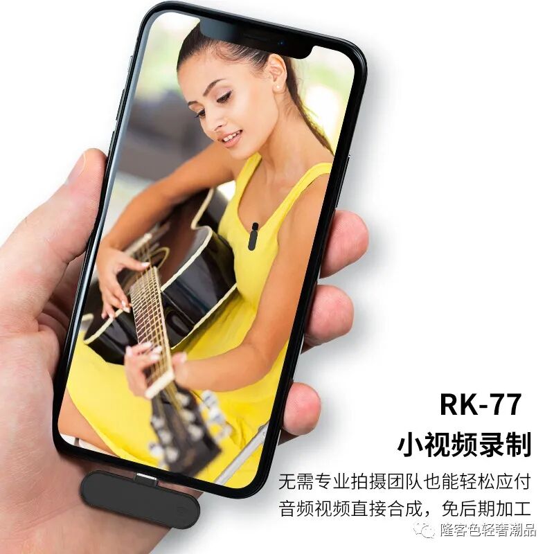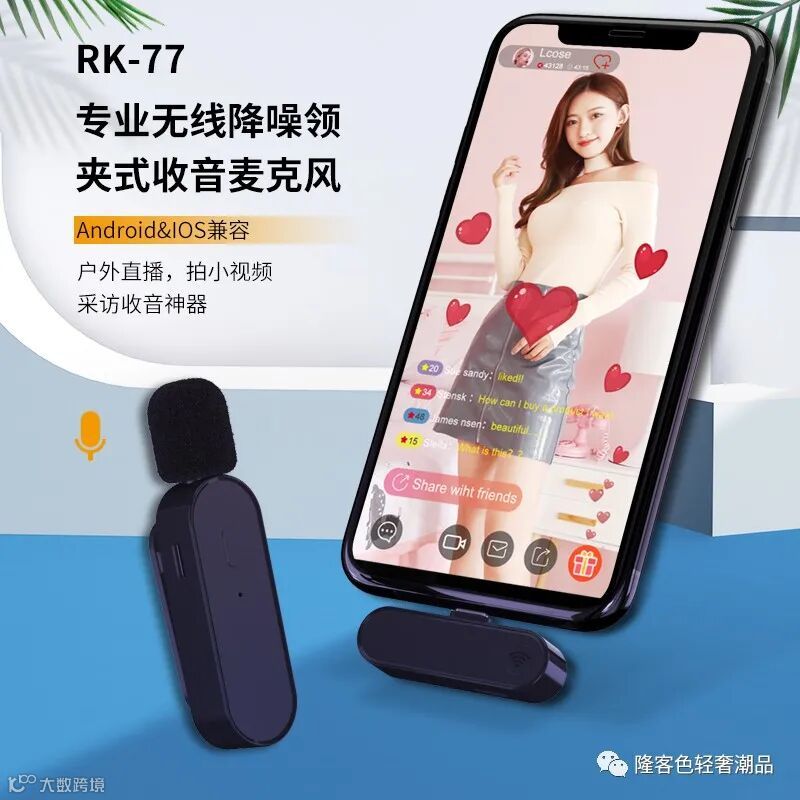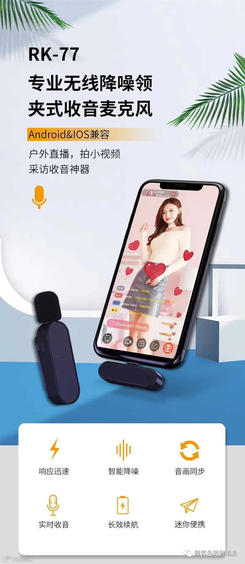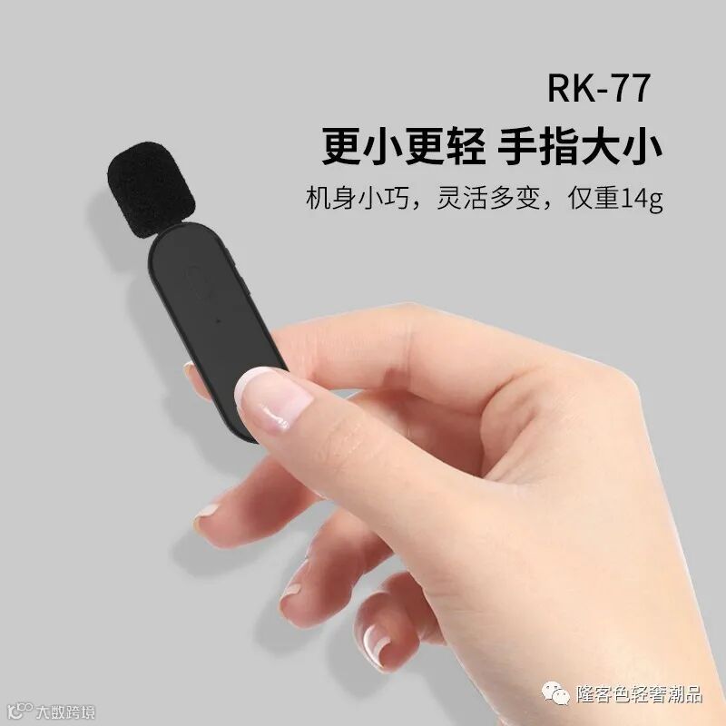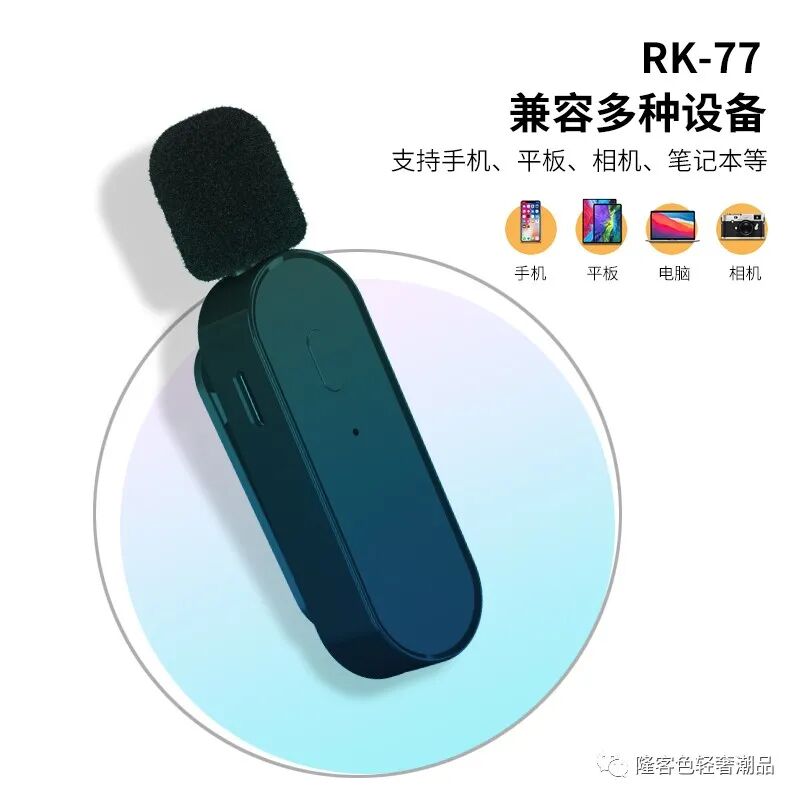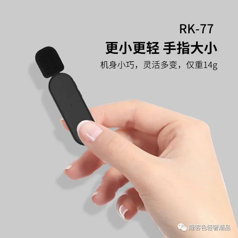 专业无线降噪领夹式收音麦克风RK-77,即插即用,一键开关机,无需繁琐操作,领夹式设计,佩戴方便,360°高清环绕拾音,远距离无线传输,信号稳定,使用前后效果反差明显,内置降噪系统,远程收音效果可媲美专业收音设备,嘈杂的环境也可以实现高保真音质,兼容安卓/苹果系统,内置大容量电池,Type-C快速充电,8小时续航,RK-77适用于直播录制、吃播、唱歌、网课教学、视频录制、采访录音等多种场景,黑科技智能降噪芯片,畅享高品质麦克,小巧迷你,方便携带,这么好的收音设备,赶紧下手购买吧!