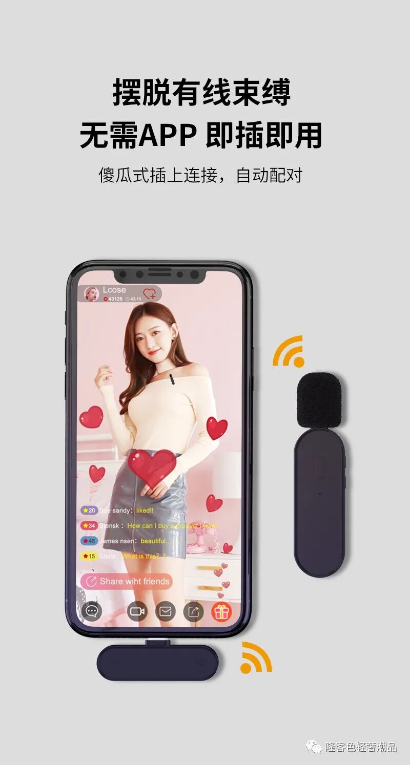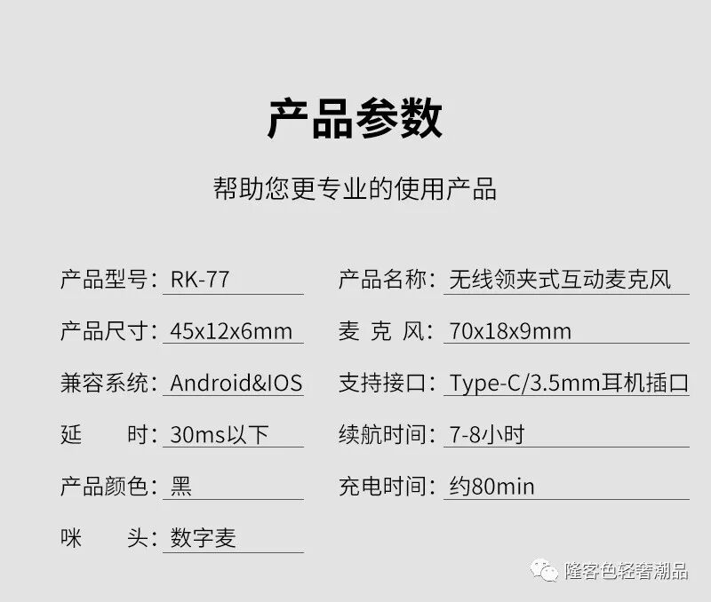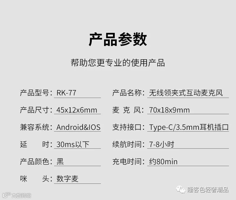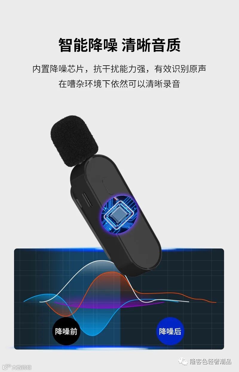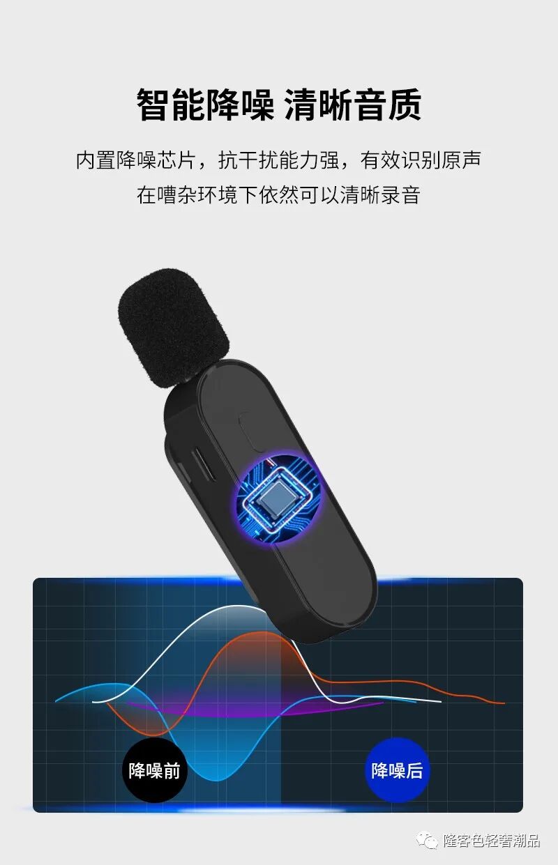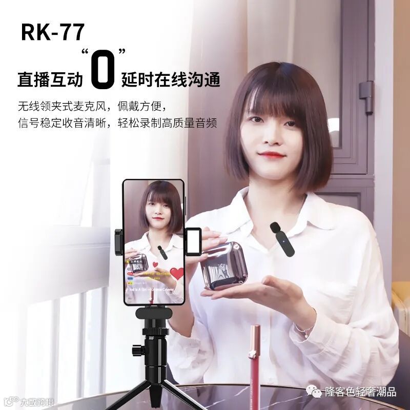 专业无线降噪领夹式收音麦克风RK-77,即插即用,一键开关机,无需繁琐操作,领夹式设计,佩戴方便,360°高清环绕拾音,远距离无线传输,信号稳定,使用前后效果反差明显,内置降噪系统,远程收音效果可媲美专业收音设备,嘈杂的环境也可以实现高保真音质,兼容安卓/苹果系统,内置大容量电池,Type-C快速充电,8小时续航,RK-77适用于直播录制、吃播、唱歌、网课教学、视频录制、采访录音等多种场景,黑科技智能降噪芯片,畅享高品质麦克,小巧迷你,方便携带,这么好的收音设备,赶紧下手购买吧!