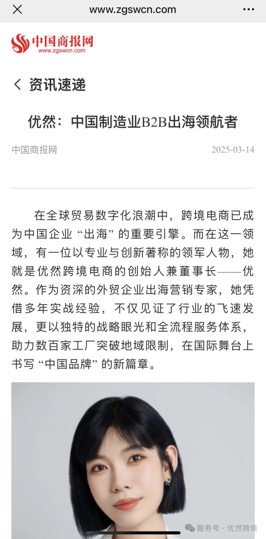 在全球贸易数字化的当下,跨境电商如同一艘巨轮,承载着中国企业驶向国际市场的梦想。近期,中国商报网对优然跨境电商进行了专题报道,再次印证了优然在B2B出海领域的领航地位。
