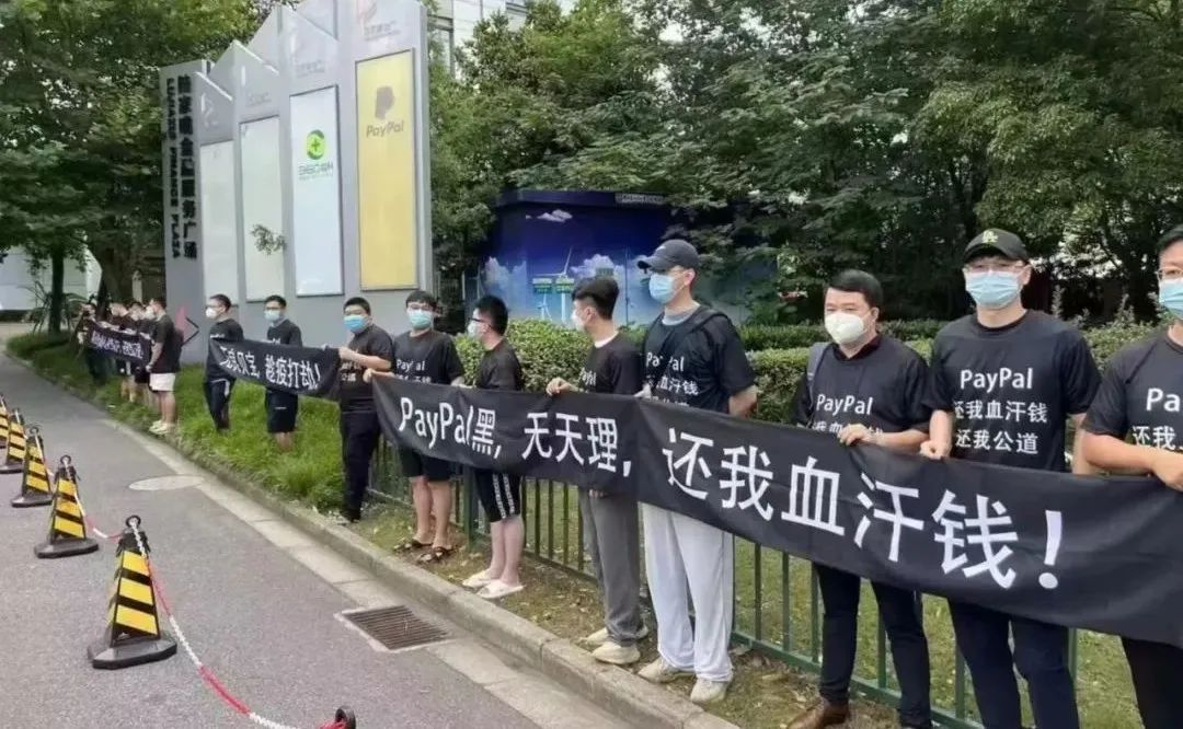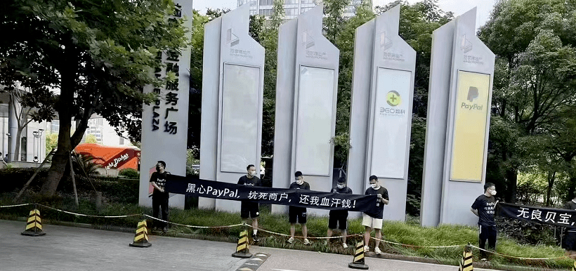 于是到了6月8日,那些走头部路的中国独立站卖家们只能抛开脸面穿印着“PayPal,还我血汗钱,还我公道”字眼的黑色T恤,在上海PayPal总部拉着写有“心PayPal,坑死商户,还我血汗钱”、“无良贝宝,趁疫打劫”横幅维权。