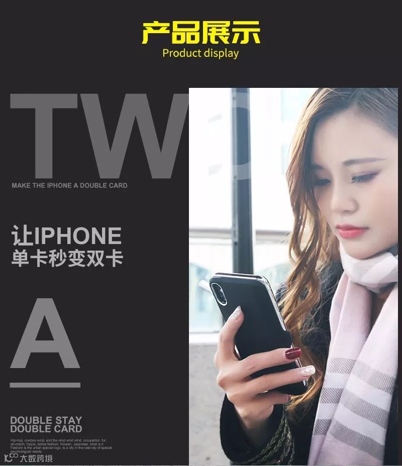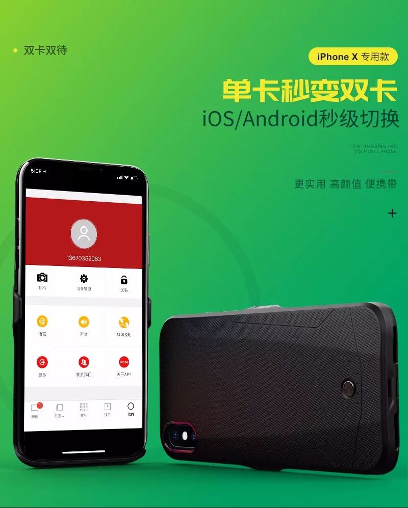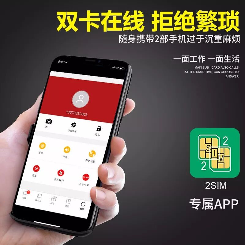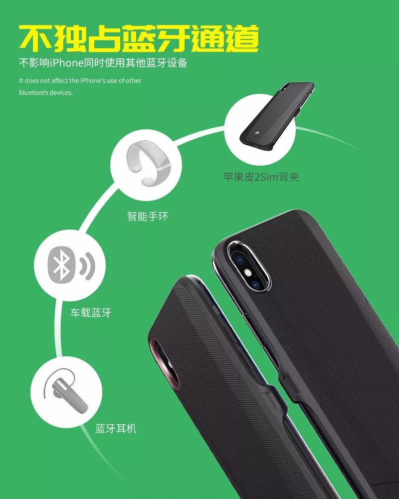 还在为手机配件市场淡季无爆款而发慌发愁吗?最新爆料:能让iPhone单卡变双卡双待“超薄隐形背夹智能苹果皮2SIM”来拯救淡的手机季配件市场啦,无需古老的越狱方式,无需剪卡引排线等繁杂操作就可轻松实现让iPhone双卡双待,不是骗人的双卡单带,是双待同时在线,还在为每天携带两个手机而烦恼吗?还在天天看着新闻爆料下一代iPhone是双卡而期待吗?很多果粉以往的遗憾叹到“iPhone虽好但是是单卡”敬爱果粉们,不用长久的期盼,现此刻告诉你好消息!!!,想iPhone双卡,2SIM让你从此刻开始,历经500天奋力研发,我们终于解决果粉此遗憾,在苹果应用商店APP Store直接下载"2SIM"APP配合2SIM超薄背夹即可实现让iPhone双卡双待,“她是一款能让苹果双卡双待的神奇,她是超薄iPhone背夹充电宝,她是隐形手机保护壳”。你还在等什么?赶紧入手抢货吧!相信有眼光的你,商机不可失,失而不来!2SIM期待你的体验!(注:有支持适合iPhone6、7、8、X所有机型型号)