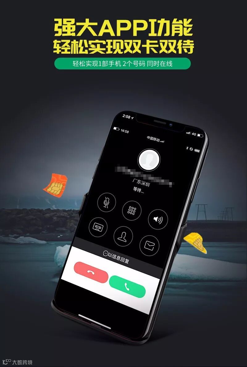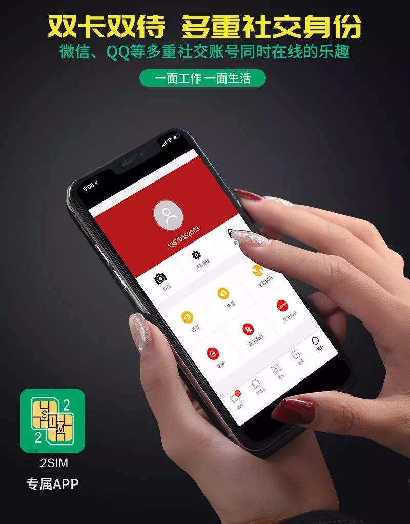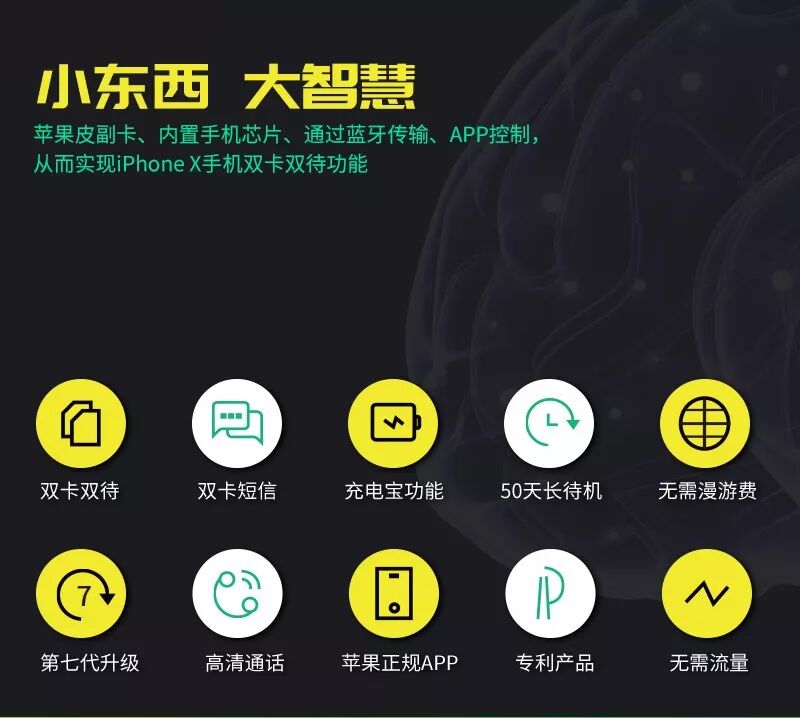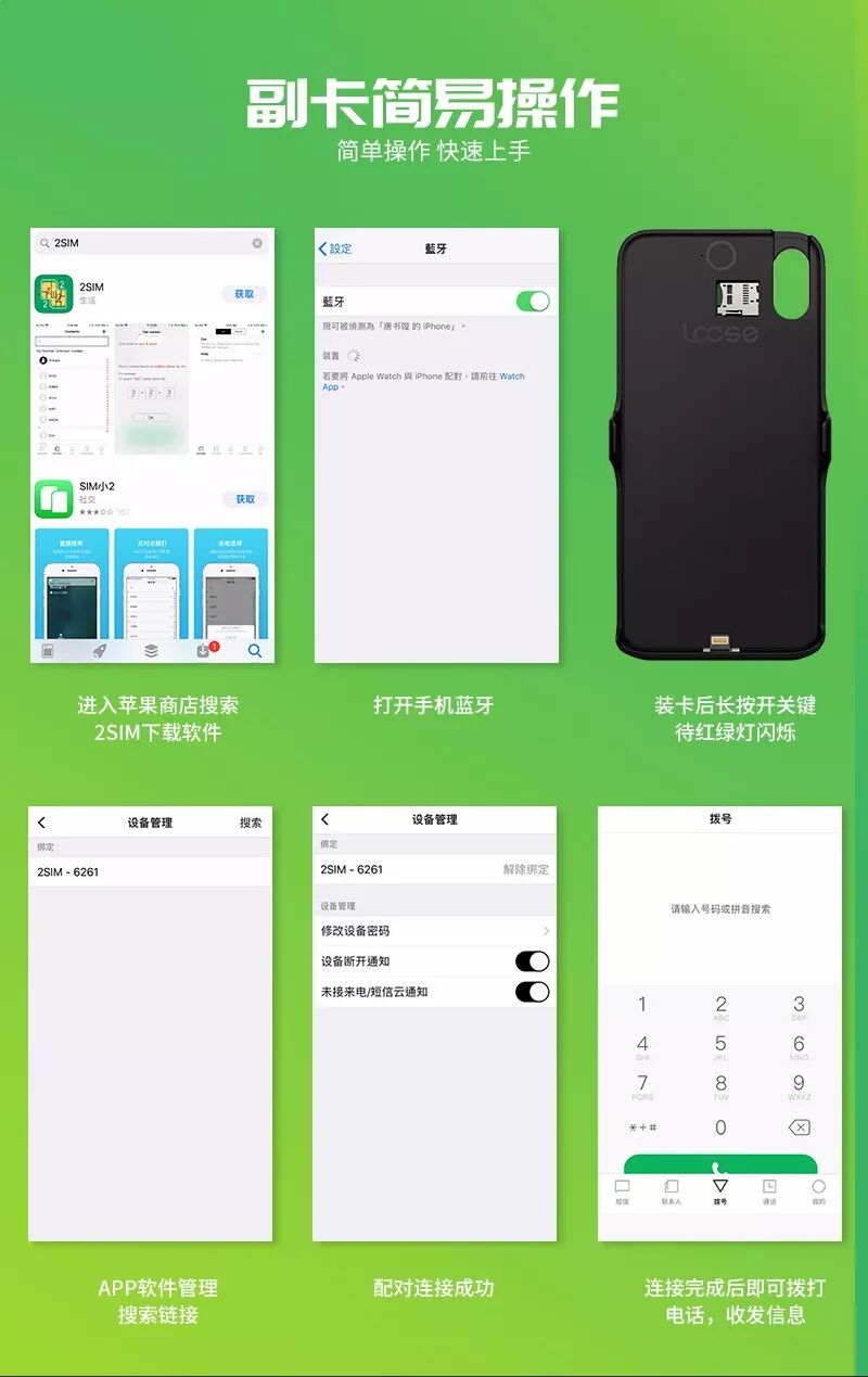 还在为手机配件市场淡季无爆款而发慌发愁吗?最新爆料:能让iPhone单卡变双卡双待“超薄隐形背夹智能苹果皮2SIM”来拯救淡的手机季配件市场啦,无需古老的越狱方式,无需剪卡引排线等繁杂操作就可轻松实现让iPhone双卡双待,不是骗人的双卡单带,是双待同时在线,还在为每天携带两个手机而烦恼吗?还在天天看着新闻爆料下一代iPhone是双卡而期待吗?很多果粉以往的遗憾叹到“iPhone虽好但是是单卡”敬爱果粉们,不用长久的期盼,现此刻告诉你好消息!!!,想iPhone双卡,2SIM让你从此刻开始,历经500天奋力研发,我们终于解决果粉此遗憾,在苹果应用商店APP Store直接下载"2SIM"APP配合2SIM超薄背夹即可实现让iPhone双卡双待,“她是一款能让苹果双卡双待的神奇,她是超薄iPhone背夹充电宝,她是隐形手机保护壳”。你还在等什么?赶紧入手抢货吧!相信有眼光的你,商机不可失,失而不来!2SIM期待你的体验!(注:有支持适合iPhone6、7、8、X所有机型型号)