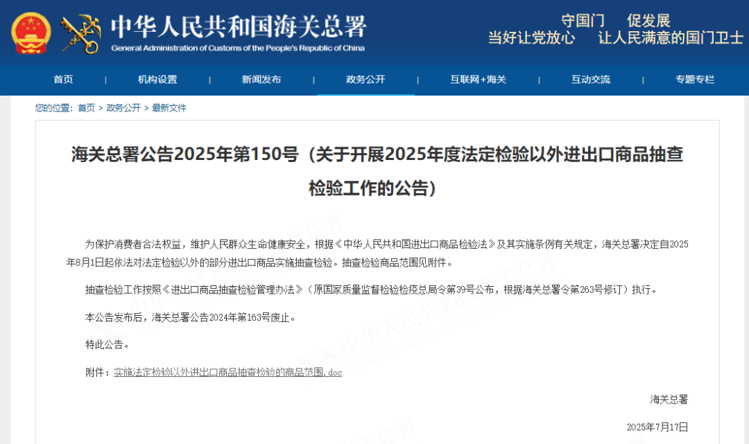 海关总署决定自2025年8月1日起依法对法定检验以外的部分进出口商品实施抽查检验。