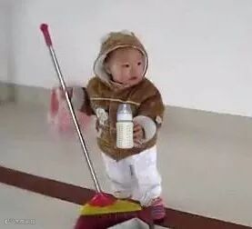 比如有个萌宝看到妈妈在打扫房间,想帮妈妈的忙,便咻的一下跑进了厨房,拿着扫把想扫地。奶爸把兑好的牛奶拿过来给萌宝喝。只见萌宝一手拿着扫把,一手接过奶瓶虎视眈眈的看着他的爸爸。像是在说“不准抢我的扫把”,对扫把简直“情有独钟”啊!