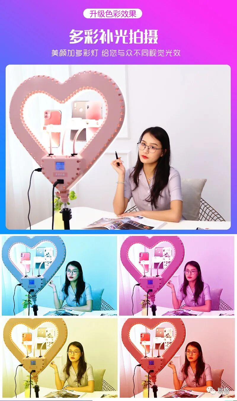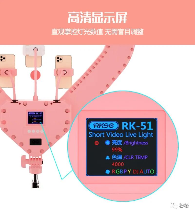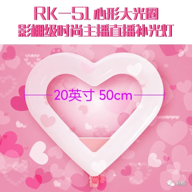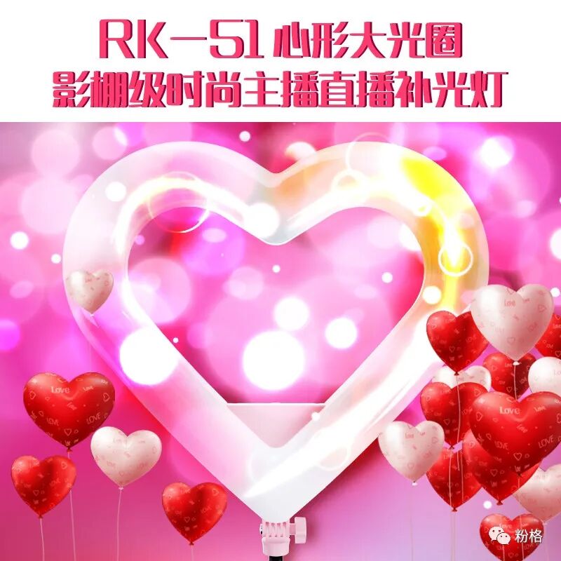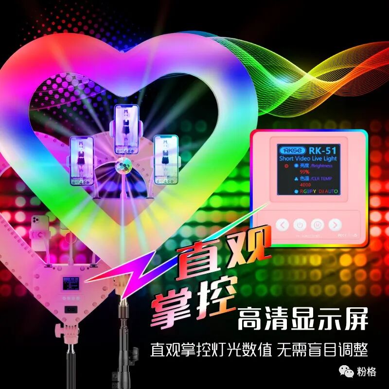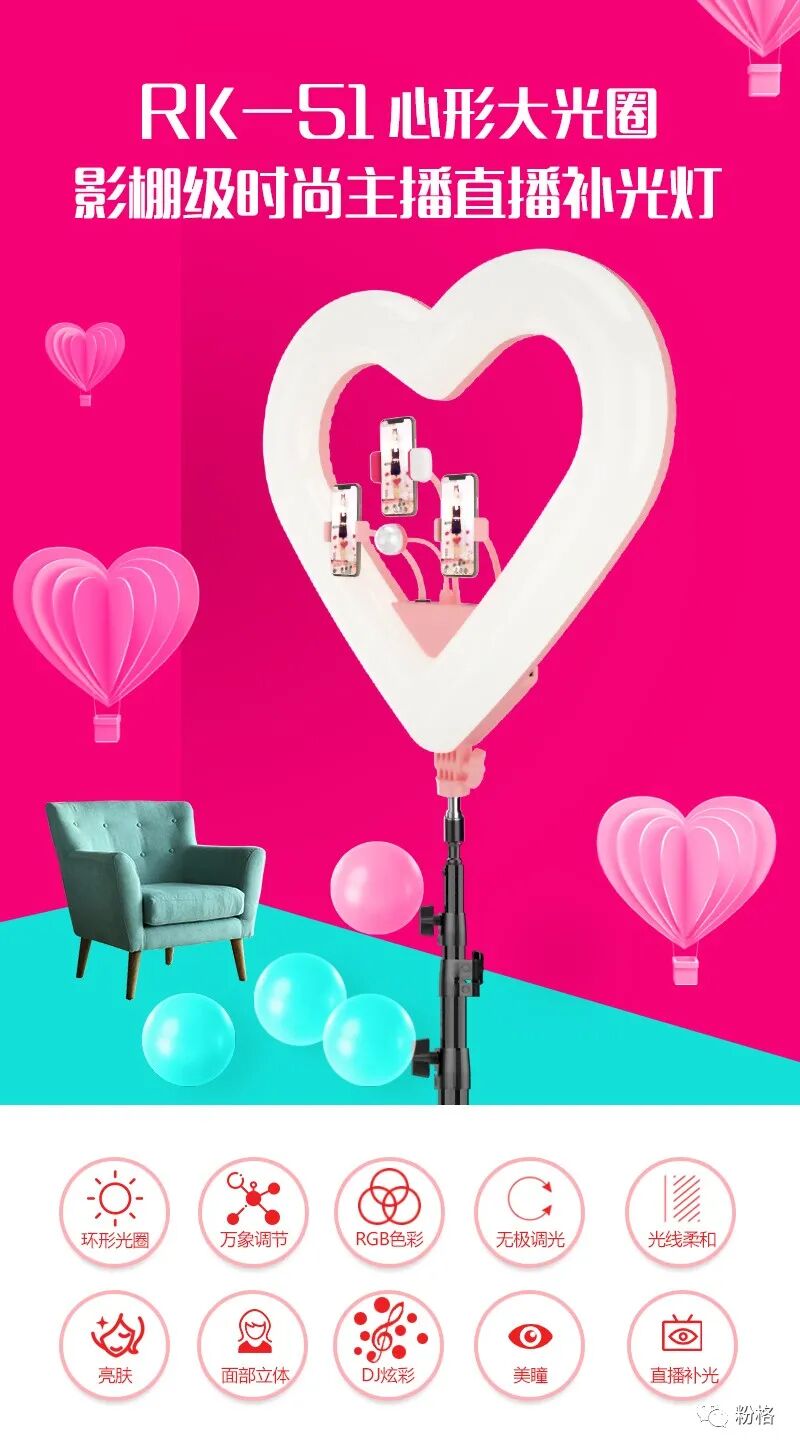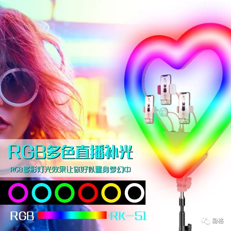 20寸心形大光圈影棚级时尚主播直播补光灯RK51是一款针对自媒体主播直播、在线教育、新媒体直播培训、私人DJ炫彩跳舞直播娱乐、MCN带货机构、广告拍摄、网络直播录制厅、微电影短剧拍摄、化妆教学录制、人像静物拍摄补光等设计的影棚级特大RGB(白、黄、红、绿、蓝、紫,自然光等)多色直播补光灯,心形——可爱清新有爱心的萌女偏爱造型,一体式多机位多手机同时在线直播,RGB多彩灯光效果,打开RK50的DJ炫彩自动模式时,就可轻松将酒吧DJ炫彩氛围灯光效果直接搬致您自己的直播室,声控功能让炫彩多色灯光随着音乐旋律与音量大小爆闪舞动起来,DJ跳舞直播嗨翻天,迅速增粉,让您瞬间变网红。
