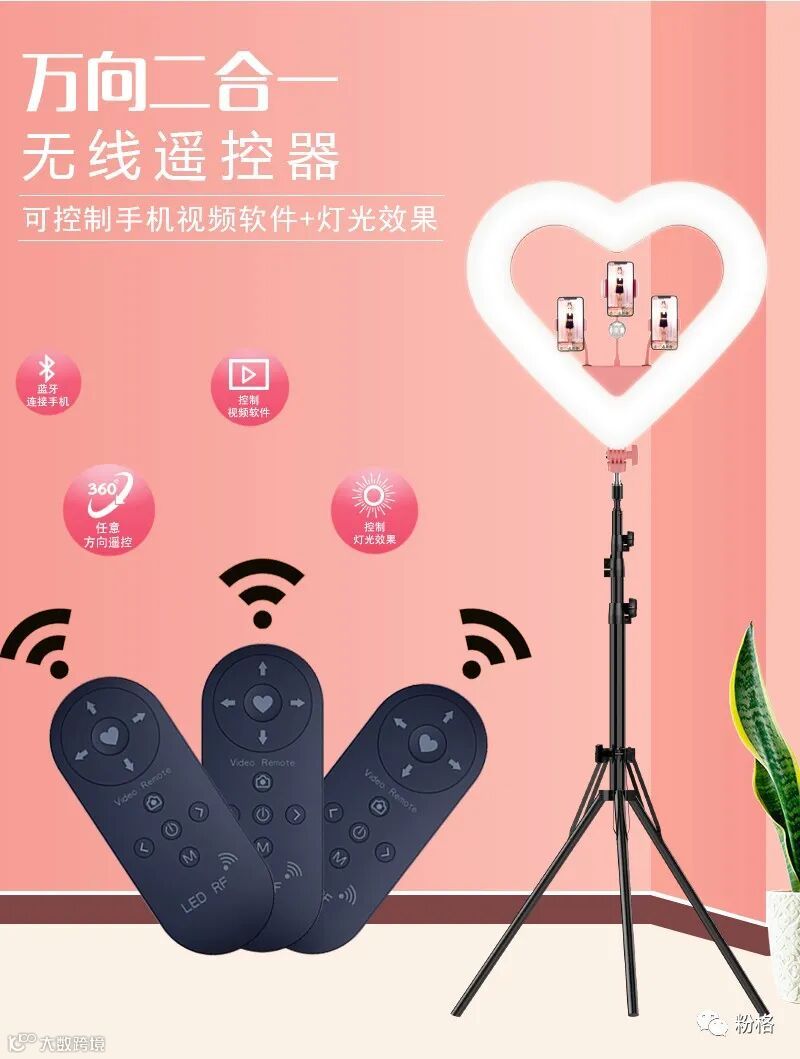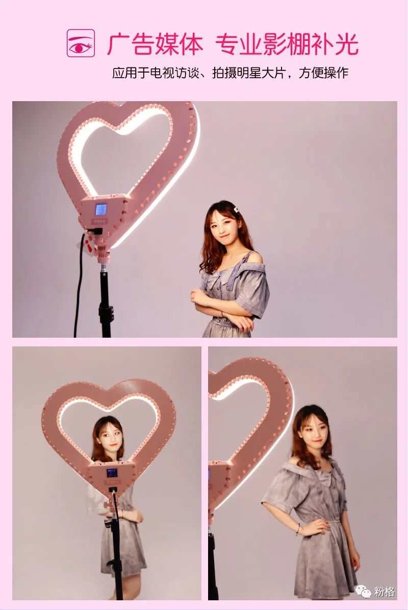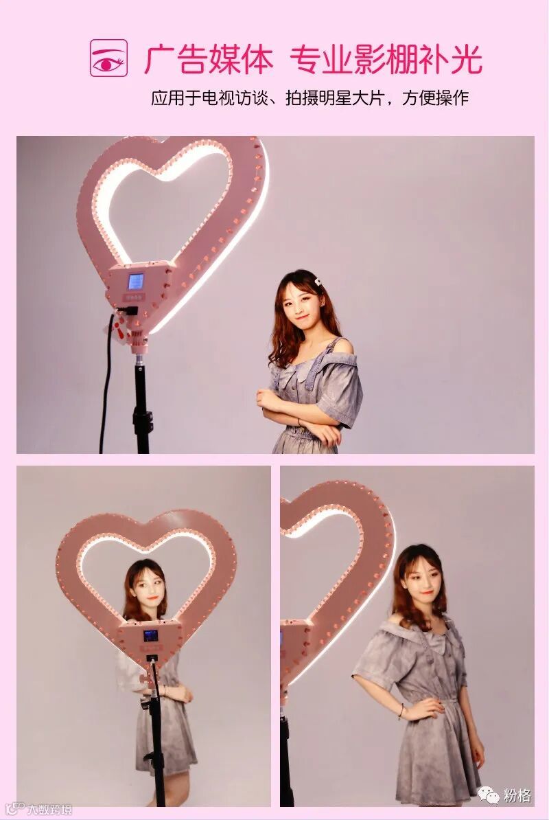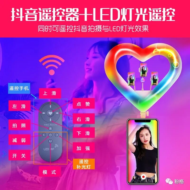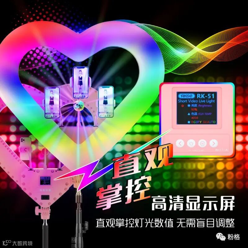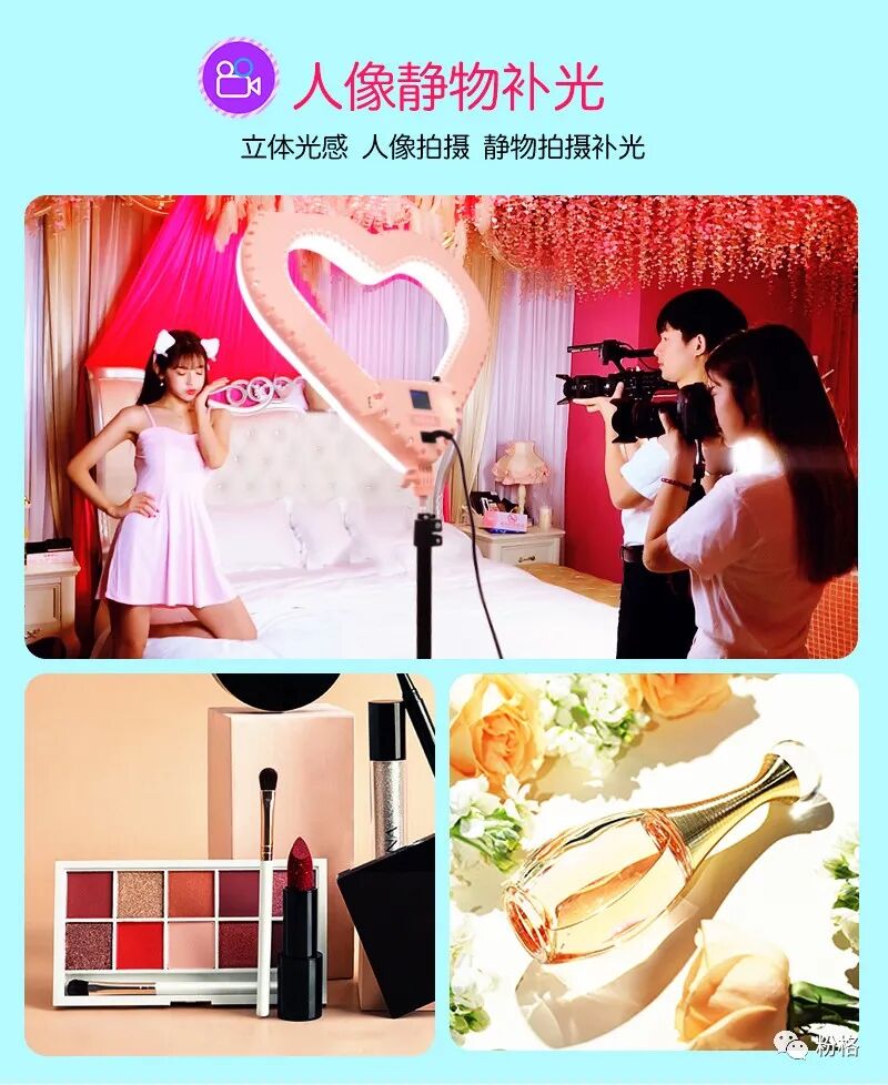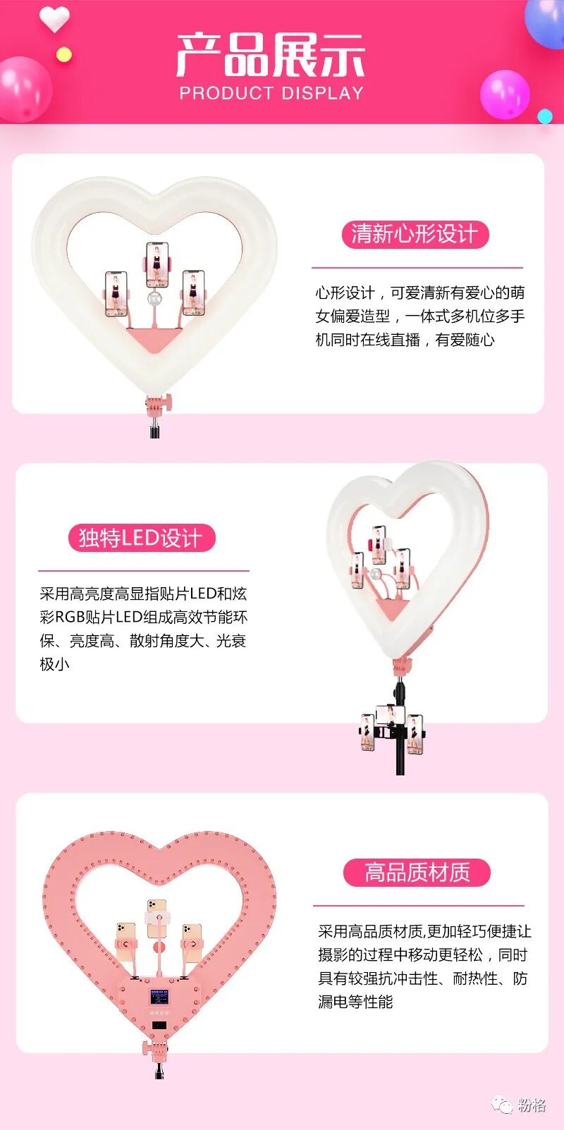 20寸心形大光圈影棚级时尚主播直播补光灯RK51是一款针对自媒体主播直播、在线教育、新媒体直播培训、私人DJ炫彩跳舞直播娱乐、MCN带货机构、广告拍摄、网络直播录制厅、微电影短剧拍摄、化妆教学录制、人像静物拍摄补光等设计的影棚级特大RGB(白、黄、红、绿、蓝、紫,自然光等)多色直播补光灯,心形——可爱清新有爱心的萌女偏爱造型,一体式多机位多手机同时在线直播,RGB多彩灯光效果,打开RK50的DJ炫彩自动模式时,就可轻松将酒吧DJ炫彩氛围灯光效果直接搬致您自己的直播室,声控功能让炫彩多色灯光随着音乐旋律与音量大小爆闪舞动起来,DJ跳舞直播嗨翻天,迅速增粉,让您瞬间变网红。