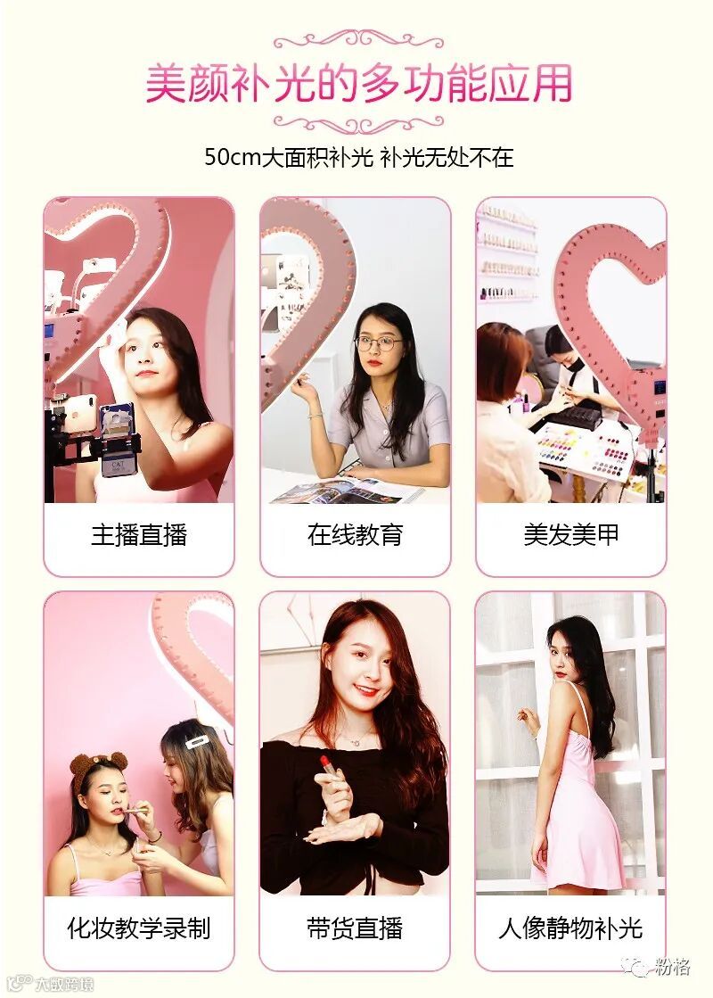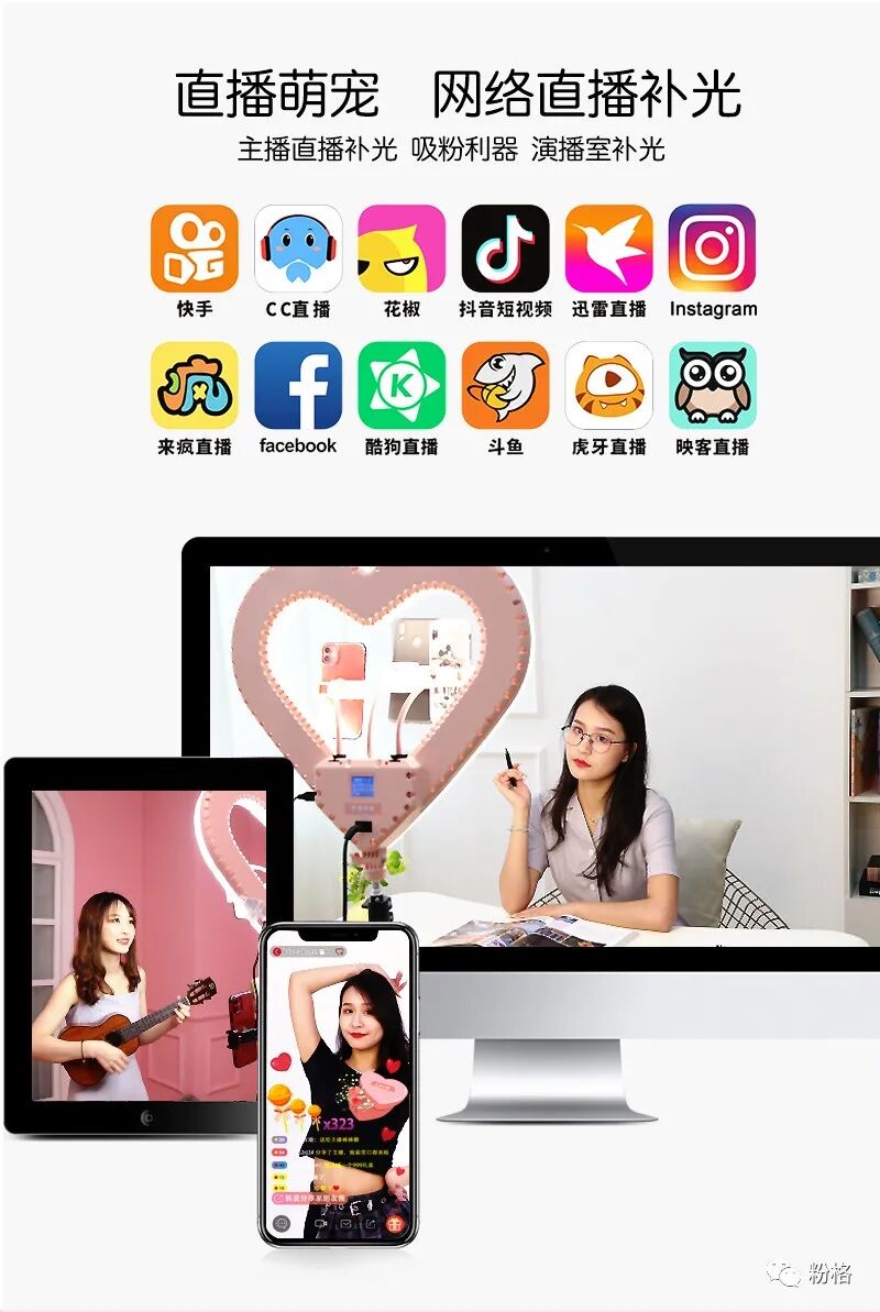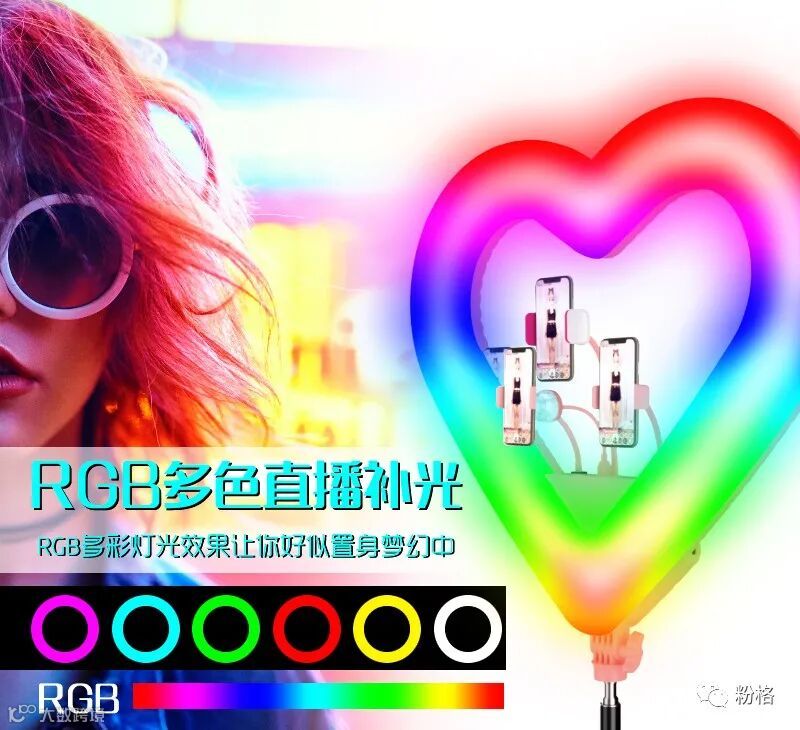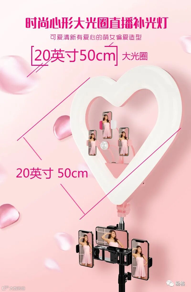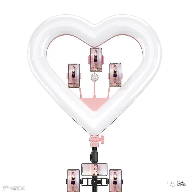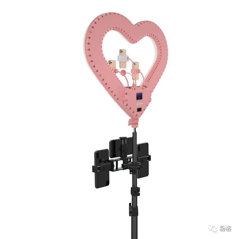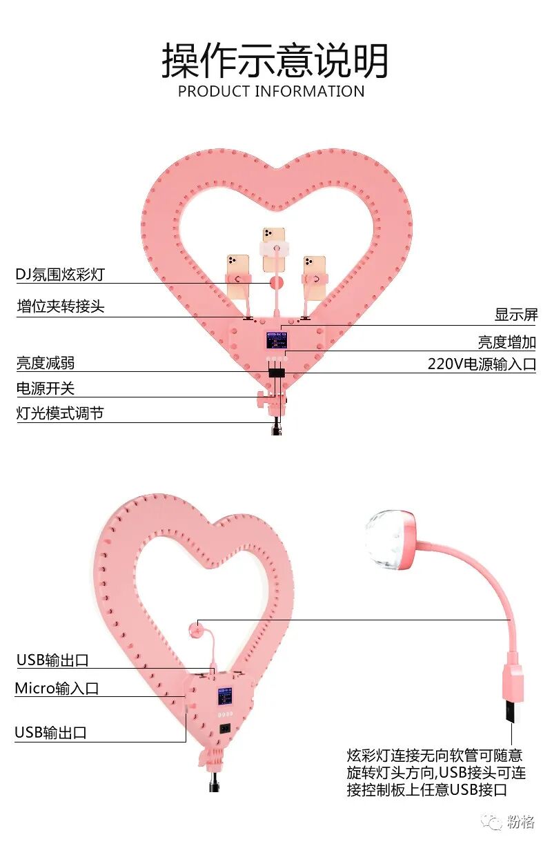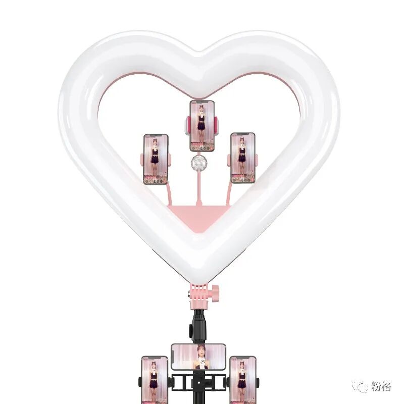 20寸心形大光圈影棚级时尚主播直播补光灯RK51是一款针对自媒体主播直播、在线教育、新媒体直播培训、私人DJ炫彩跳舞直播娱乐、MCN带货机构、广告拍摄、网络直播录制厅、微电影短剧拍摄、化妆教学录制、人像静物拍摄补光等设计的影棚级特大RGB(白、黄、红、绿、蓝、紫,自然光等)多色直播补光灯,心形——可爱清新有爱心的萌女偏爱造型,一体式多机位多手机同时在线直播,RGB多彩灯光效果,打开RK50的DJ炫彩自动模式时,就可轻松将酒吧DJ炫彩氛围灯光效果直接搬致您自己的直播室,声控功能让炫彩多色灯光随着音乐旋律与音量大小爆闪舞动起来,DJ跳舞直播嗨翻天,迅速增粉,让您瞬间变网红。
