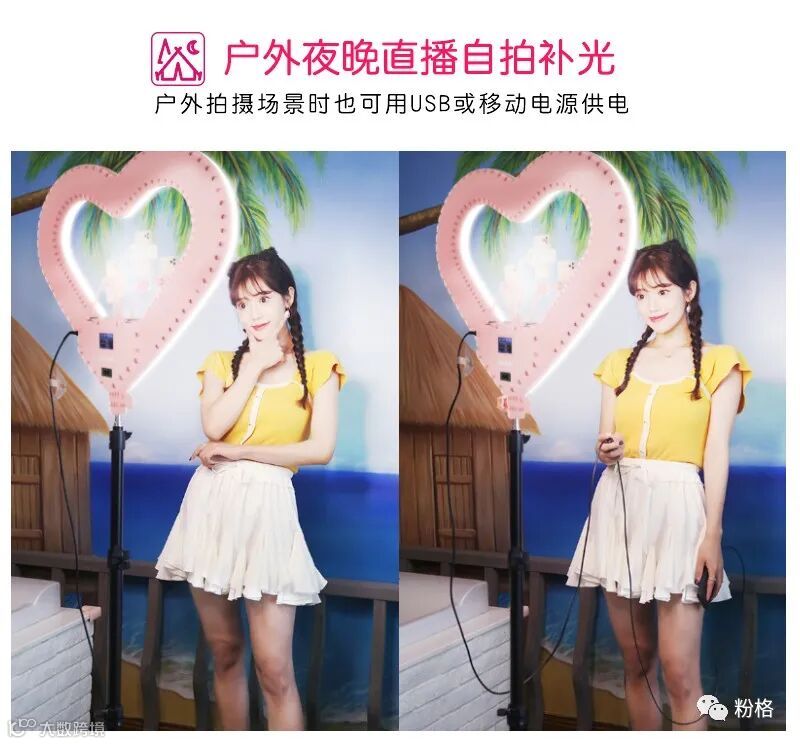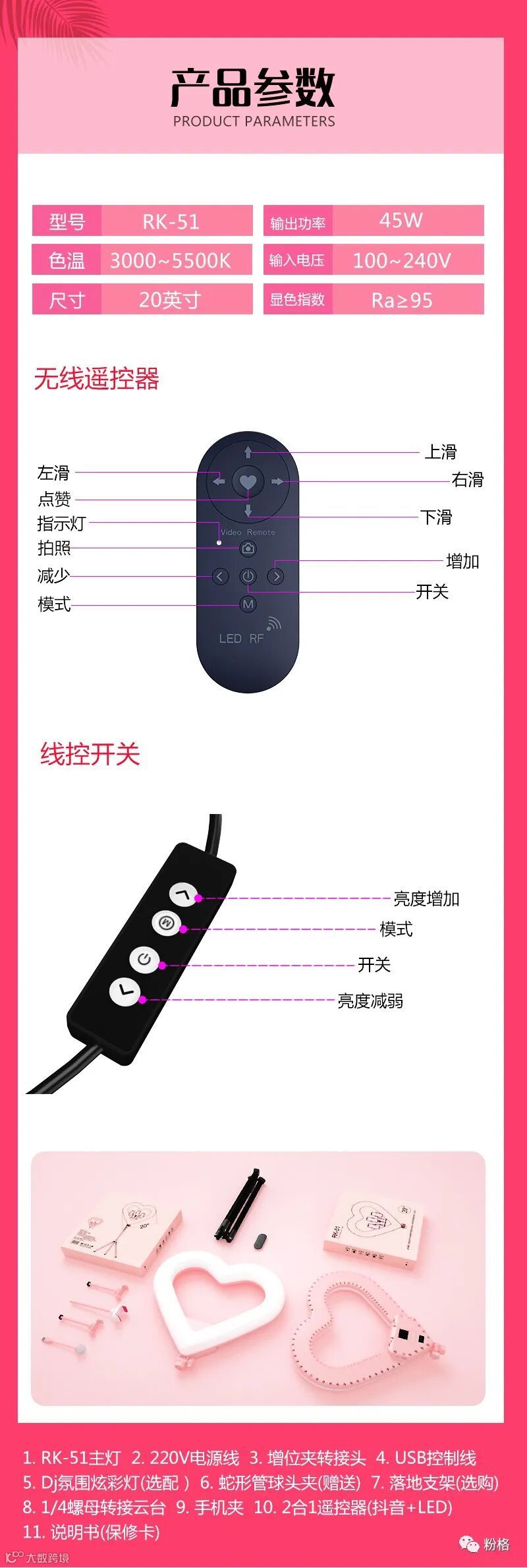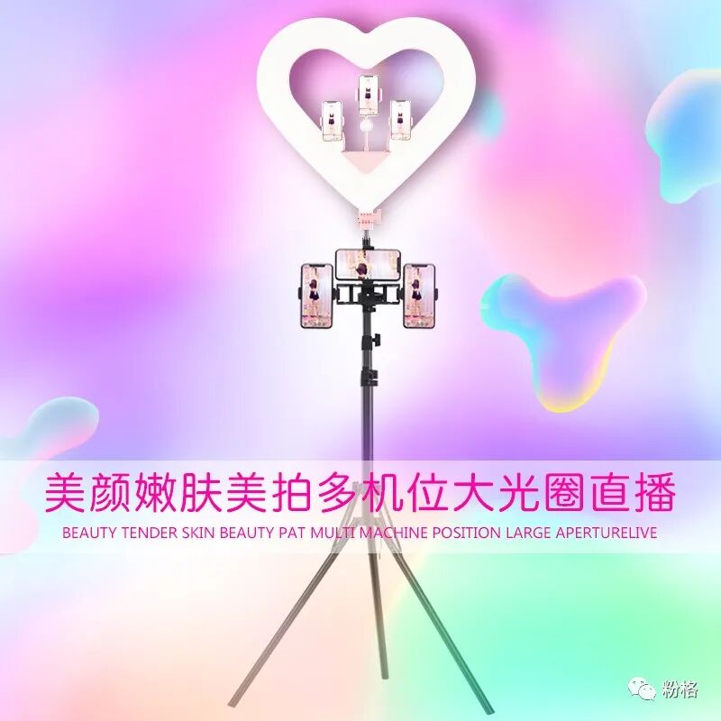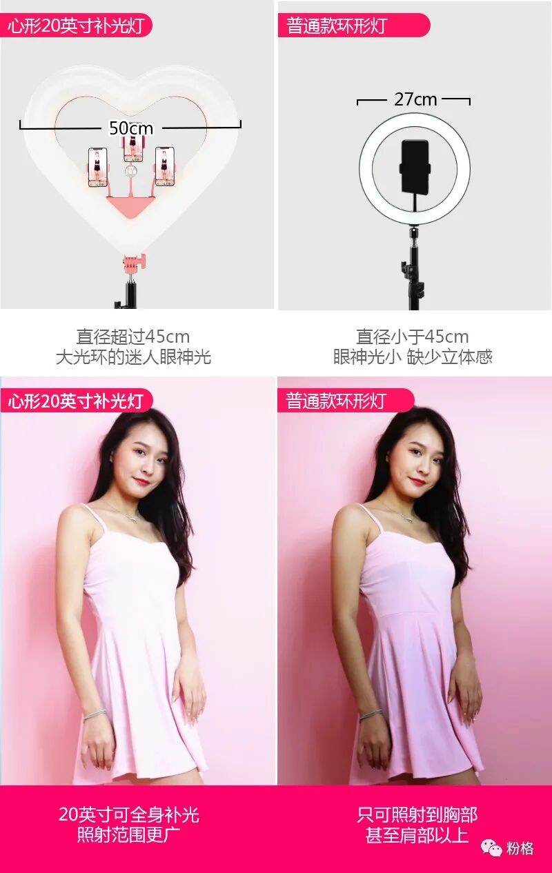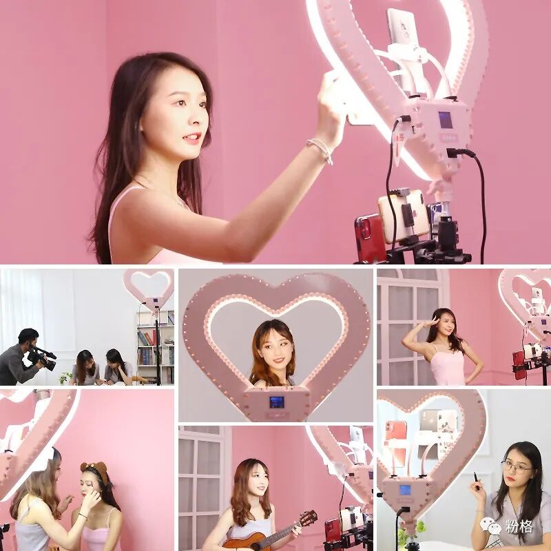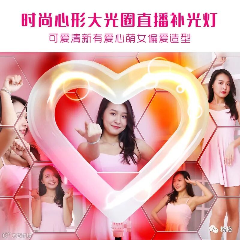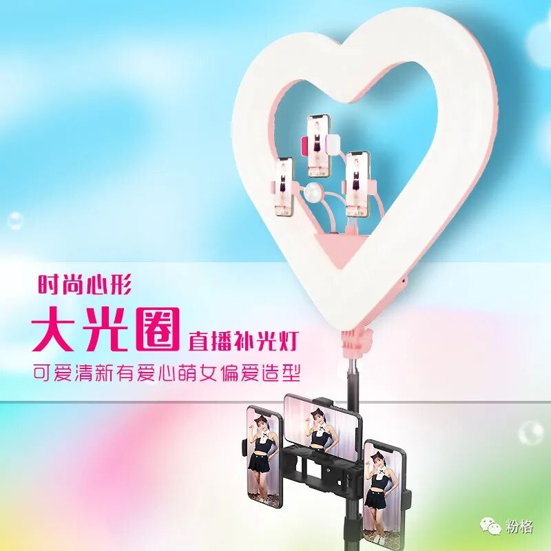 20寸心形大光圈影棚级时尚主播直播补光灯RK51是一款针对自媒体主播直播、在线教育、新媒体直播培训、私人DJ炫彩跳舞直播娱乐、MCN带货机构、广告拍摄、网络直播录制厅、微电影短剧拍摄、化妆教学录制、人像静物拍摄补光等设计的影棚级特大RGB(白、黄、红、绿、蓝、紫,自然光等)多色直播补光灯,心形——可爱清新有爱心的萌女偏爱造型,一体式多机位多手机同时在线直播,RGB多彩灯光效果,打开RK50的DJ炫彩自动模式时,就可轻松将酒吧DJ炫彩氛围灯光效果直接搬致您自己的直播室,声控功能让炫彩多色灯光随着音乐旋律与音量大小爆闪舞动起来,DJ跳舞直播嗨翻天,迅速增粉,让您瞬间变网红。