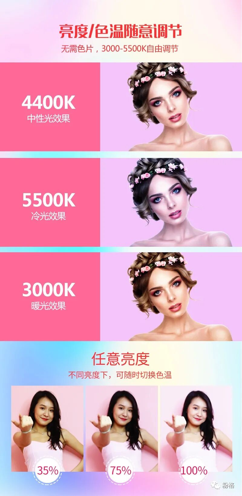 20寸的RK51将传统黄白光普通冷暖灯光效果升级至摄影棚级的多彩色灯光效果,拥有摄影棚级的RGB色温亮度显示屏,让主播与摄影师直观的掌控拍摄灯光数值。万向无线遥控器可同时遥控控制各种直播拍摄软件及各种灯光效果,让抖音遥控器与灯光控制遥控器合二为一,让您使用更加便携简单。RK51可直用家用插座220伏供电,在无电源插座接入的户外拍摄场景时也可用USB或移动电源供电,家用电源接入模式与USB供电模式都可通过线控与遥控器开关来同时控制灯光组件的亮度、色温、模式,自带双USB输出可供手机充电,这么多实用的功能,迅速增粉成为网红的你,赶快购买吧!