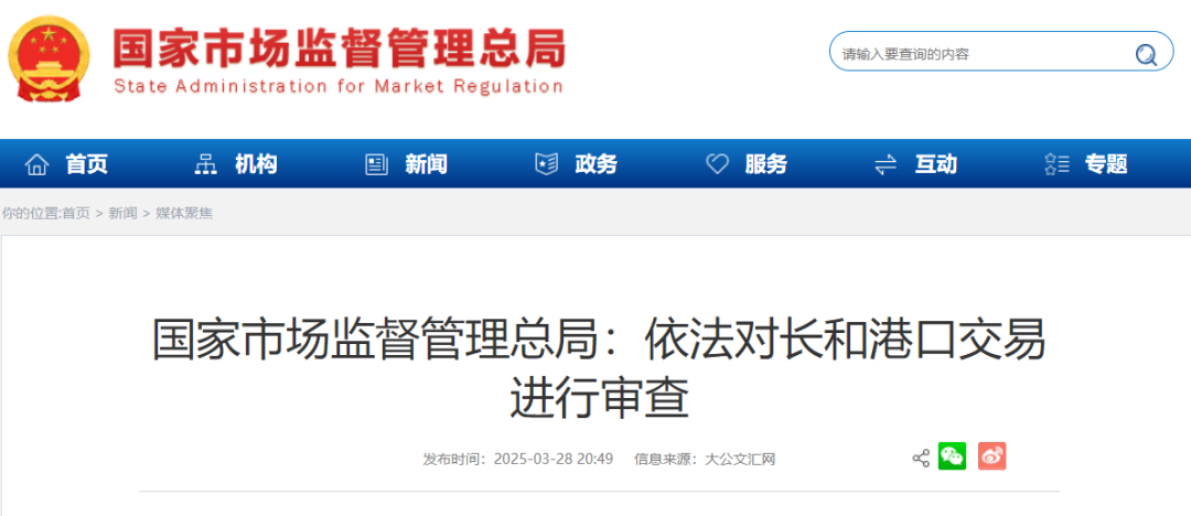 3月28日,大公文汇全媒体记者就“长和拟售巴拿马港口”一事,向国家市场监督管理总局提问,获该局回应。
