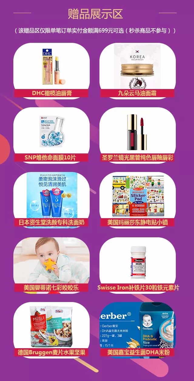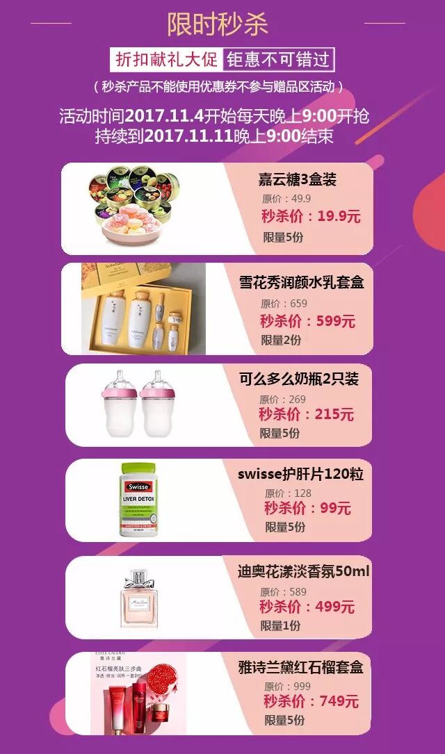 参与“11.11”活动扫描下方二维码加关注,全场商品除了限时秒杀商品不参与活动外,其他商品均是全场满199减20,满299减30,满699减50,单笔订单实付金额满699可在赠品区任选一款产品。